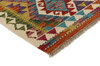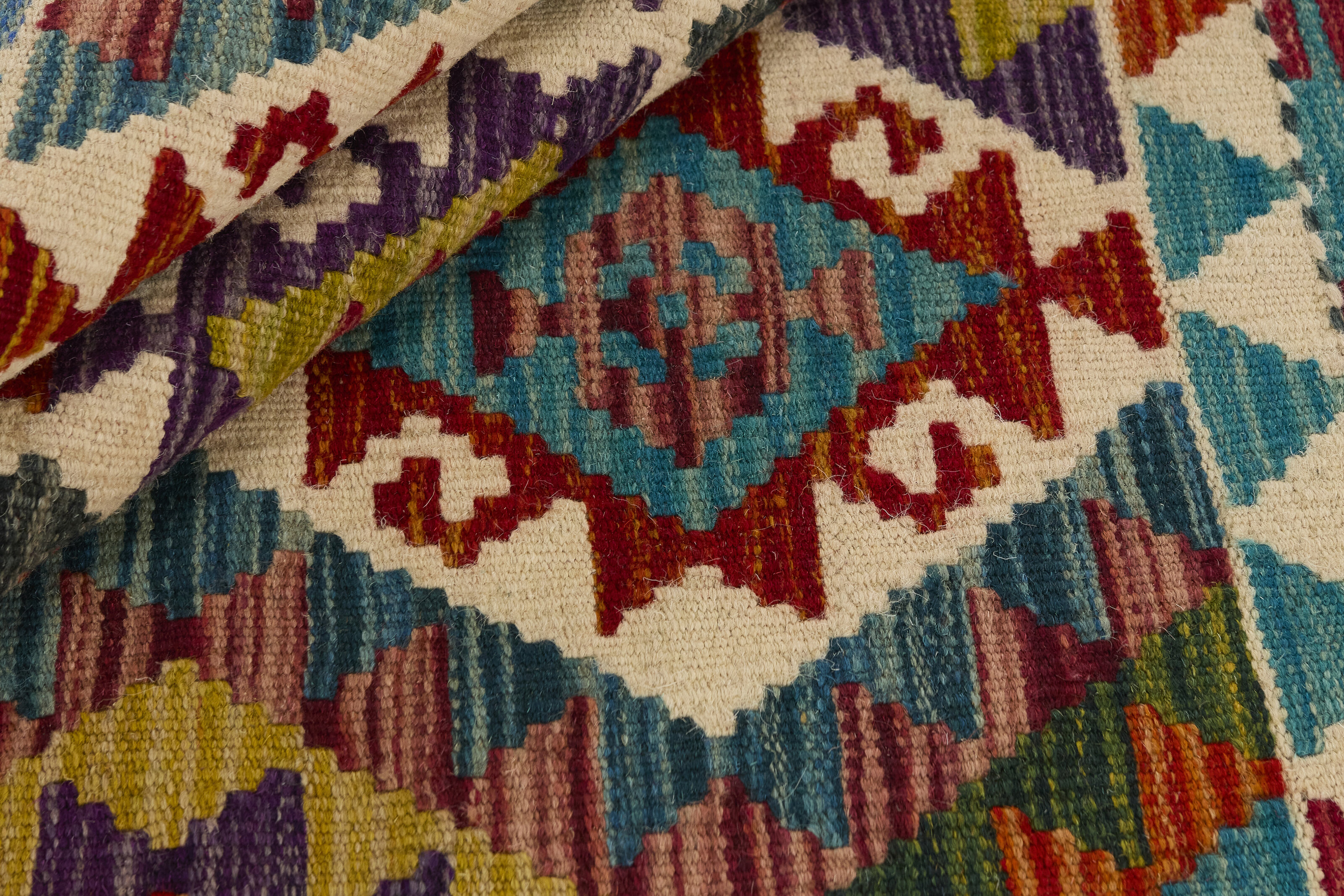 Afghan KelimItem no.: 1517389 Size: 101 cm x 98 cmAfghan Kelim rugs are hand woven by Turkmens in northern Afghanistan. Kelim is the name of a common Persian weave, but also of the technology used in the production. Kelims are primarily produced by nomads and are pile-less rugs, which are also used for bags, as wall decoration, or as curtains for tents. A natural colour scale with geometrical symbols and octagons is used.