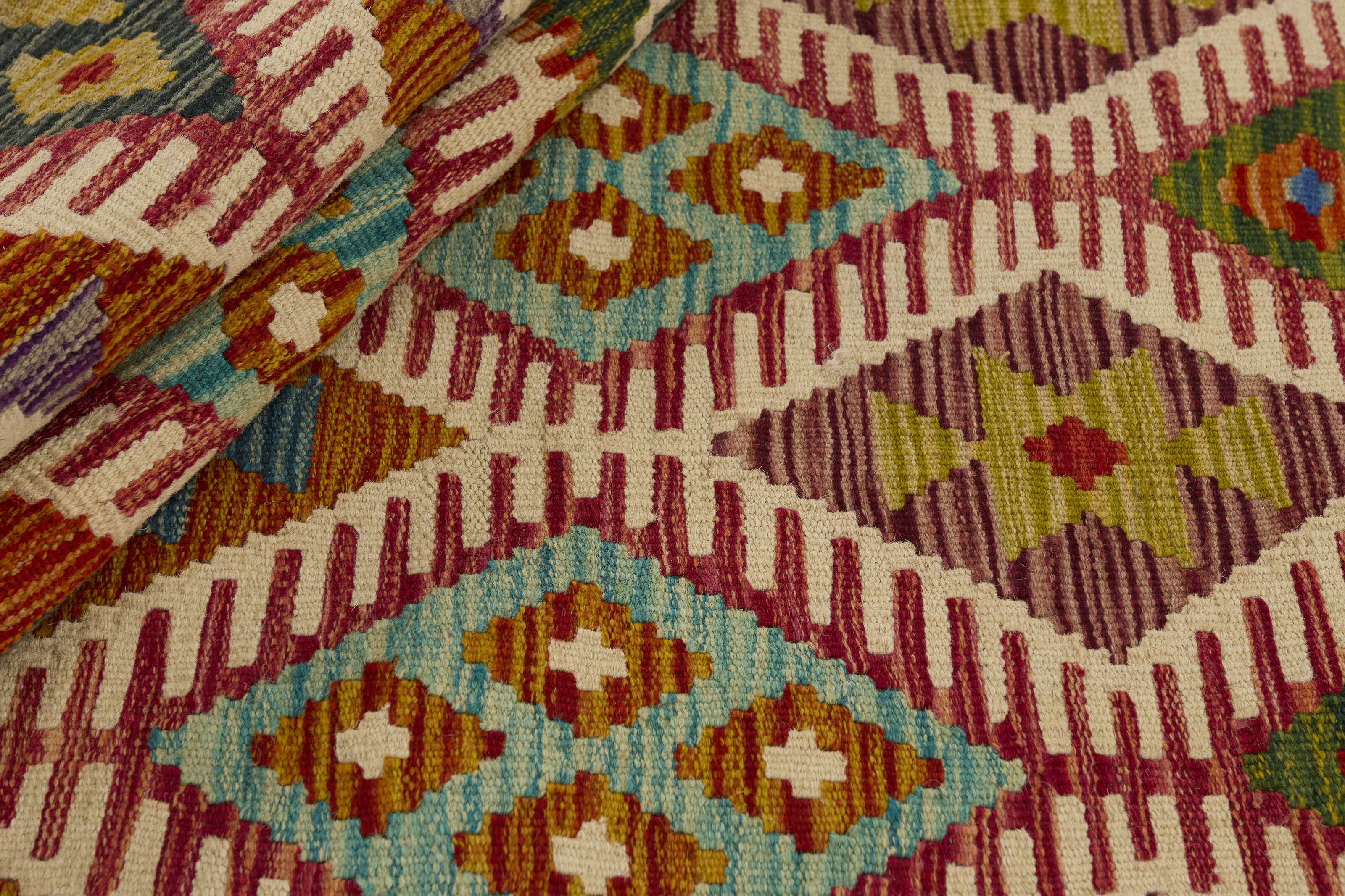 Afghan KelimItem no.: 1519045 Size: 80 cm x 303 cmAfghan Kelim rugs are hand woven by Turkmens in northern Afghanistan. Kelim is the name of a common Persian weave, but also of the technology used in the production. Kelims are primarily produced by nomads and are pile-less rugs, which are also used for bags, as wall decoration, or as curtains for tents. A natural colour scale with geometrical symbols and octagons is used.