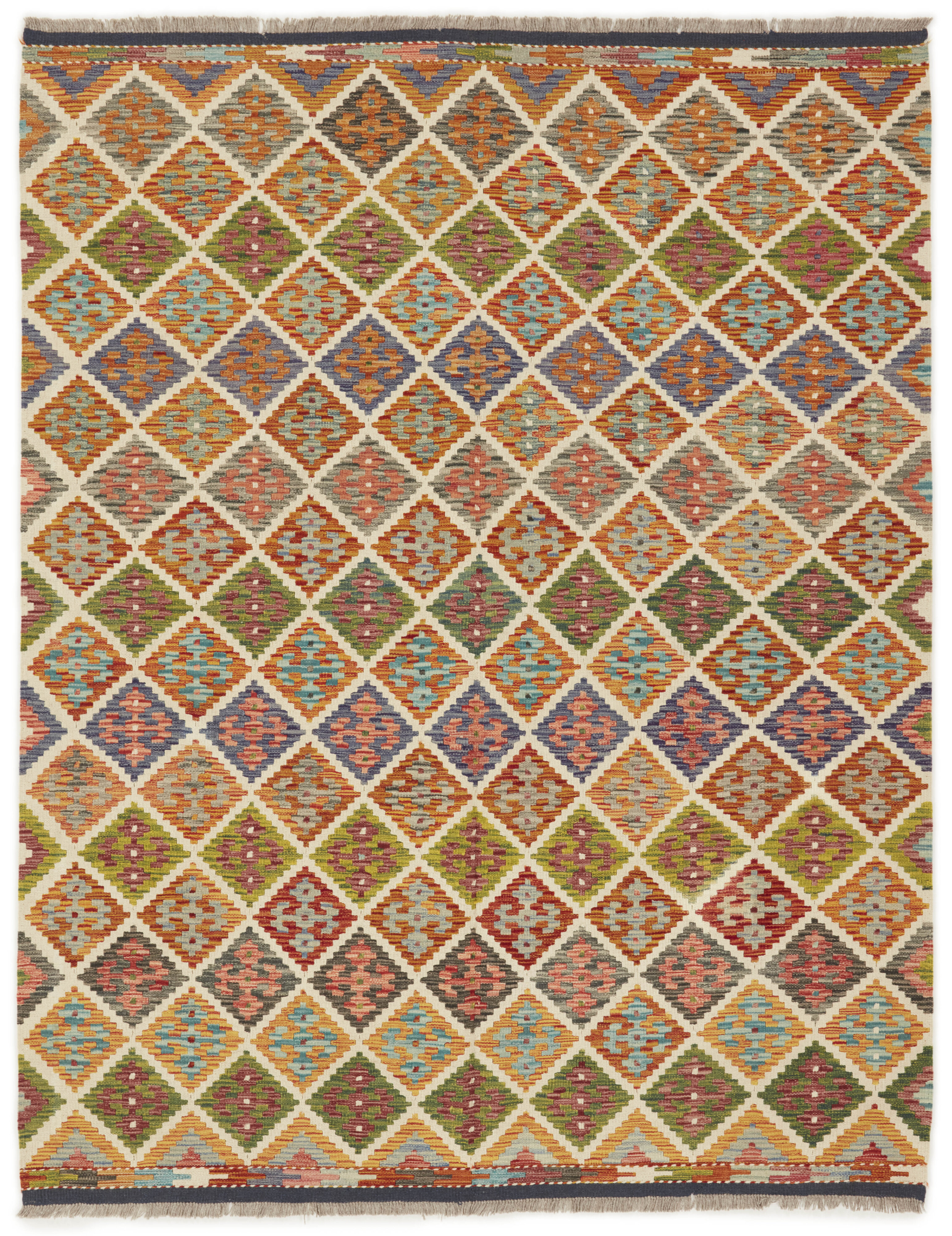 Afghan KelimItem no.: 1520296 Size: 189 cm x 242 cmAfghan Kelim rugs are hand woven by Turkmens in northern Afghanistan. Kelim is the name of a common Persian weave, but also of the technology used in the production. Kelims are primarily produced by nomads and are pile-less rugs, which are also used for bags, as wall decoration, or as curtains for tents. A natural colour scale with geometrical symbols and octagons is used.