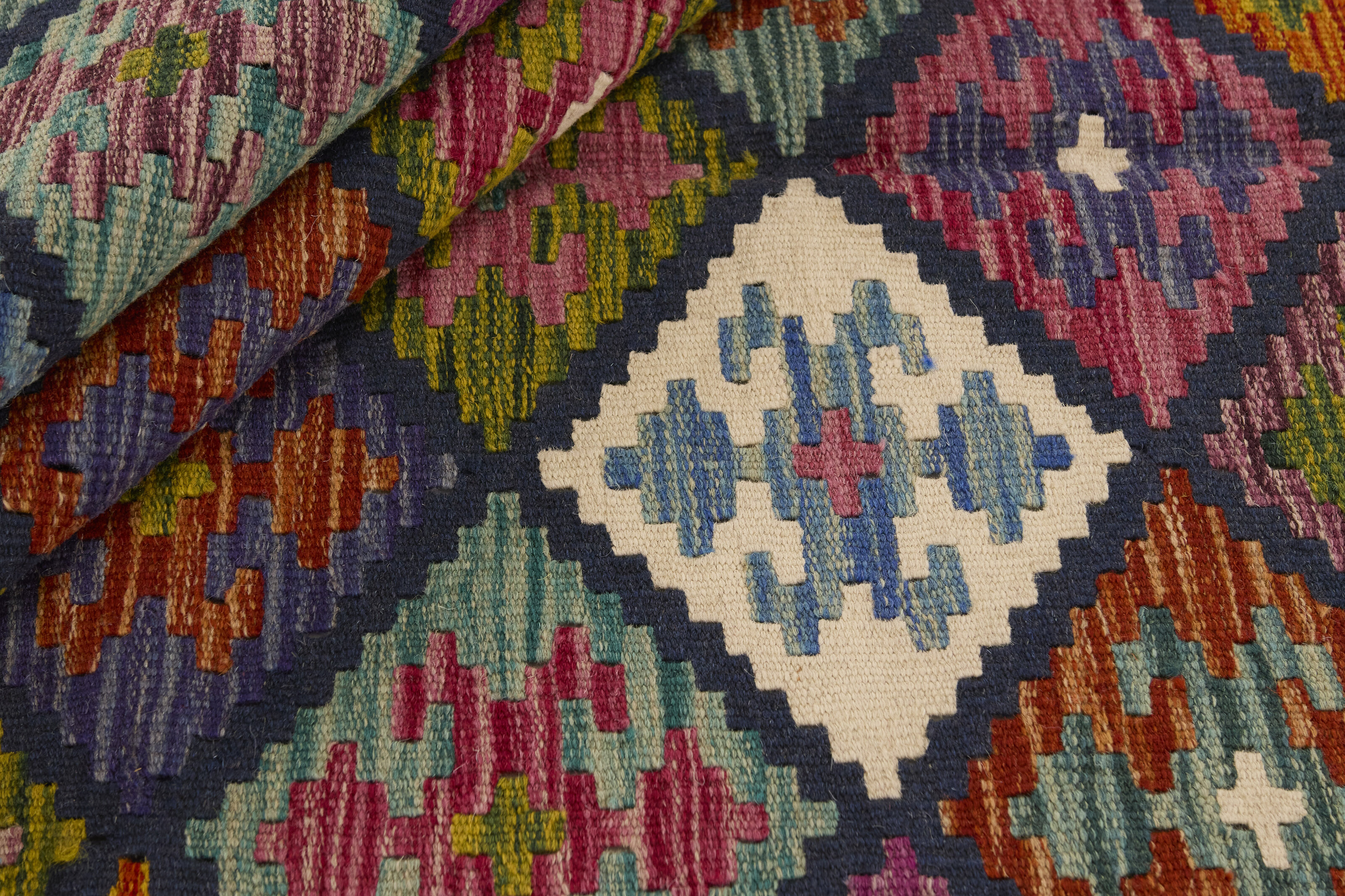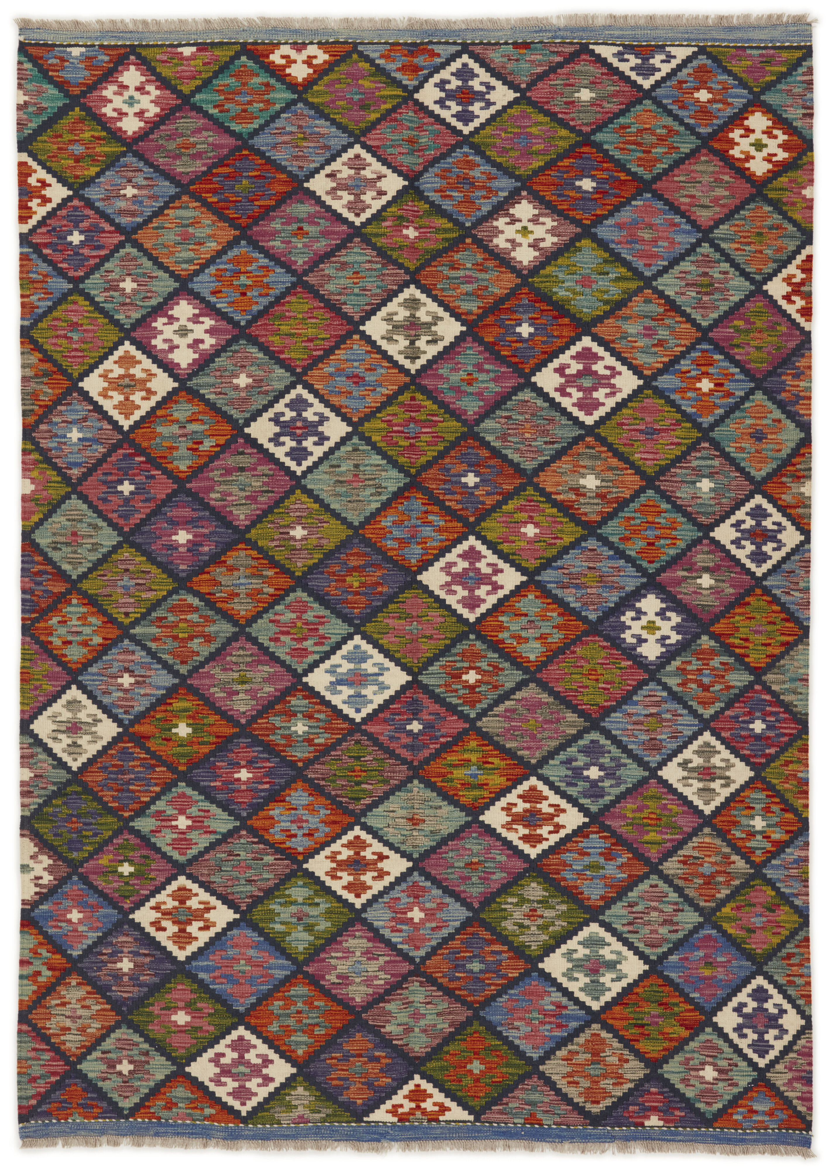 Afghan KelimItem no.: 1520316 Size: 175 cm x 244 cmAfghan Kelim rugs are hand woven by Turkmens in northern Afghanistan. Kelim is the name of a common Persian weave, but also of the technology used in the production. Kelims are primarily produced by nomads and are pile-less rugs, which are also used for bags, as wall decoration, or as curtains for tents. A natural colour scale with geometrical symbols and octagons is used.