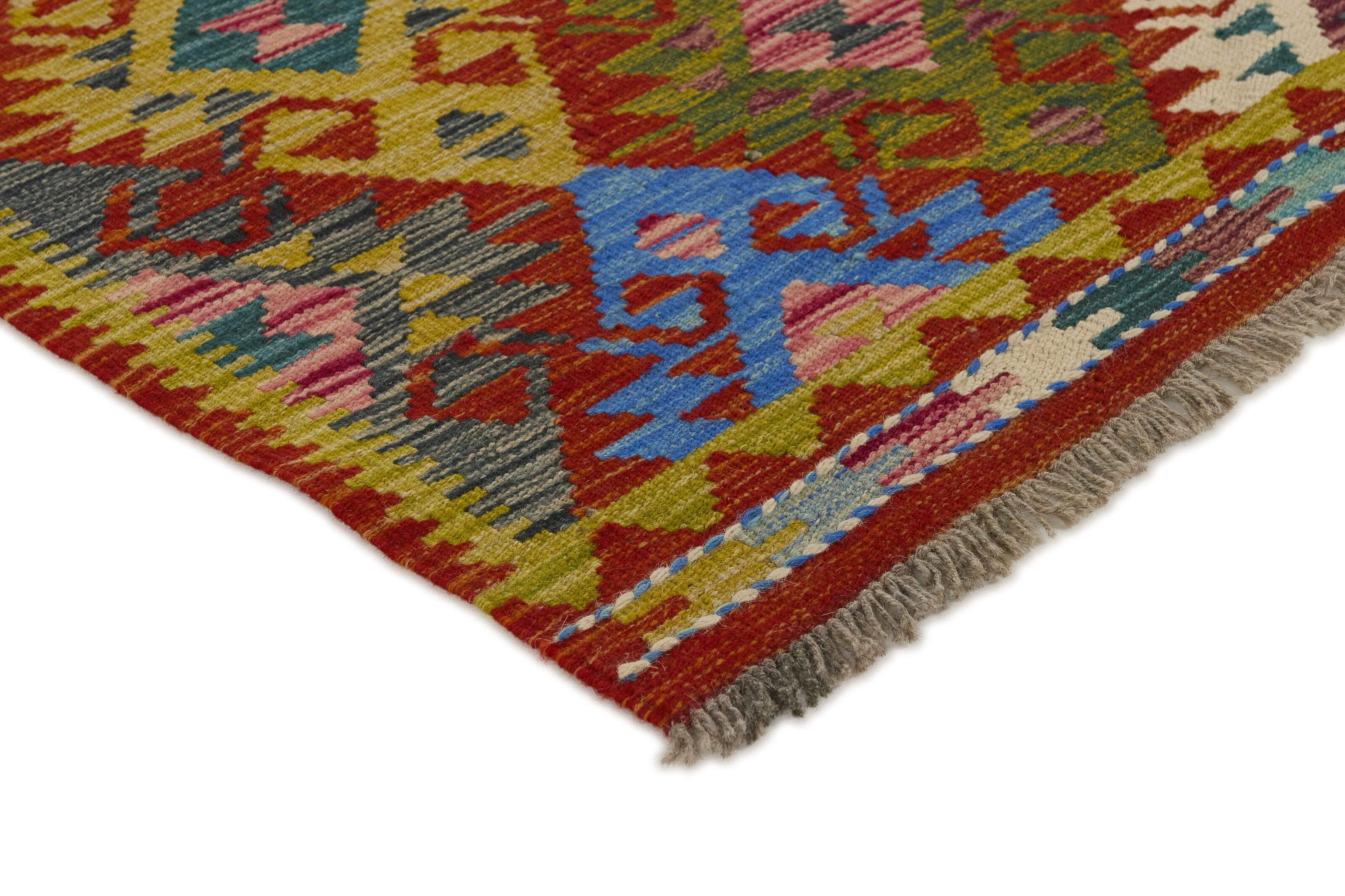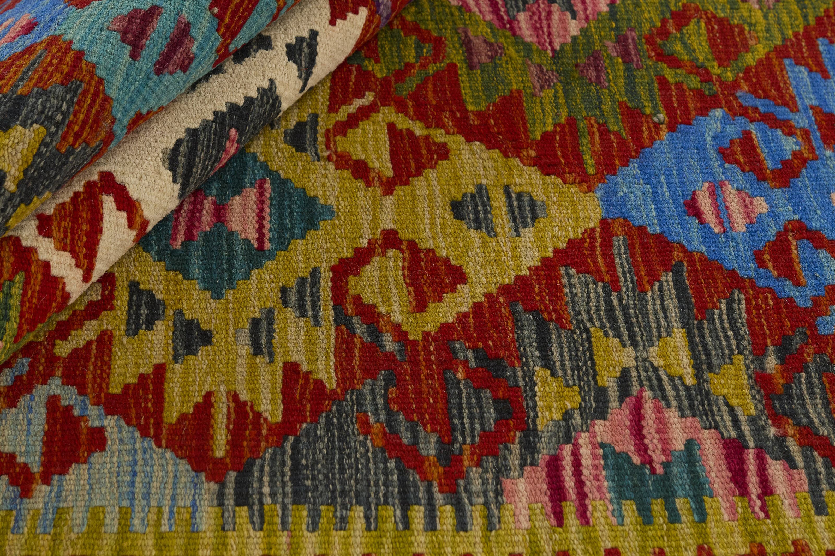 Afghan KelimItem no.: 1520459 Size: 83 cm x 130 cmAfghan Kelim rugs are hand woven by Turkmens in northern Afghanistan. Kelim is the name of a common Persian weave, but also of the technology used in the production. Kelims are primarily produced by nomads and are pile-less rugs, which are also used for bags, as wall decoration, or as curtains for tents. A natural colour scale with geometrical symbols and octagons is used.