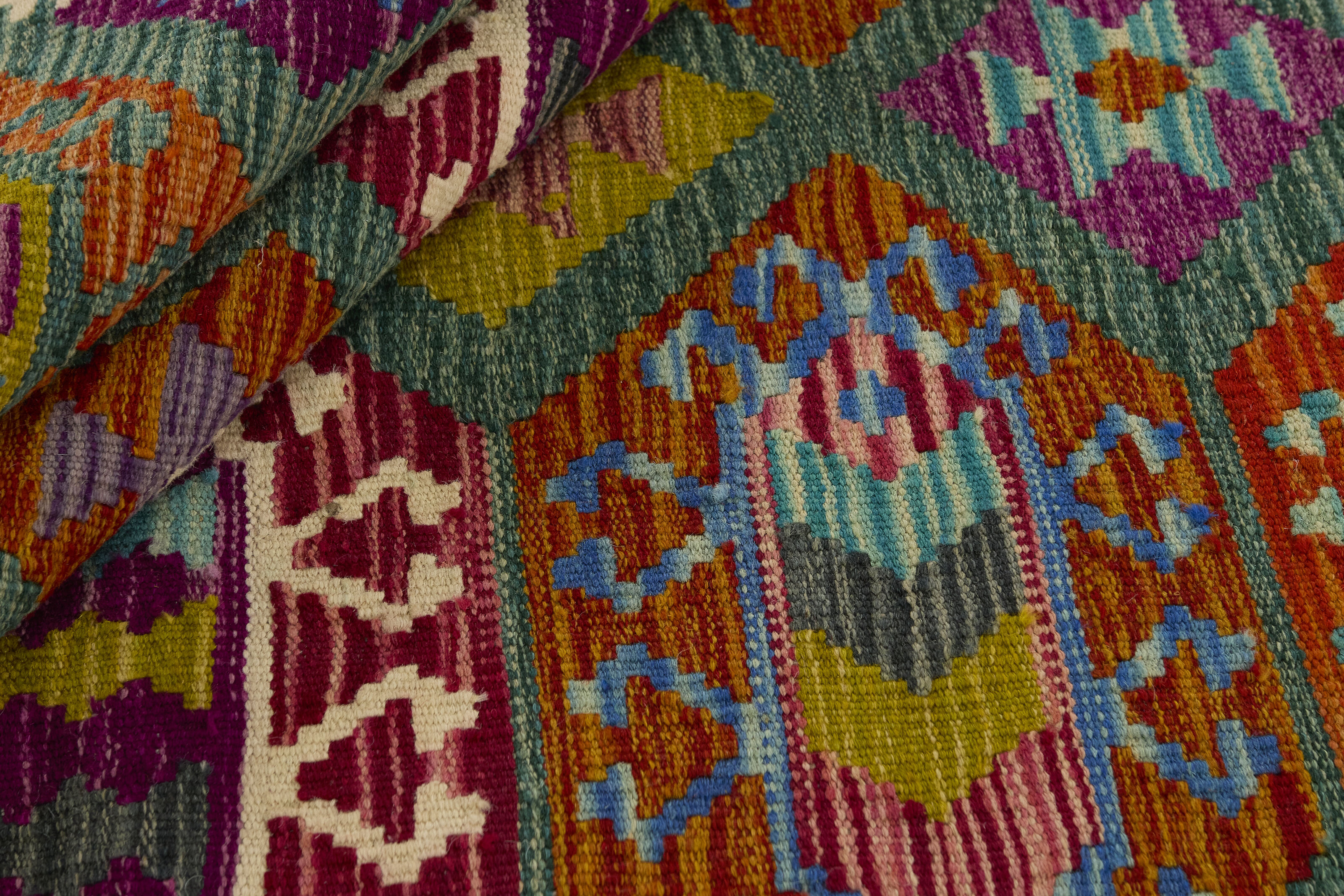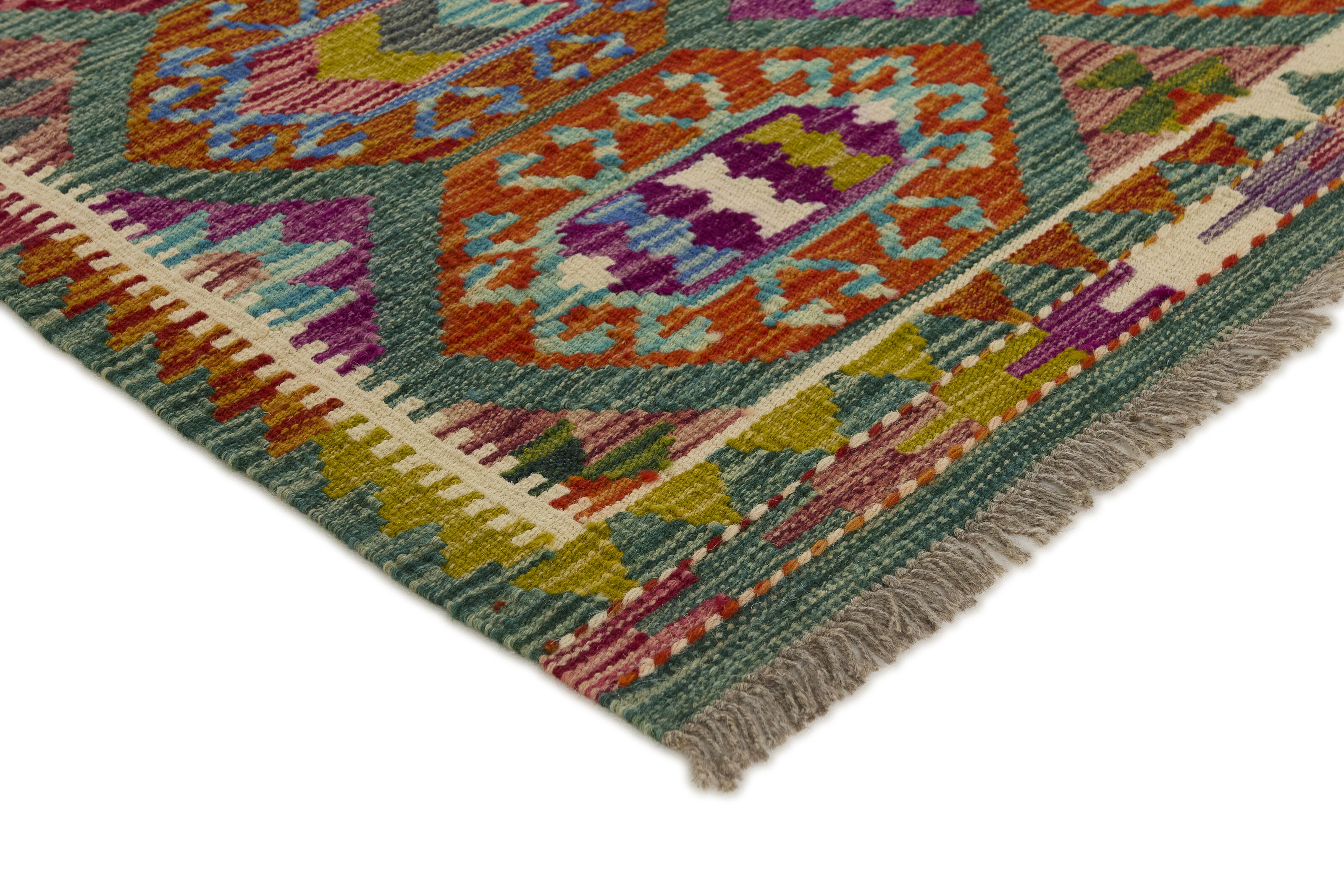 Afghan KelimItem no.: 1520476 Size: 103 cm x 145 cmAfghan Kelim rugs are hand woven by Turkmens in northern Afghanistan. Kelim is the name of a common Persian weave, but also of the technology used in the production. Kelims are primarily produced by nomads and are pile-less rugs, which are also used for bags, as wall decoration, or as curtains for tents. A natural colour scale with geometrical symbols and octagons is used.