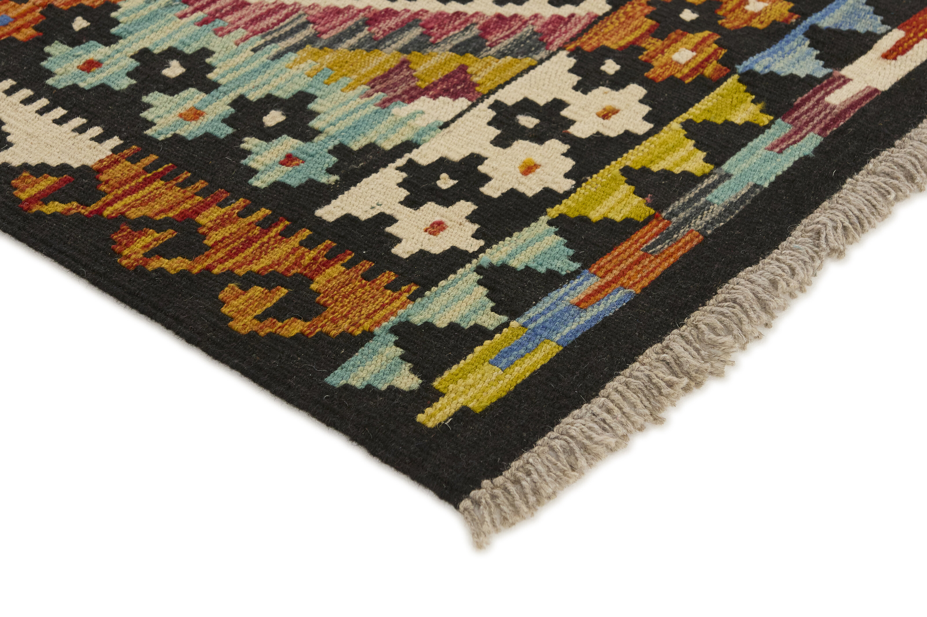 Afghan KelimItem no.: 1520493 Size: 128 cm x 200 cmAfghan Kelim rugs are hand woven by Turkmens in northern Afghanistan. Kelim is the name of a common Persian weave, but also of the technology used in the production. Kelims are primarily produced by nomads and are pile-less rugs, which are also used for bags, as wall decoration, or as curtains for tents. A natural colour scale with geometrical symbols and octagons is used.