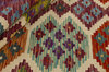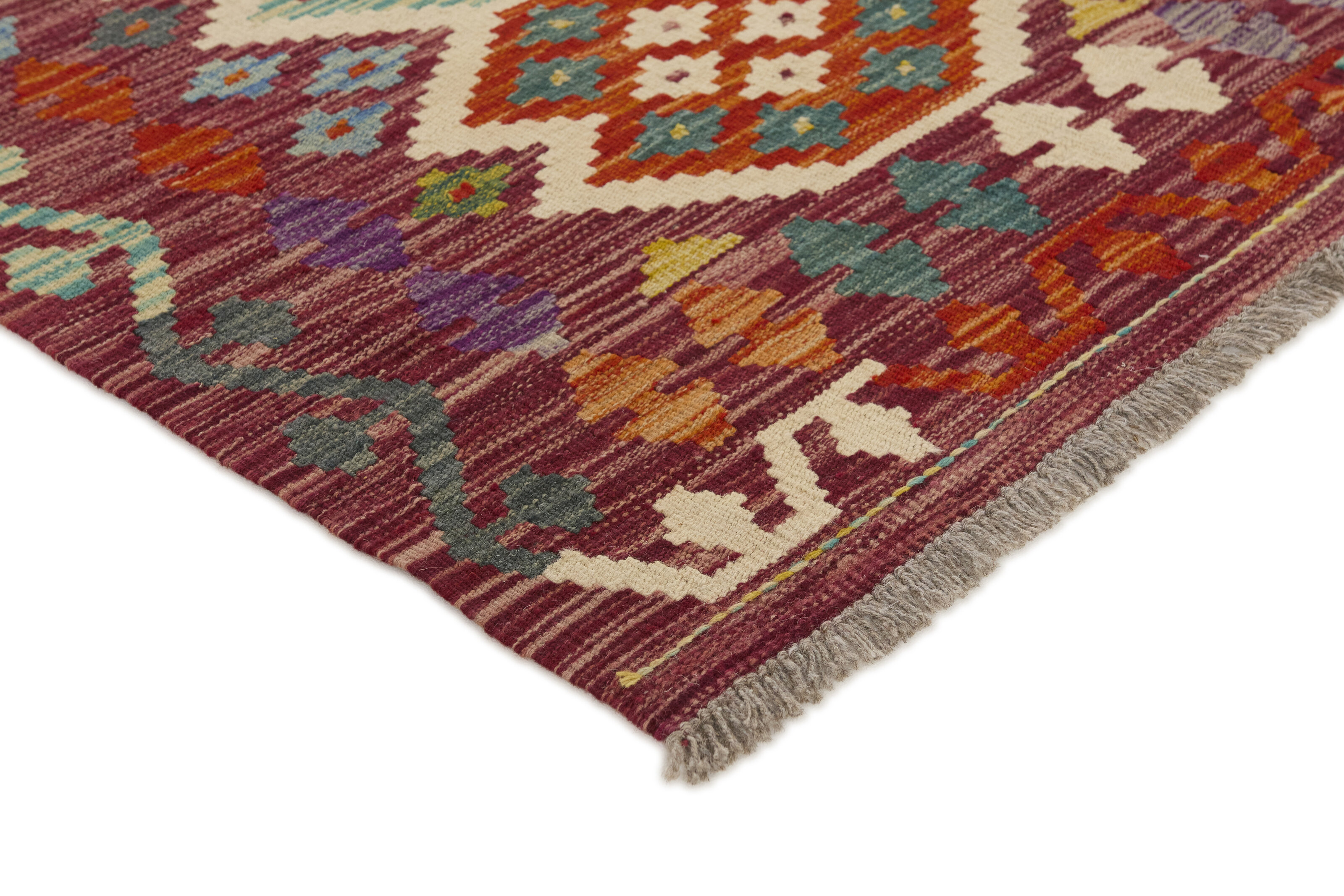Afghan KelimItem no.: 1520509 Size: 123 cm x 195 cmAfghan Kelim rugs are hand woven by Turkmens in northern Afghanistan. Kelim is the name of a common Persian weave, but also of the technology used in the production. Kelims are primarily produced by nomads and are pile-less rugs, which are also used for bags, as wall decoration, or as curtains for tents. A natural colour scale with geometrical symbols and octagons is used.
