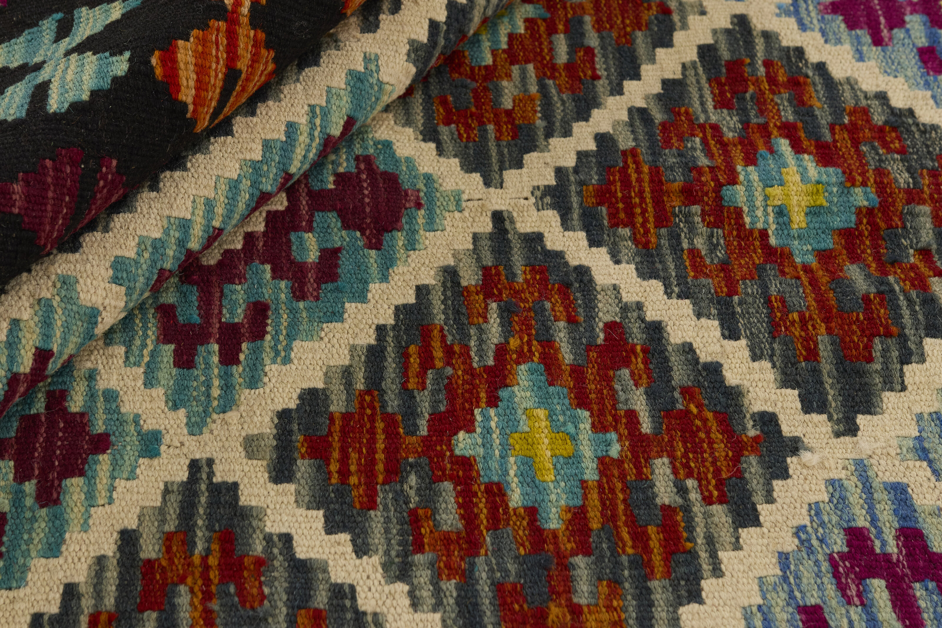 Afghan KelimItem no.: 1520516 Size: 153 cm x 205 cmAfghan Kelim rugs are hand woven by Turkmens in northern Afghanistan. Kelim is the name of a common Persian weave, but also of the technology used in the production. Kelims are primarily produced by nomads and are pile-less rugs, which are also used for bags, as wall decoration, or as curtains for tents. A natural colour scale with geometrical symbols and octagons is used.
