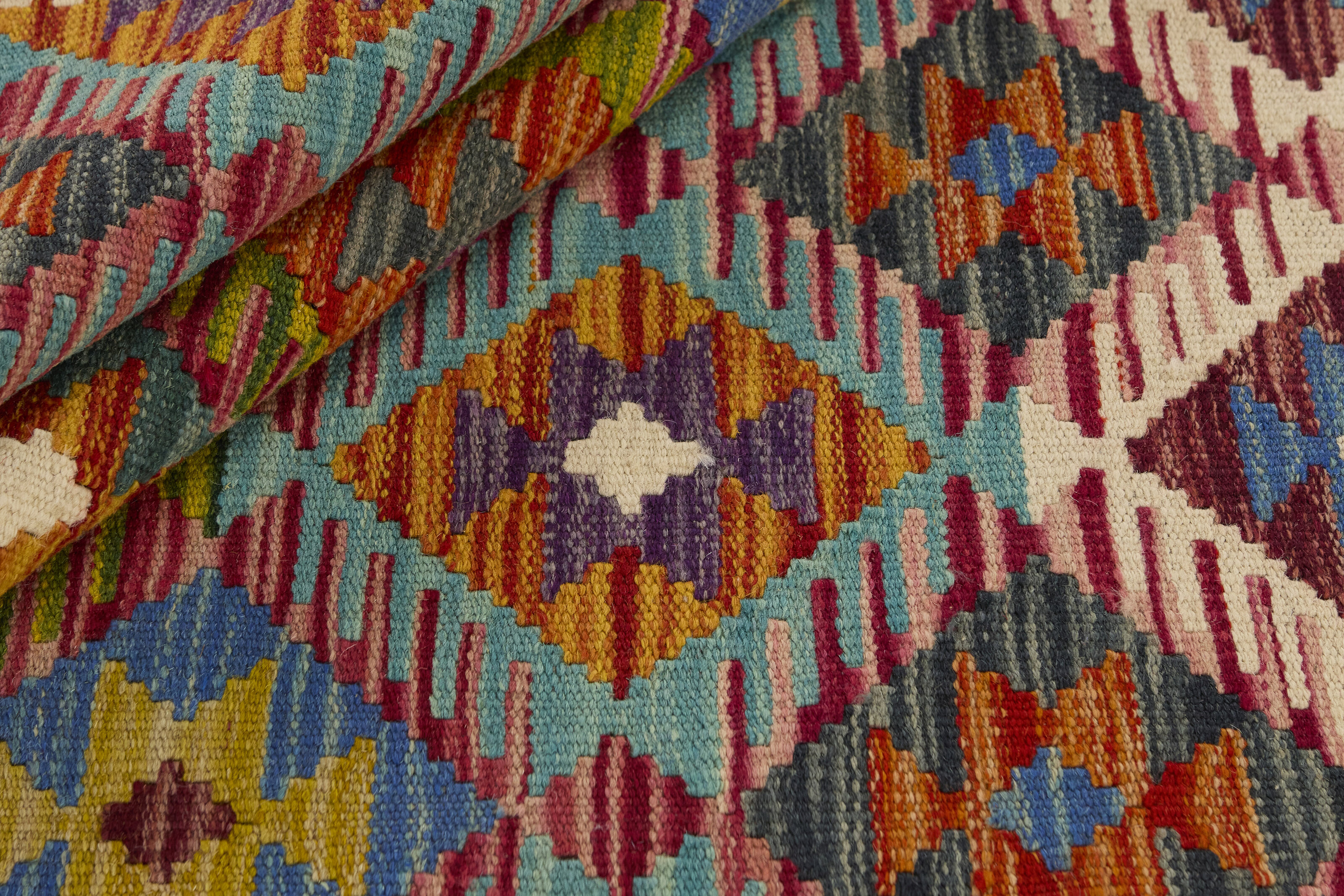 Afghan KelimItem no.: 1520531 Size: 150 cm x 192 cmAfghan Kelim rugs are hand woven by Turkmens in northern Afghanistan. Kelim is the name of a common Persian weave, but also of the technology used in the production. Kelims are primarily produced by nomads and are pile-less rugs, which are also used for bags, as wall decoration, or as curtains for tents. A natural colour scale with geometrical symbols and octagons is used.