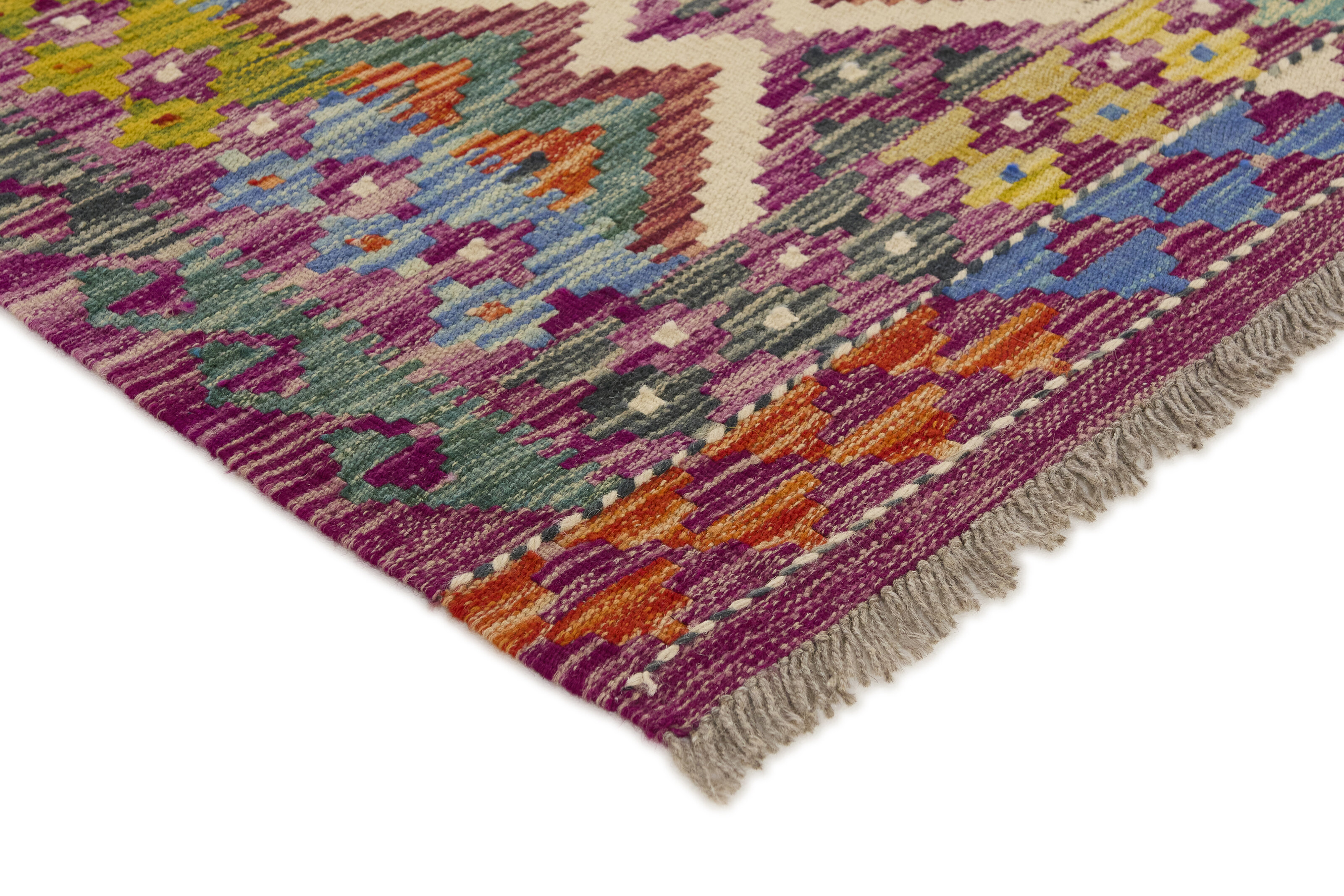 Afghan KelimItem no.: 1520533 Size: 155 cm x 190 cmAfghan Kelim rugs are hand woven by Turkmens in northern Afghanistan. Kelim is the name of a common Persian weave, but also of the technology used in the production. Kelims are primarily produced by nomads and are pile-less rugs, which are also used for bags, as wall decoration, or as curtains for tents. A natural colour scale with geometrical symbols and octagons is used.
