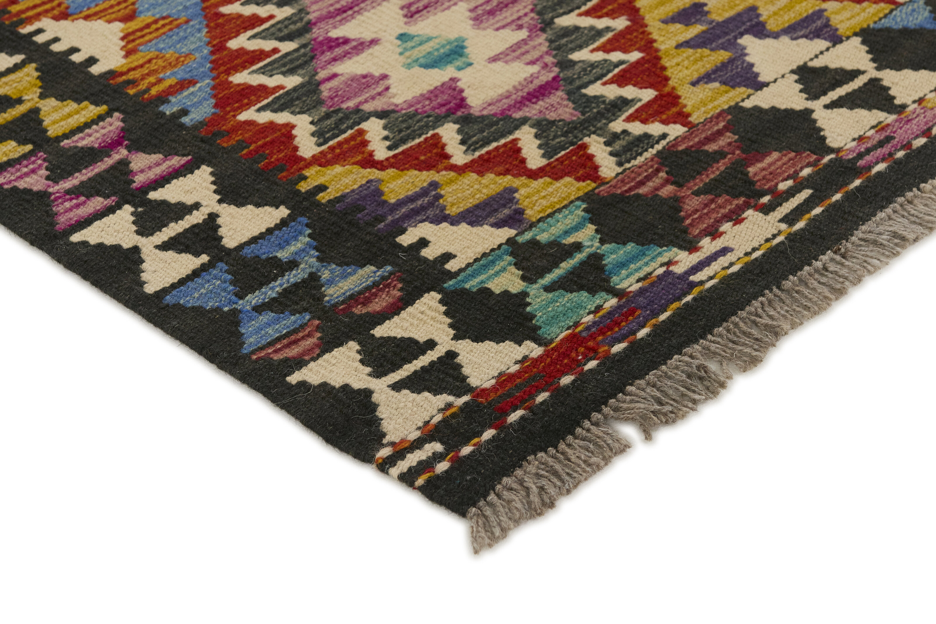 Afghan KelimItem no.: 1520561 Size: 86 cm x 198 cmAfghan Kelim rugs are hand woven by Turkmens in northern Afghanistan. Kelim is the name of a common Persian weave, but also of the technology used in the production. Kelims are primarily produced by nomads and are pile-less rugs, which are also used for bags, as wall decoration, or as curtains for tents. A natural colour scale with geometrical symbols and octagons is used.