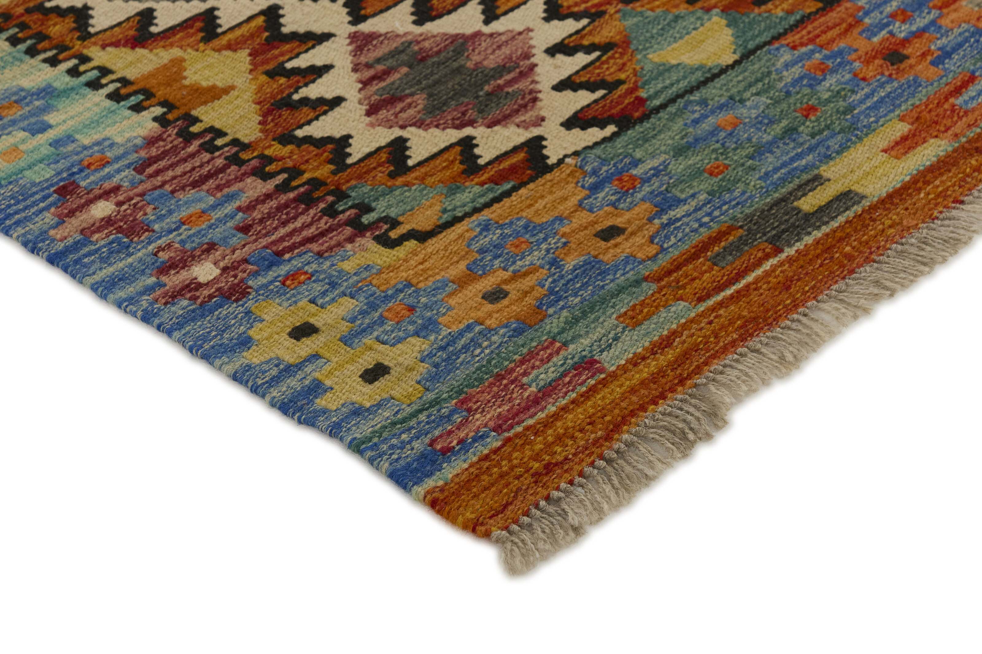 Afghan KelimItem no.: 1520566 Size: 76 cm x 194 cmAfghan Kelim rugs are hand woven by Turkmens in northern Afghanistan. Kelim is the name of a common Persian weave, but also of the technology used in the production. Kelims are primarily produced by nomads and are pile-less rugs, which are also used for bags, as wall decoration, or as curtains for tents. A natural colour scale with geometrical symbols and octagons is used.