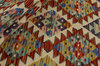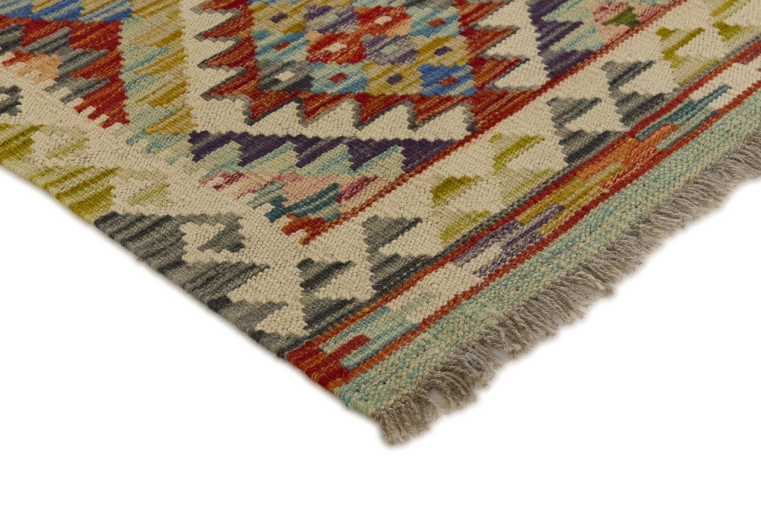 Afghan KelimItem no.: 1520569 Size: 80 cm x 181 cmAfghan Kelim rugs are hand woven by Turkmens in northern Afghanistan. Kelim is the name of a common Persian weave, but also of the technology used in the production. Kelims are primarily produced by nomads and are pile-less rugs, which are also used for bags, as wall decoration, or as curtains for tents. A natural colour scale with geometrical symbols and octagons is used.