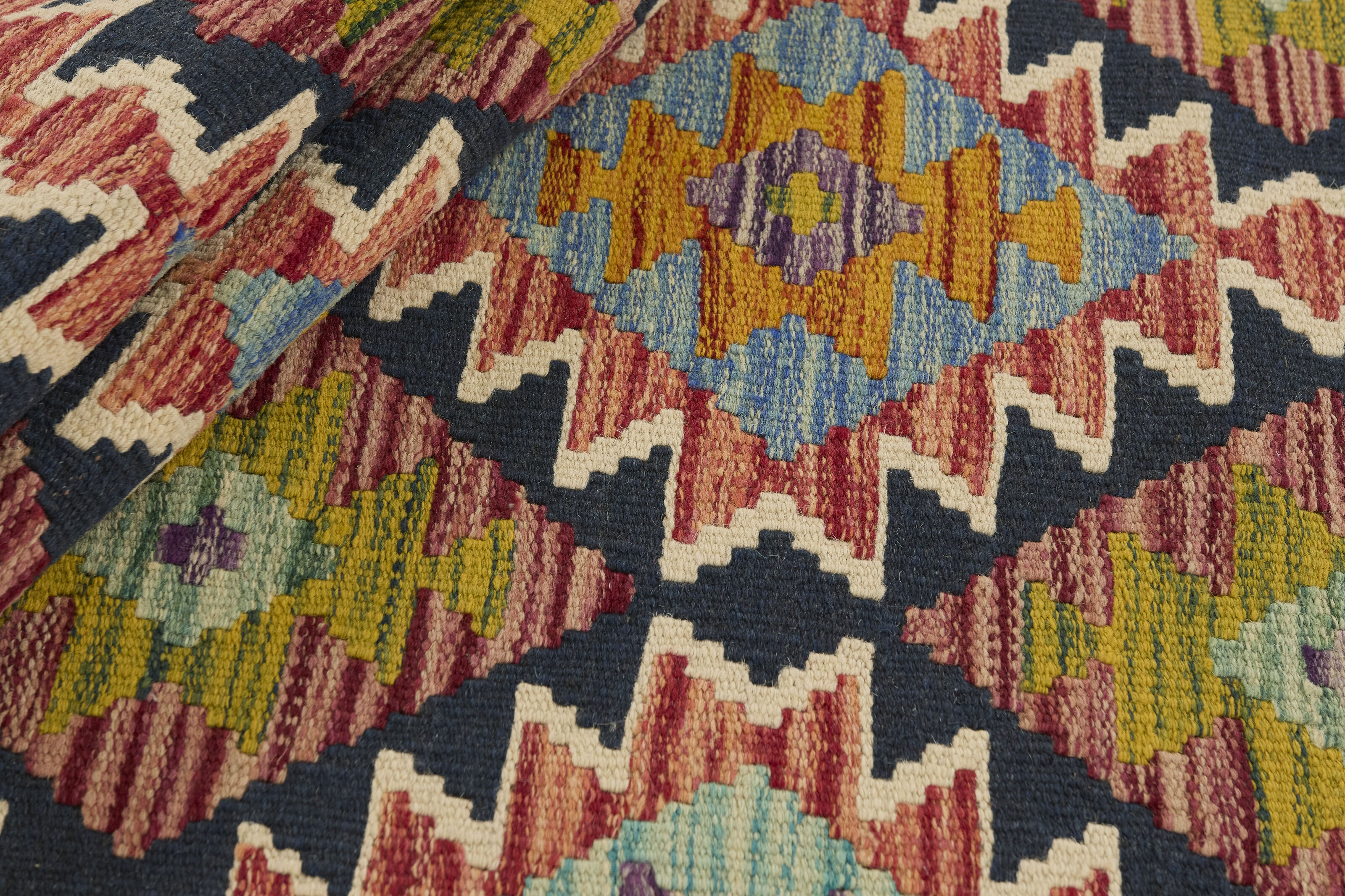 Afghan KelimItem no.: 1520572 Size: 81 cm x 203 cmAfghan Kelim rugs are hand woven by Turkmens in northern Afghanistan. Kelim is the name of a common Persian weave, but also of the technology used in the production. Kelims are primarily produced by nomads and are pile-less rugs, which are also used for bags, as wall decoration, or as curtains for tents. A natural colour scale with geometrical symbols and octagons is used.