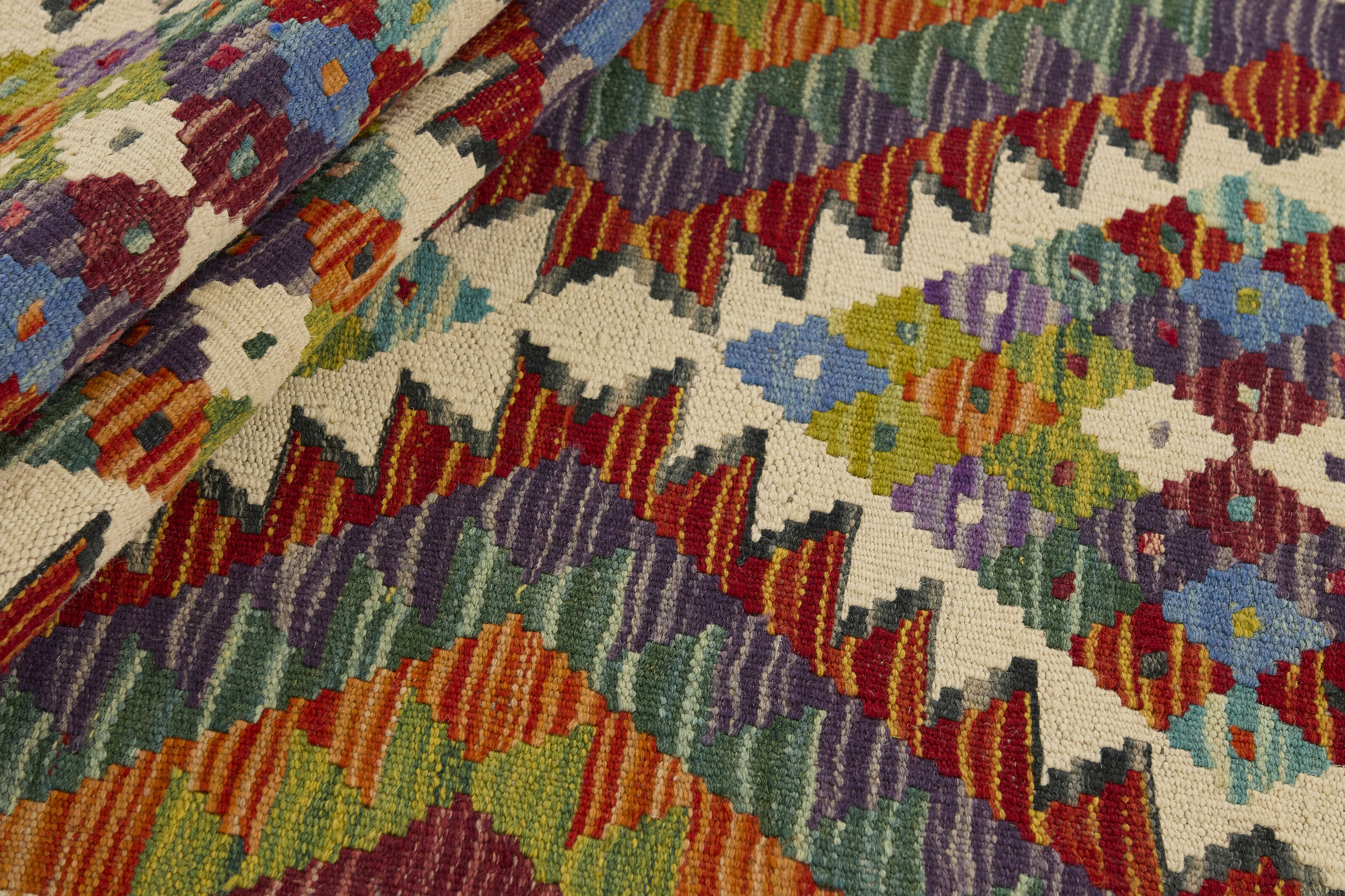 Afghan KelimItem no.: 1520579 Size: 85 cm x 202 cmAfghan Kelim rugs are hand woven by Turkmens in northern Afghanistan. Kelim is the name of a common Persian weave, but also of the technology used in the production. Kelims are primarily produced by nomads and are pile-less rugs, which are also used for bags, as wall decoration, or as curtains for tents. A natural colour scale with geometrical symbols and octagons is used.