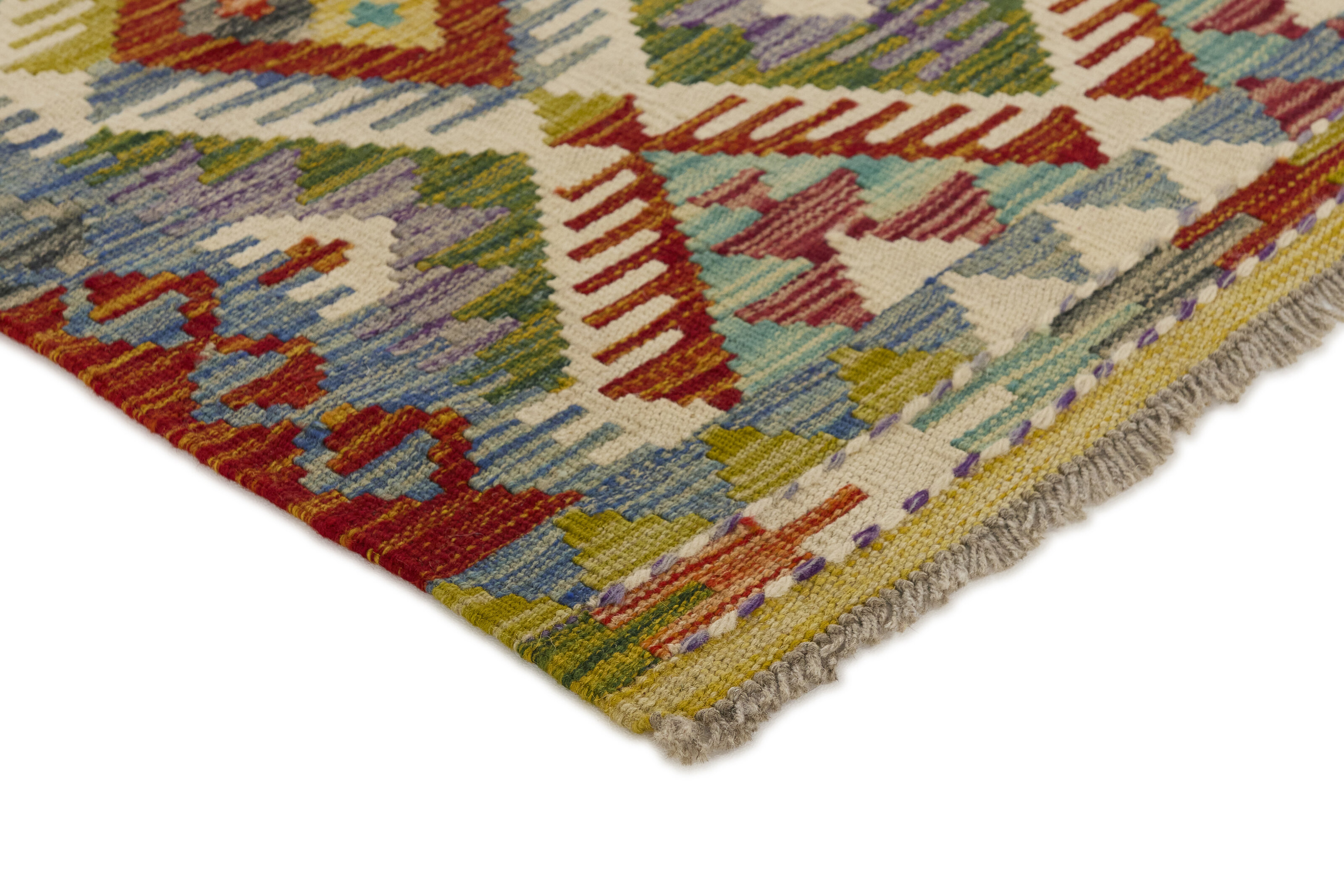 Afghan KelimItem no.: 1520583 Size: 82 cm x 196 cmAfghan Kelim rugs are hand woven by Turkmens in northern Afghanistan. Kelim is the name of a common Persian weave, but also of the technology used in the production. Kelims are primarily produced by nomads and are pile-less rugs, which are also used for bags, as wall decoration, or as curtains for tents. A natural colour scale with geometrical symbols and octagons is used.