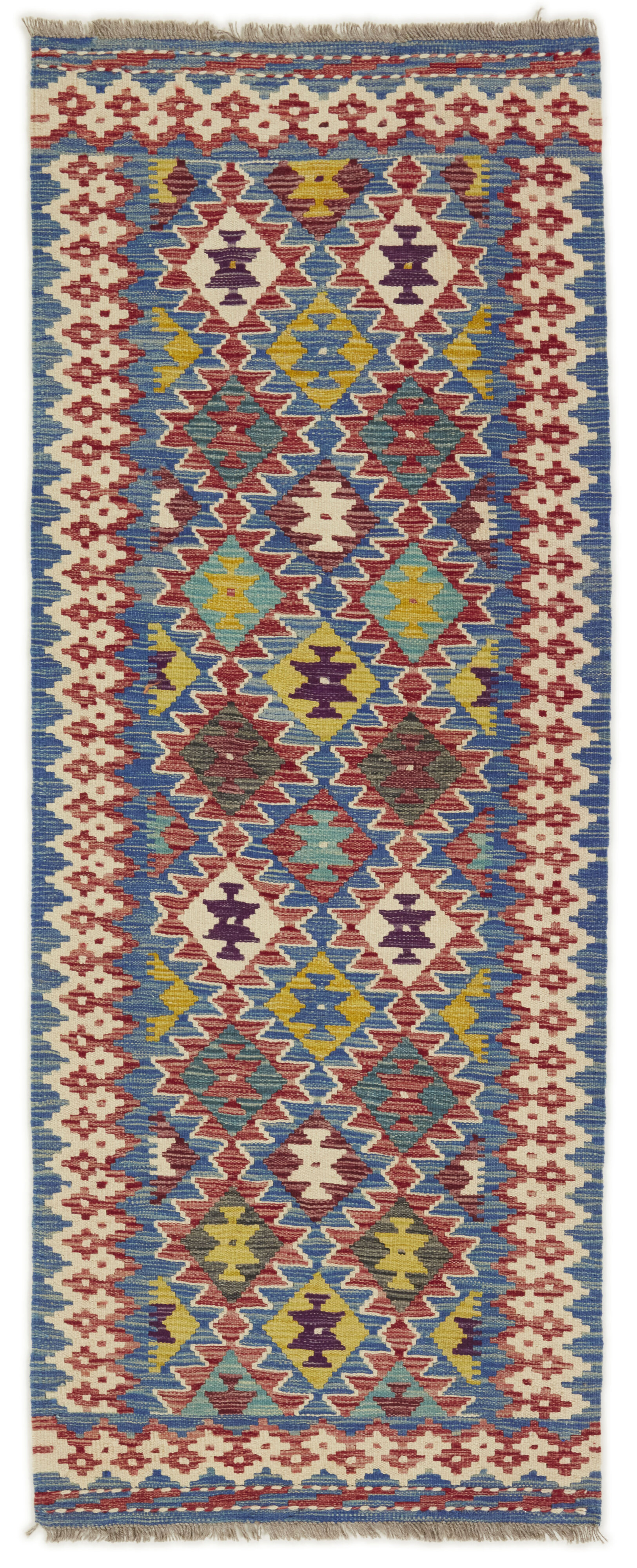 Afghan KelimItem no.: 1520584 Size: 80 cm x 206 cmAfghan Kelim rugs are hand woven by Turkmens in northern Afghanistan. Kelim is the name of a common Persian weave, but also of the technology used in the production. Kelims are primarily produced by nomads and are pile-less rugs, which are also used for bags, as wall decoration, or as curtains for tents. A natural colour scale with geometrical symbols and octagons is used.