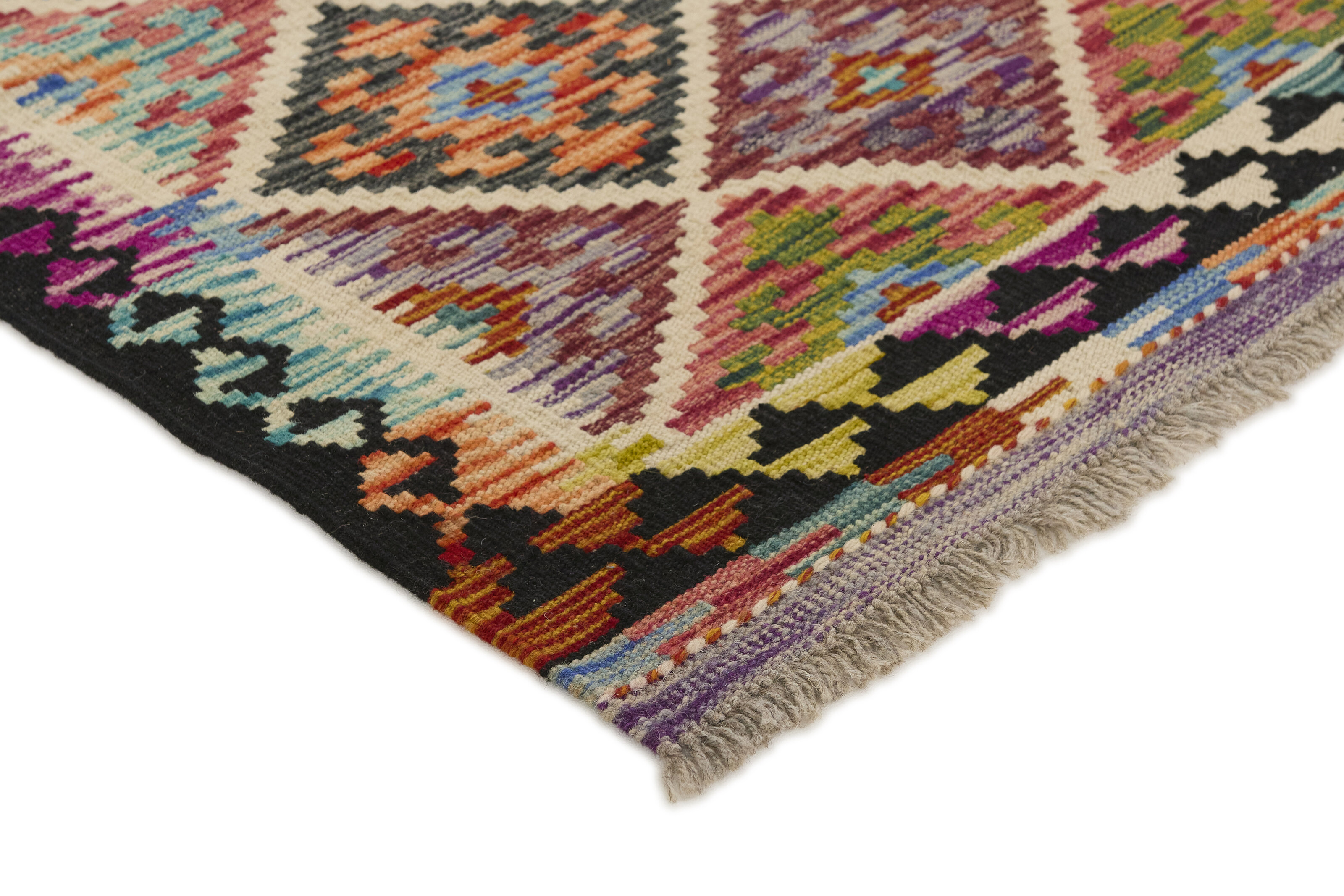Afghan KelimItem no.: 1520588 Size: 81 cm x 203 cmAfghan Kelim rugs are hand woven by Turkmens in northern Afghanistan. Kelim is the name of a common Persian weave, but also of the technology used in the production. Kelims are primarily produced by nomads and are pile-less rugs, which are also used for bags, as wall decoration, or as curtains for tents. A natural colour scale with geometrical symbols and octagons is used.