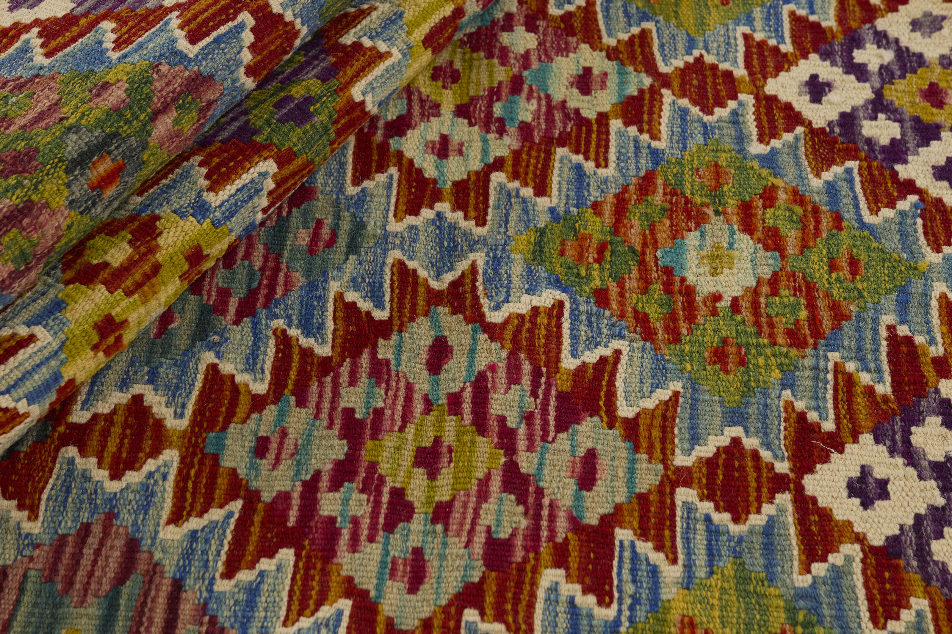 Afghan KelimItem no.: 1520591 Size: 81 cm x 197 cmAfghan Kelim rugs are hand woven by Turkmens in northern Afghanistan. Kelim is the name of a common Persian weave, but also of the technology used in the production. Kelims are primarily produced by nomads and are pile-less rugs, which are also used for bags, as wall decoration, or as curtains for tents. A natural colour scale with geometrical symbols and octagons is used.