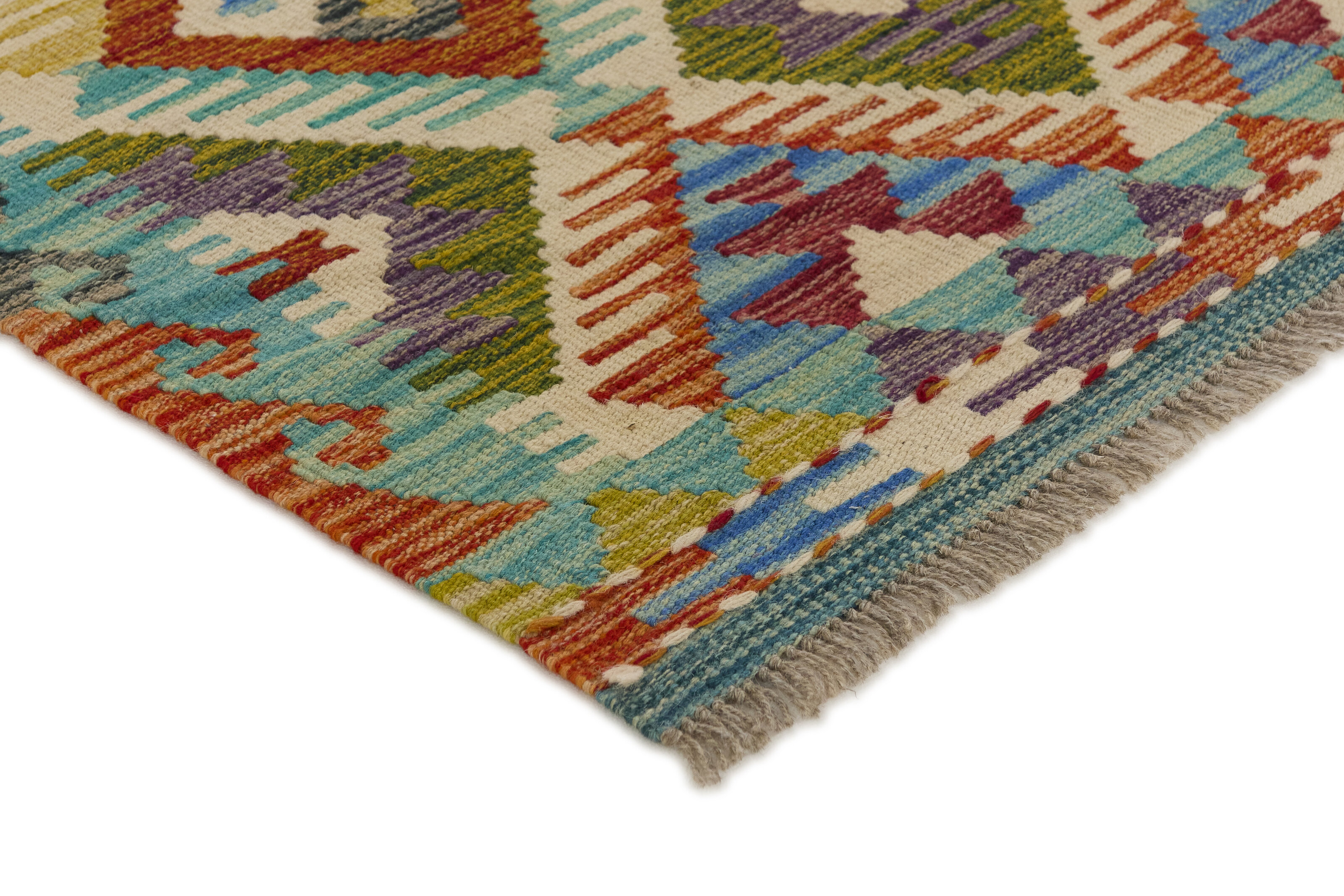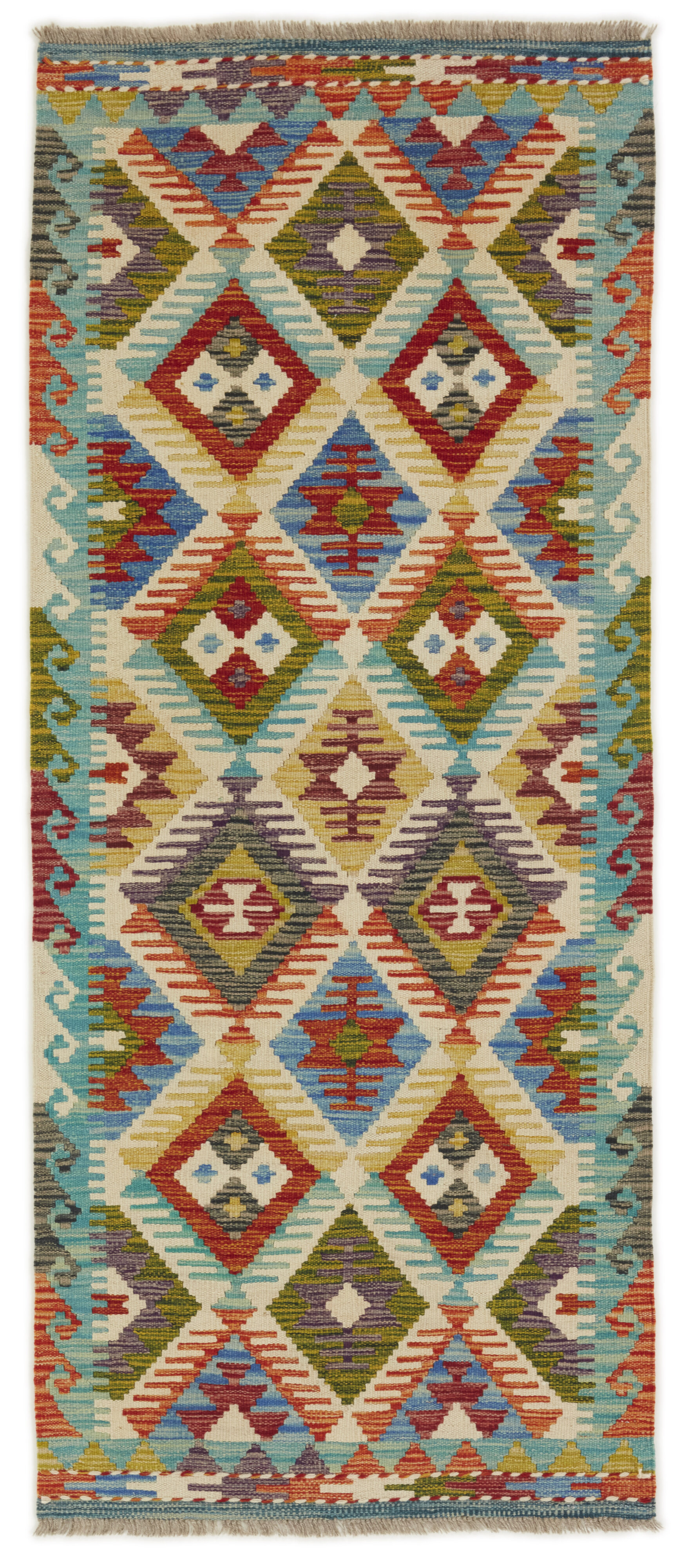 Afghan KelimItem no.: 1520595 Size: 83 cm x 196 cmAfghan Kelim rugs are hand woven by Turkmens in northern Afghanistan. Kelim is the name of a common Persian weave, but also of the technology used in the production. Kelims are primarily produced by nomads and are pile-less rugs, which are also used for bags, as wall decoration, or as curtains for tents. A natural colour scale with geometrical symbols and octagons is used.