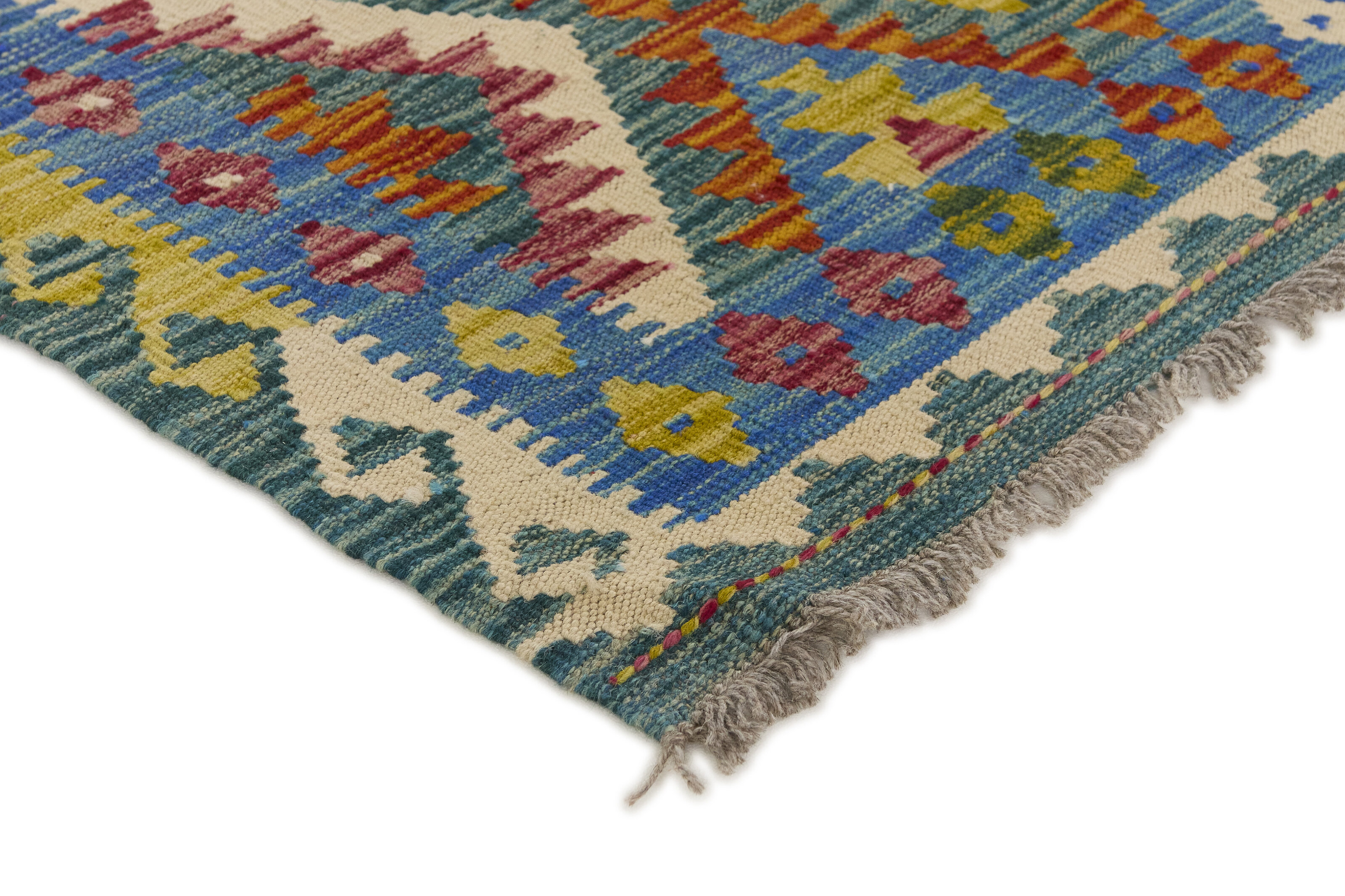 Afghan KelimItem no.: 1520596 Size: 87 cm x 197 cmAfghan Kelim rugs are hand woven by Turkmens in northern Afghanistan. Kelim is the name of a common Persian weave, but also of the technology used in the production. Kelims are primarily produced by nomads and are pile-less rugs, which are also used for bags, as wall decoration, or as curtains for tents. A natural colour scale with geometrical symbols and octagons is used.