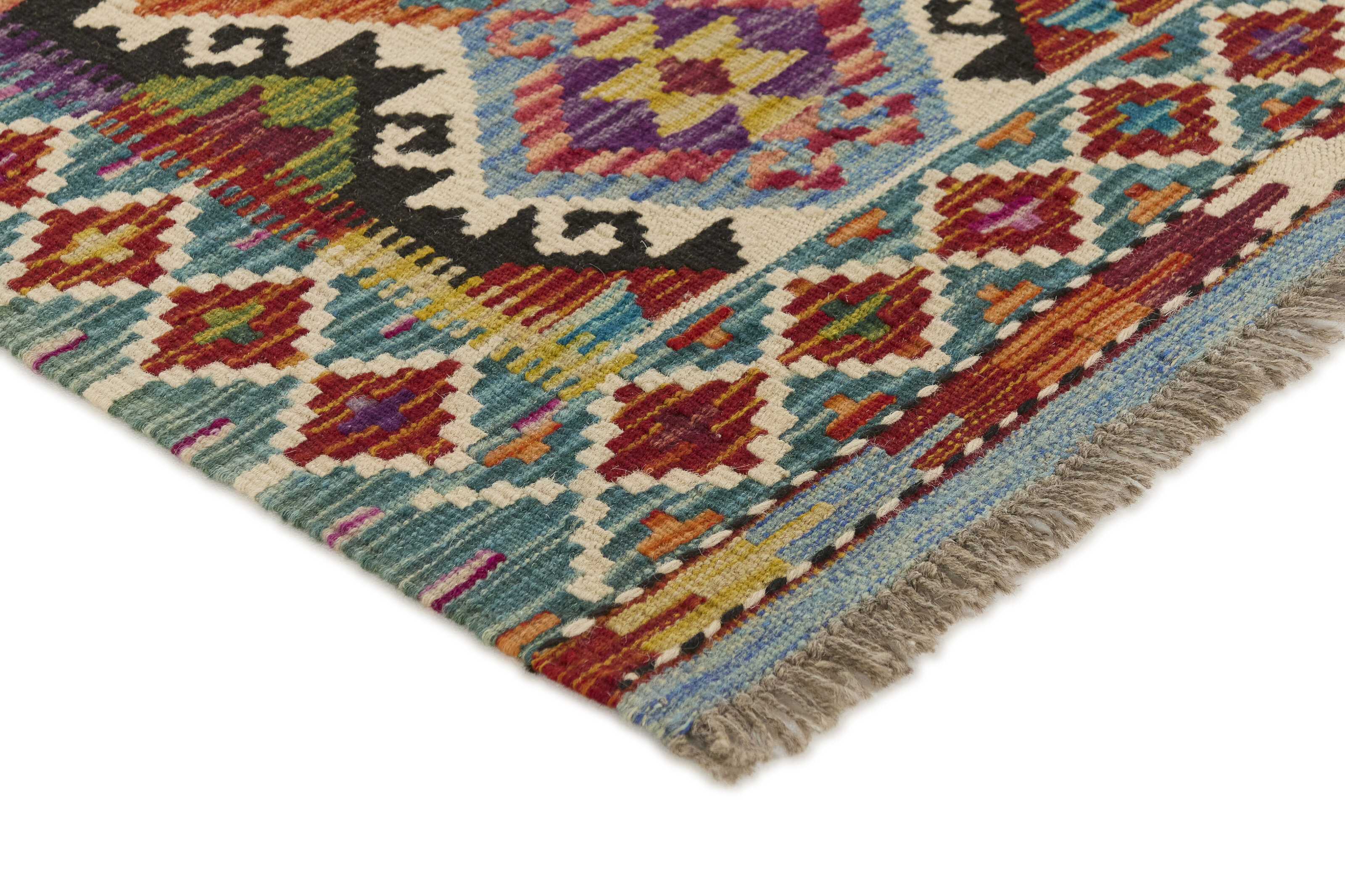 Afghan KelimItem no.: 1520597 Size: 83 cm x 248 cmAfghan Kelim rugs are hand woven by Turkmens in northern Afghanistan. Kelim is the name of a common Persian weave, but also of the technology used in the production. Kelims are primarily produced by nomads and are pile-less rugs, which are also used for bags, as wall decoration, or as curtains for tents. A natural colour scale with geometrical symbols and octagons is used.