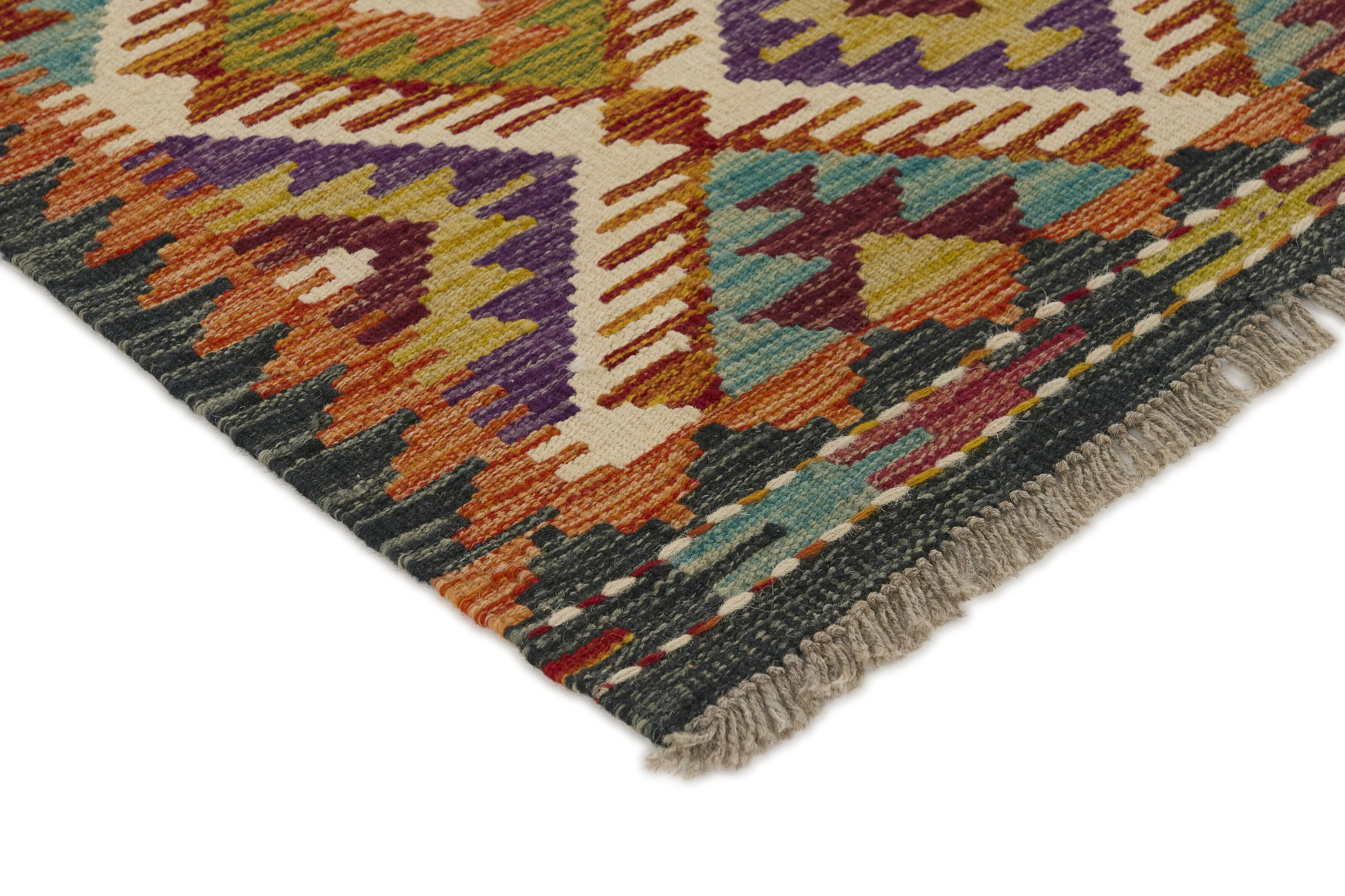 Afghan KelimItem no.: 1520599 Size: 80 cm x 240 cmAfghan Kelim rugs are hand woven by Turkmens in northern Afghanistan. Kelim is the name of a common Persian weave, but also of the technology used in the production. Kelims are primarily produced by nomads and are pile-less rugs, which are also used for bags, as wall decoration, or as curtains for tents. A natural colour scale with geometrical symbols and octagons is used.