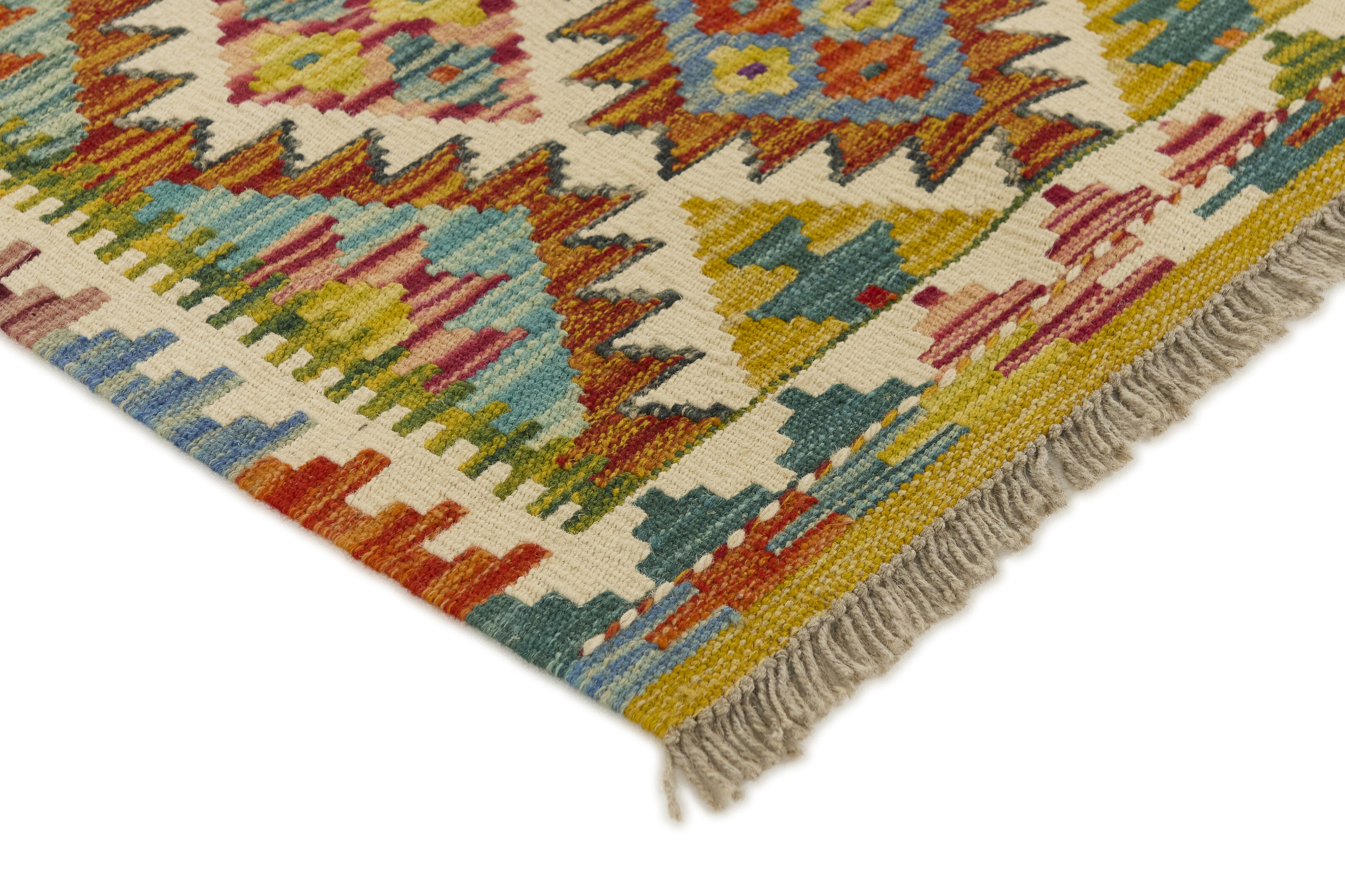 Afghan KelimItem no.: 1520620 Size: 63 cm x 146 cmAfghan Kelim rugs are hand woven by Turkmens in northern Afghanistan. Kelim is the name of a common Persian weave, but also of the technology used in the production. Kelims are primarily produced by nomads and are pile-less rugs, which are also used for bags, as wall decoration, or as curtains for tents. A natural colour scale with geometrical symbols and octagons is used.