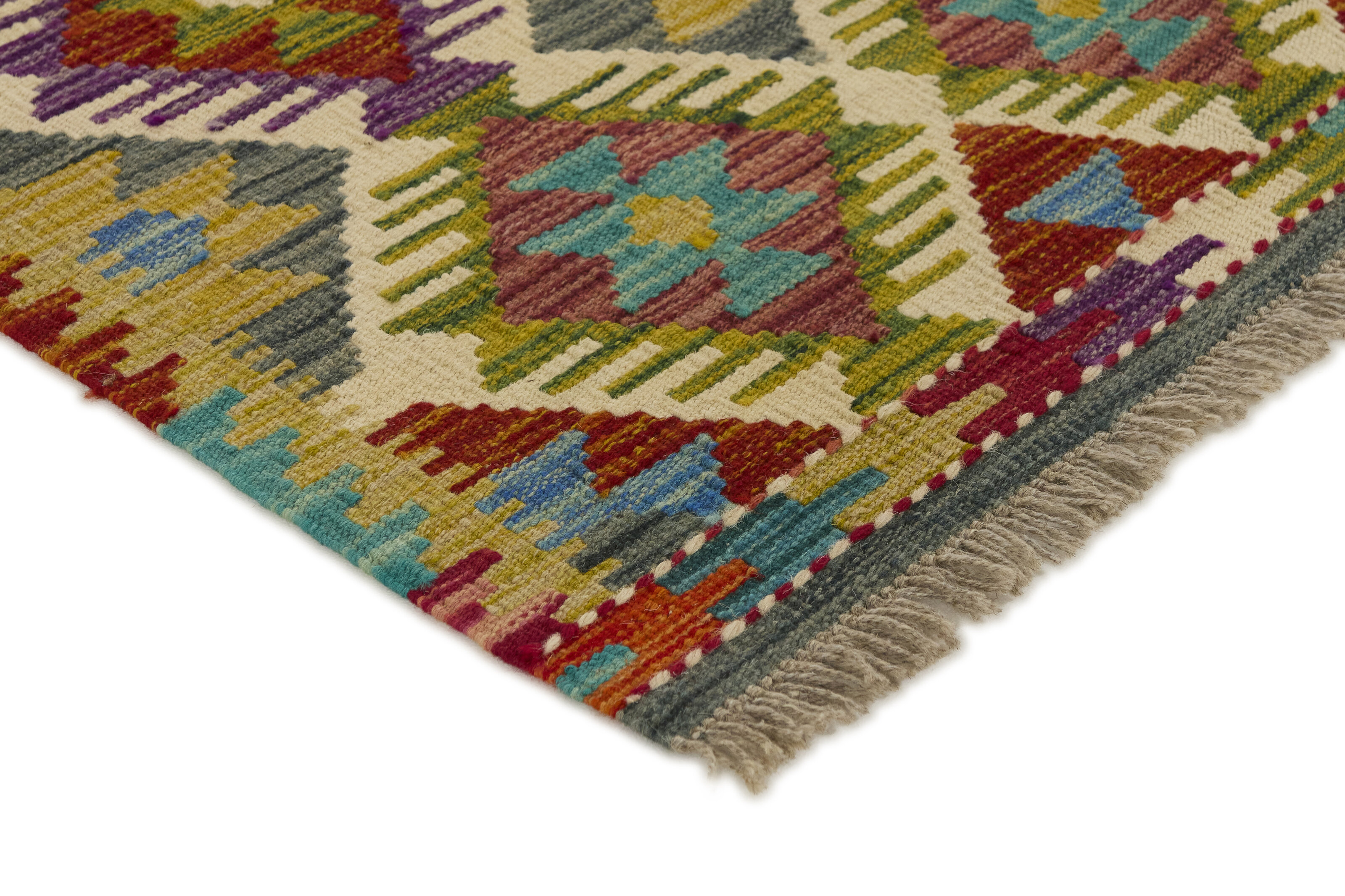 Afghan KelimItem no.: 1520627 Size: 62 cm x 158 cmAfghan Kelim rugs are hand woven by Turkmens in northern Afghanistan. Kelim is the name of a common Persian weave, but also of the technology used in the production. Kelims are primarily produced by nomads and are pile-less rugs, which are also used for bags, as wall decoration, or as curtains for tents. A natural colour scale with geometrical symbols and octagons is used.