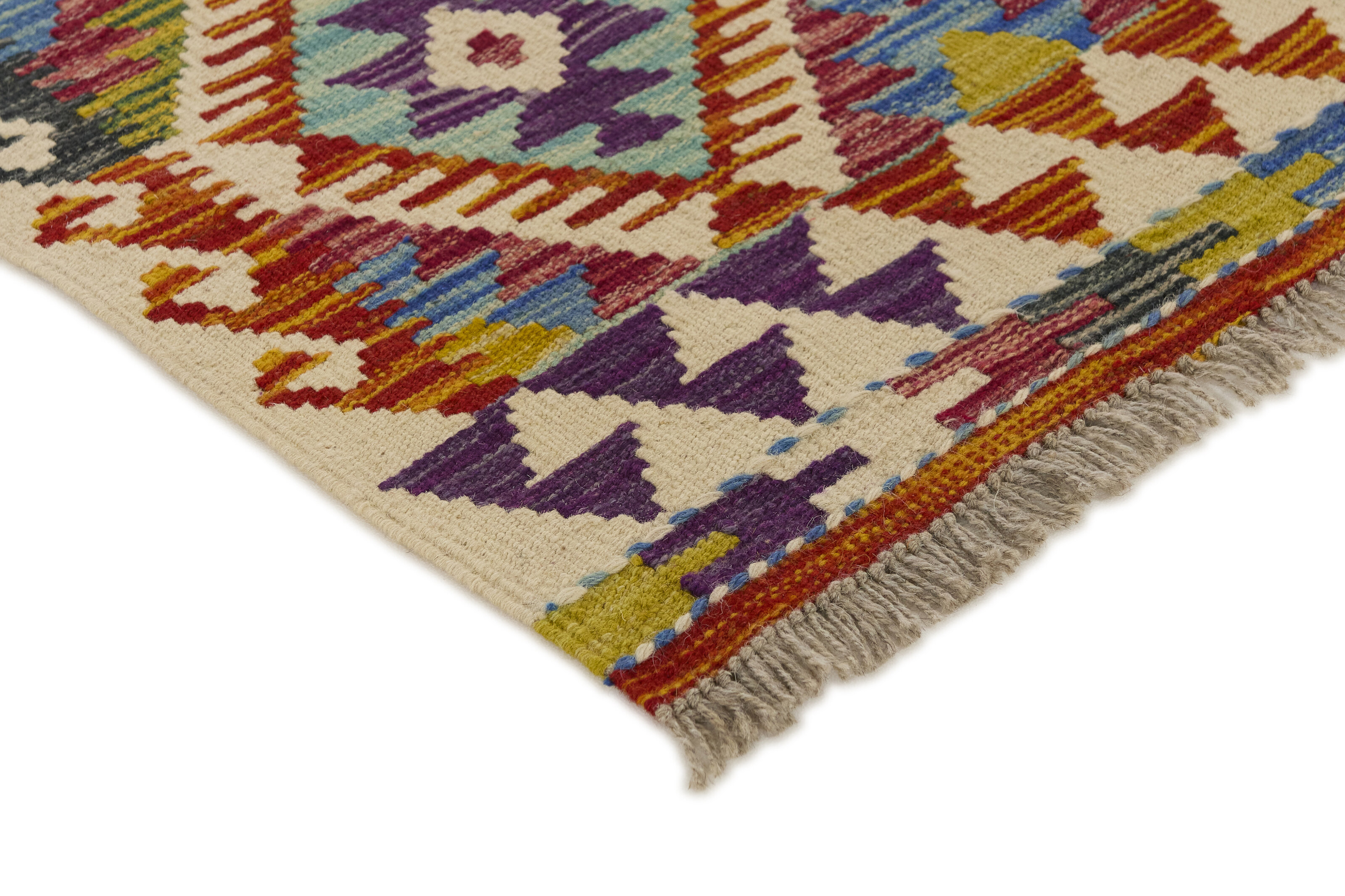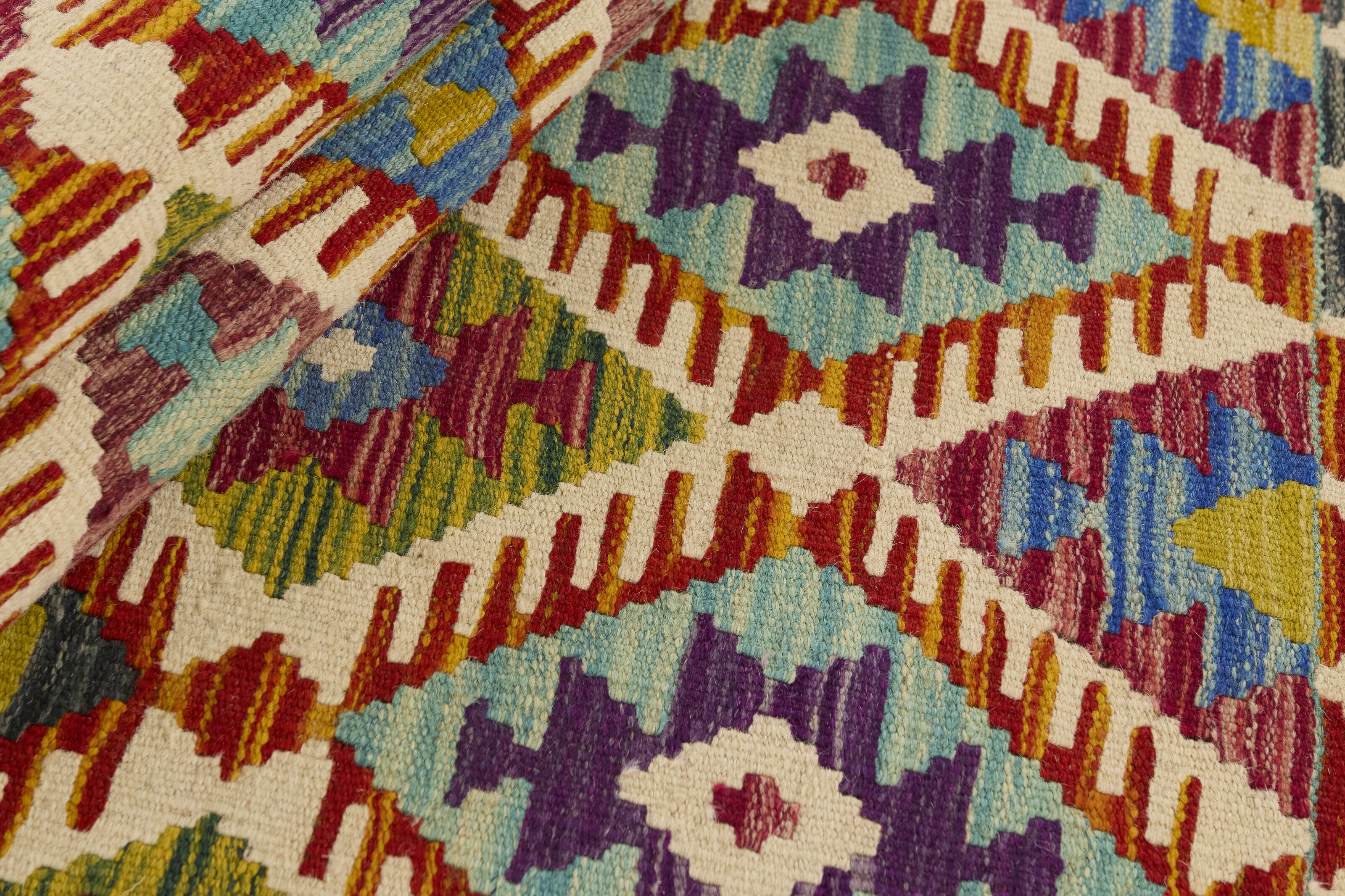 Afghan KelimItem no.: 1520635 Size: 66 cm x 152 cmAfghan Kelim rugs are hand woven by Turkmens in northern Afghanistan. Kelim is the name of a common Persian weave, but also of the technology used in the production. Kelims are primarily produced by nomads and are pile-less rugs, which are also used for bags, as wall decoration, or as curtains for tents. A natural colour scale with geometrical symbols and octagons is used.