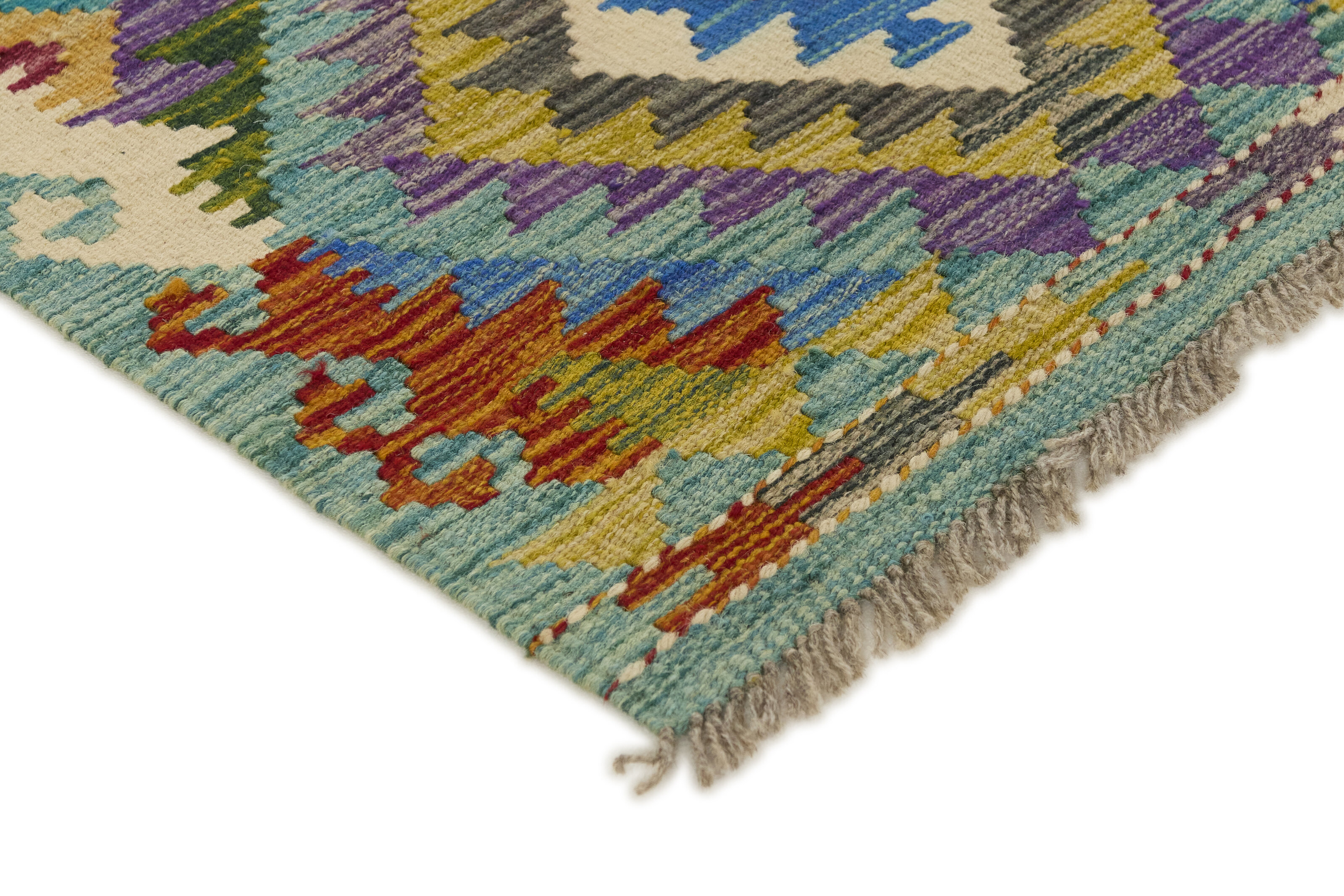Afghan KelimItem no.: 1520655 Size: 60 cm x 153 cmAfghan Kelim rugs are hand woven by Turkmens in northern Afghanistan. Kelim is the name of a common Persian weave, but also of the technology used in the production. Kelims are primarily produced by nomads and are pile-less rugs, which are also used for bags, as wall decoration, or as curtains for tents. A natural colour scale with geometrical symbols and octagons is used.