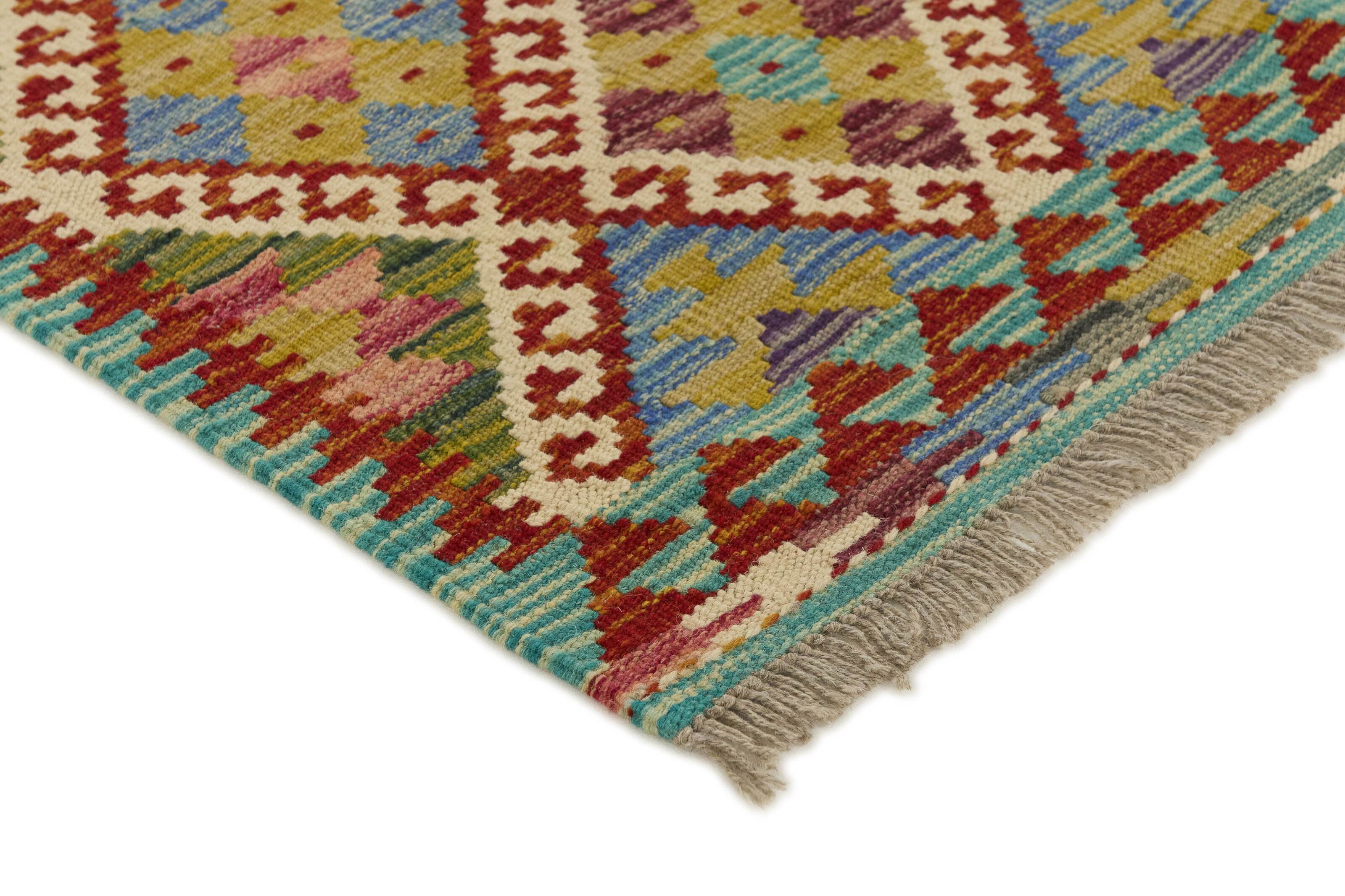 Afghan KelimItem no.: 1520662 Size: 61 cm x 145 cmAfghan Kelim rugs are hand woven by Turkmens in northern Afghanistan. Kelim is the name of a common Persian weave, but also of the technology used in the production. Kelims are primarily produced by nomads and are pile-less rugs, which are also used for bags, as wall decoration, or as curtains for tents. A natural colour scale with geometrical symbols and octagons is used.