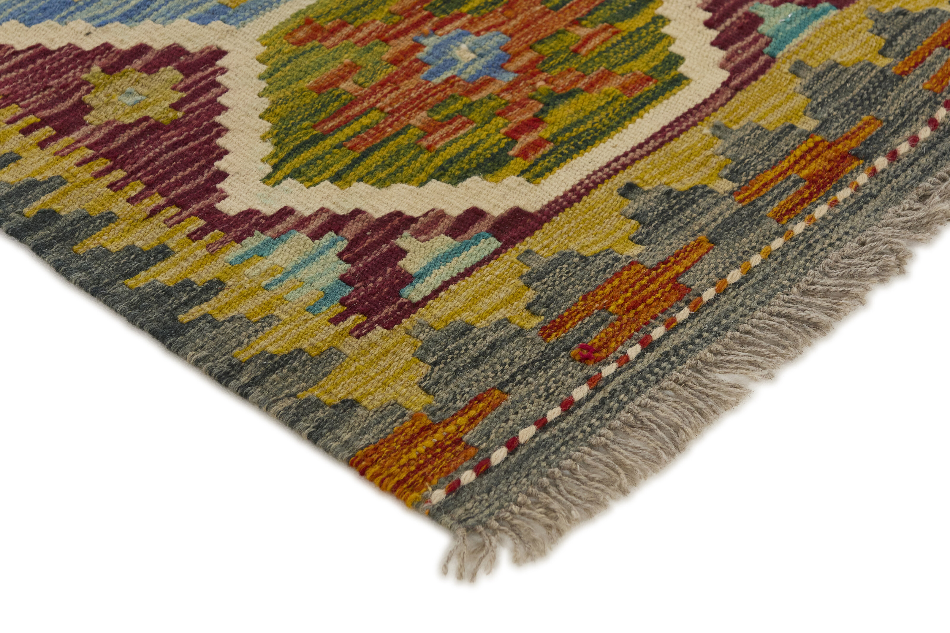 Afghan KelimItem no.: 1520667 Size: 50 cm x 152 cmAfghan Kelim rugs are hand woven by Turkmens in northern Afghanistan. Kelim is the name of a common Persian weave, but also of the technology used in the production. Kelims are primarily produced by nomads and are pile-less rugs, which are also used for bags, as wall decoration, or as curtains for tents. A natural colour scale with geometrical symbols and octagons is used.