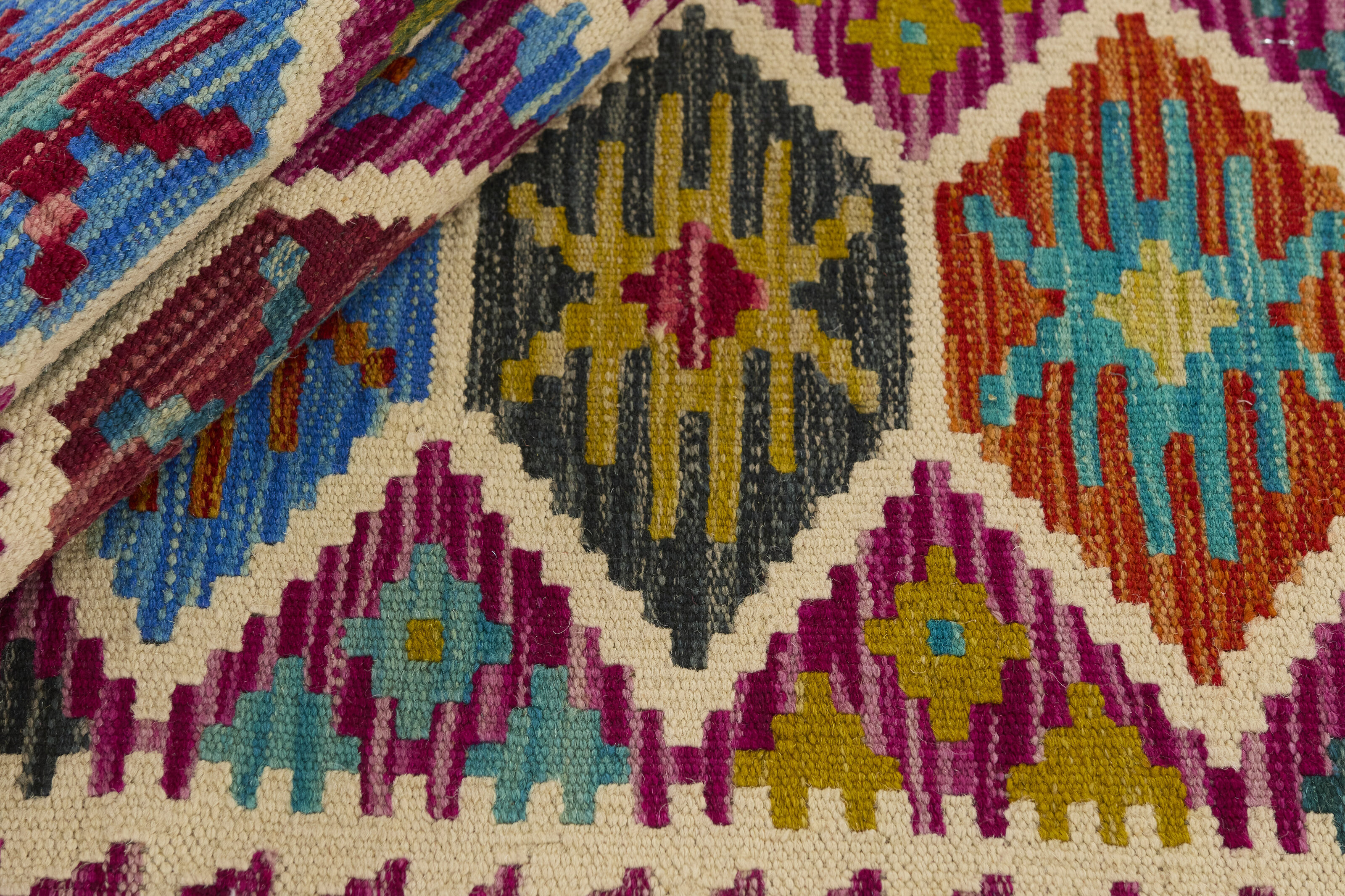 Afghan KelimItem no.: 1520668 Size: 44 cm x 145 cmAfghan Kelim rugs are hand woven by Turkmens in northern Afghanistan. Kelim is the name of a common Persian weave, but also of the technology used in the production. Kelims are primarily produced by nomads and are pile-less rugs, which are also used for bags, as wall decoration, or as curtains for tents. A natural colour scale with geometrical symbols and octagons is used.