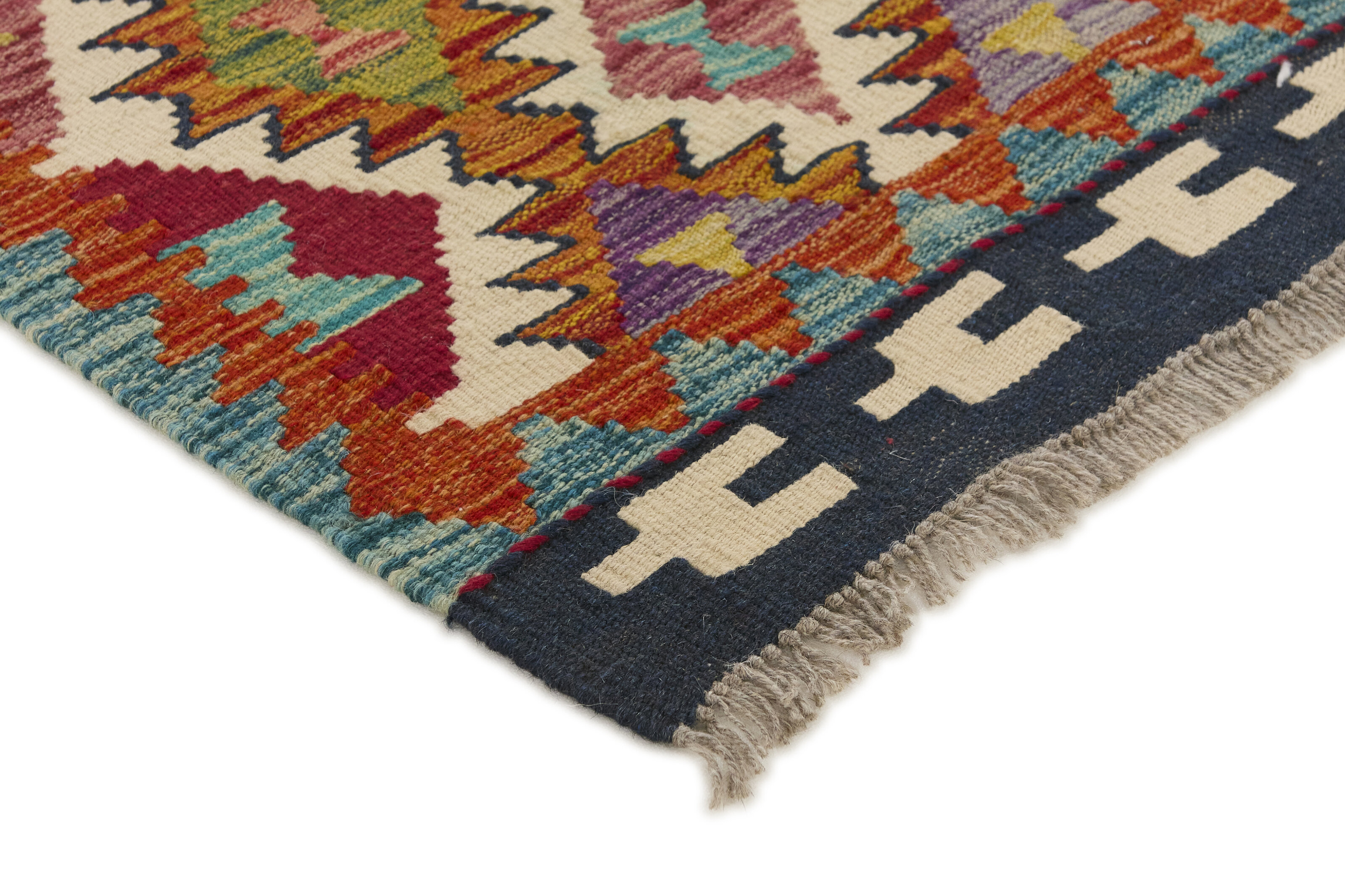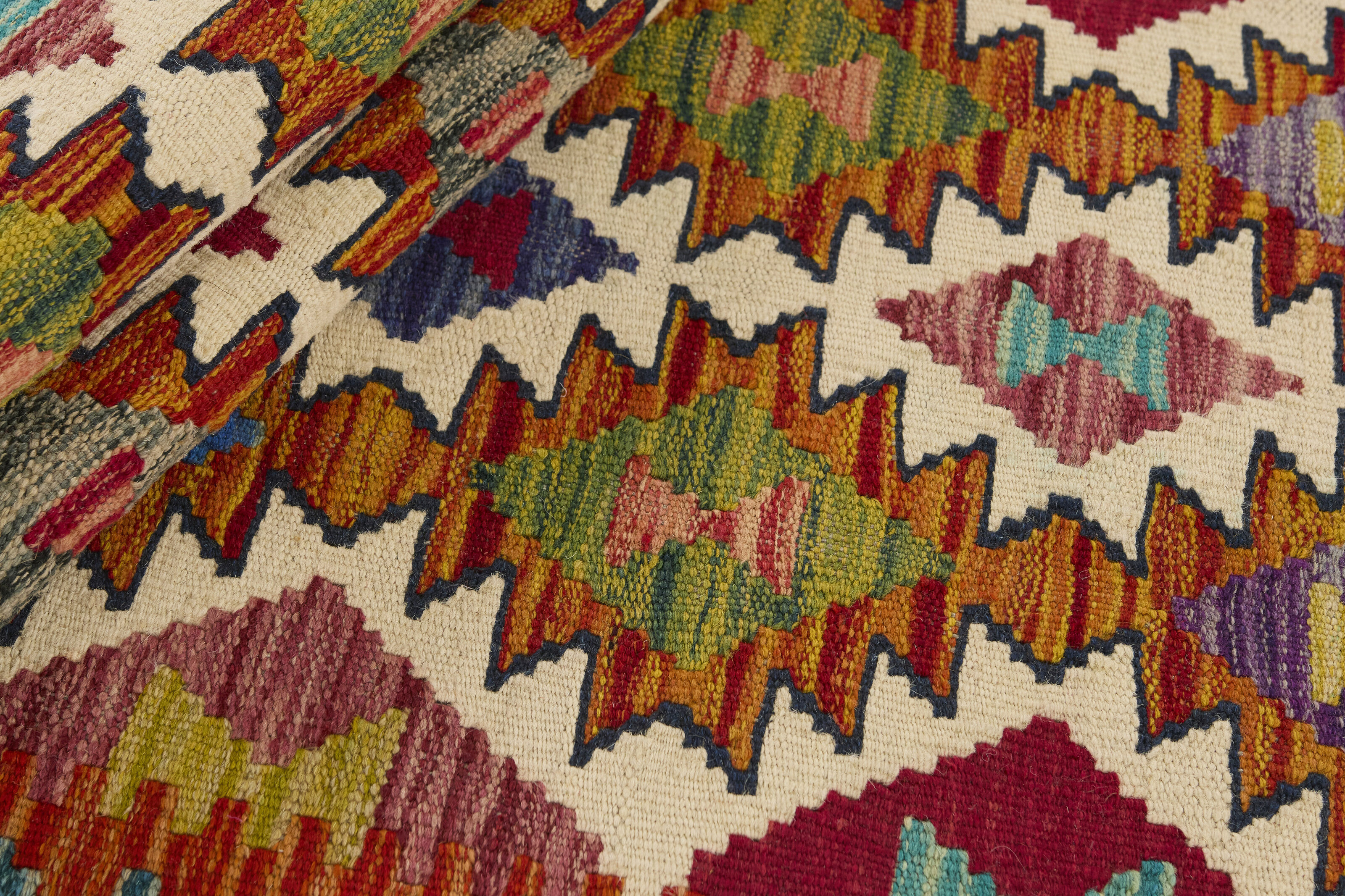 Afghan KelimItem no.: 1520669 Size: 54 cm x 149 cmAfghan Kelim rugs are hand woven by Turkmens in northern Afghanistan. Kelim is the name of a common Persian weave, but also of the technology used in the production. Kelims are primarily produced by nomads and are pile-less rugs, which are also used for bags, as wall decoration, or as curtains for tents. A natural colour scale with geometrical symbols and octagons is used.