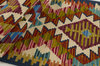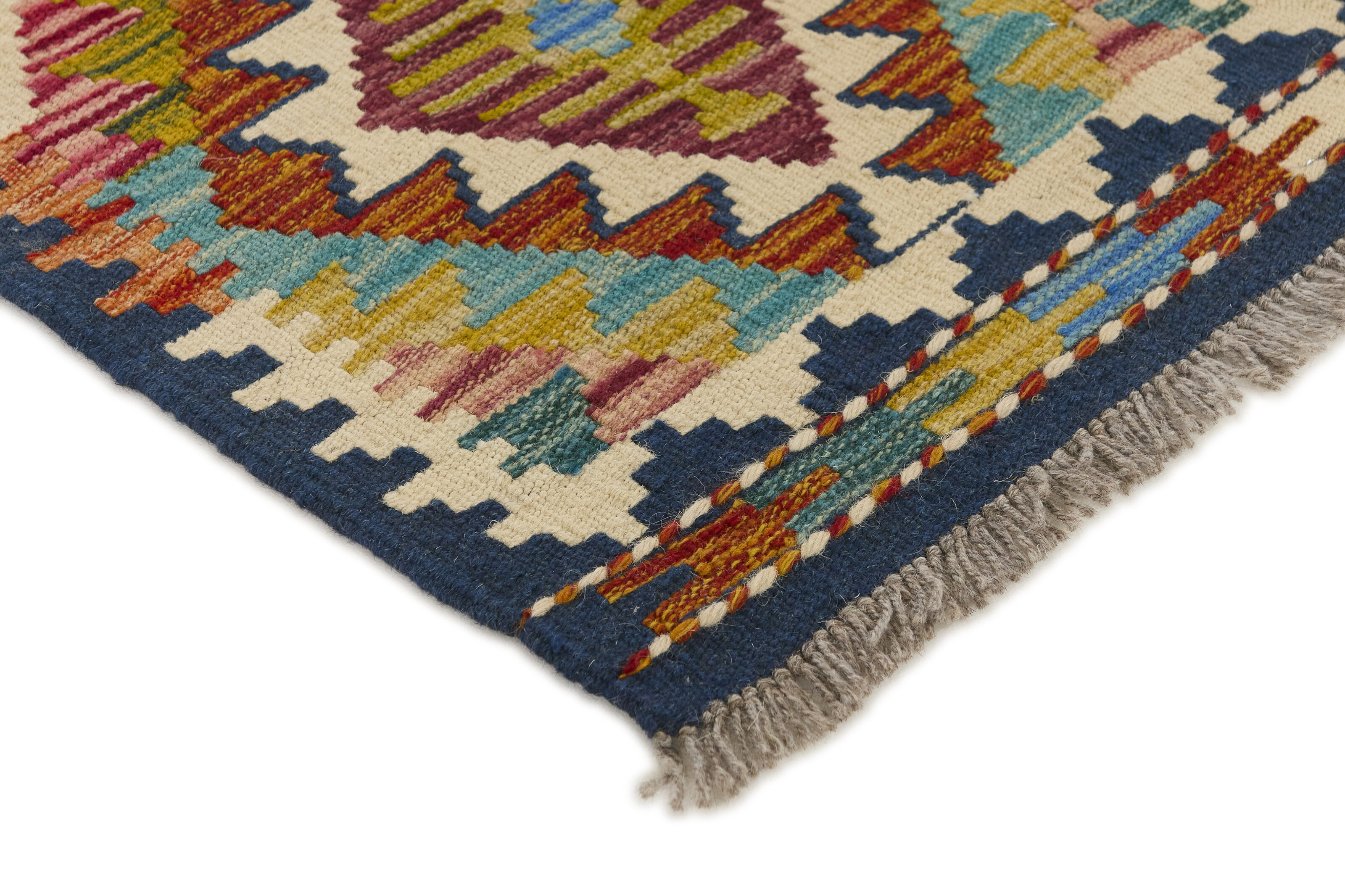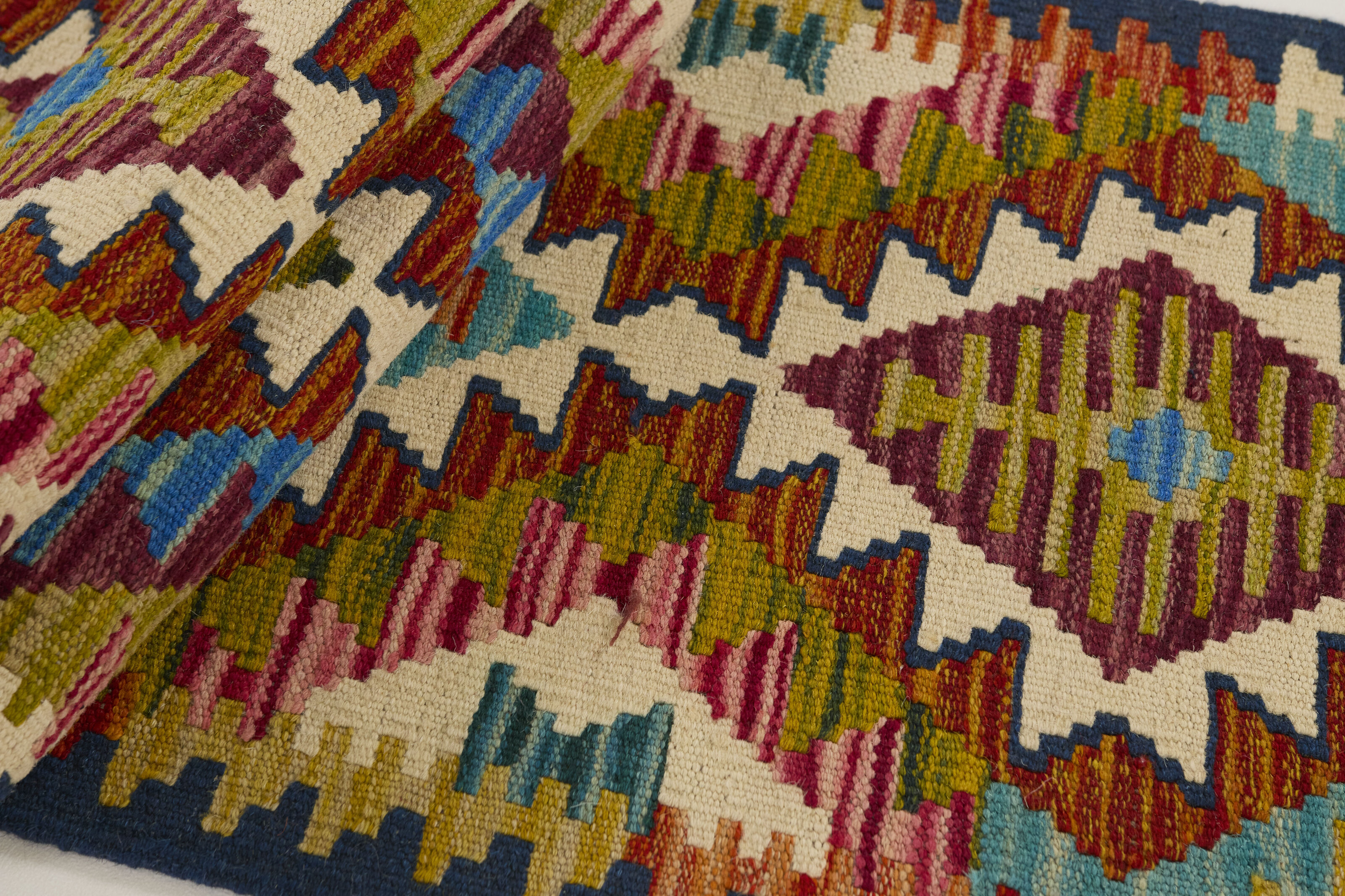 Afghan KelimItem no.: 1520675 Size: 45 cm x 148 cmAfghan Kelim rugs are hand woven by Turkmens in northern Afghanistan. Kelim is the name of a common Persian weave, but also of the technology used in the production. Kelims are primarily produced by nomads and are pile-less rugs, which are also used for bags, as wall decoration, or as curtains for tents. A natural colour scale with geometrical symbols and octagons is used.