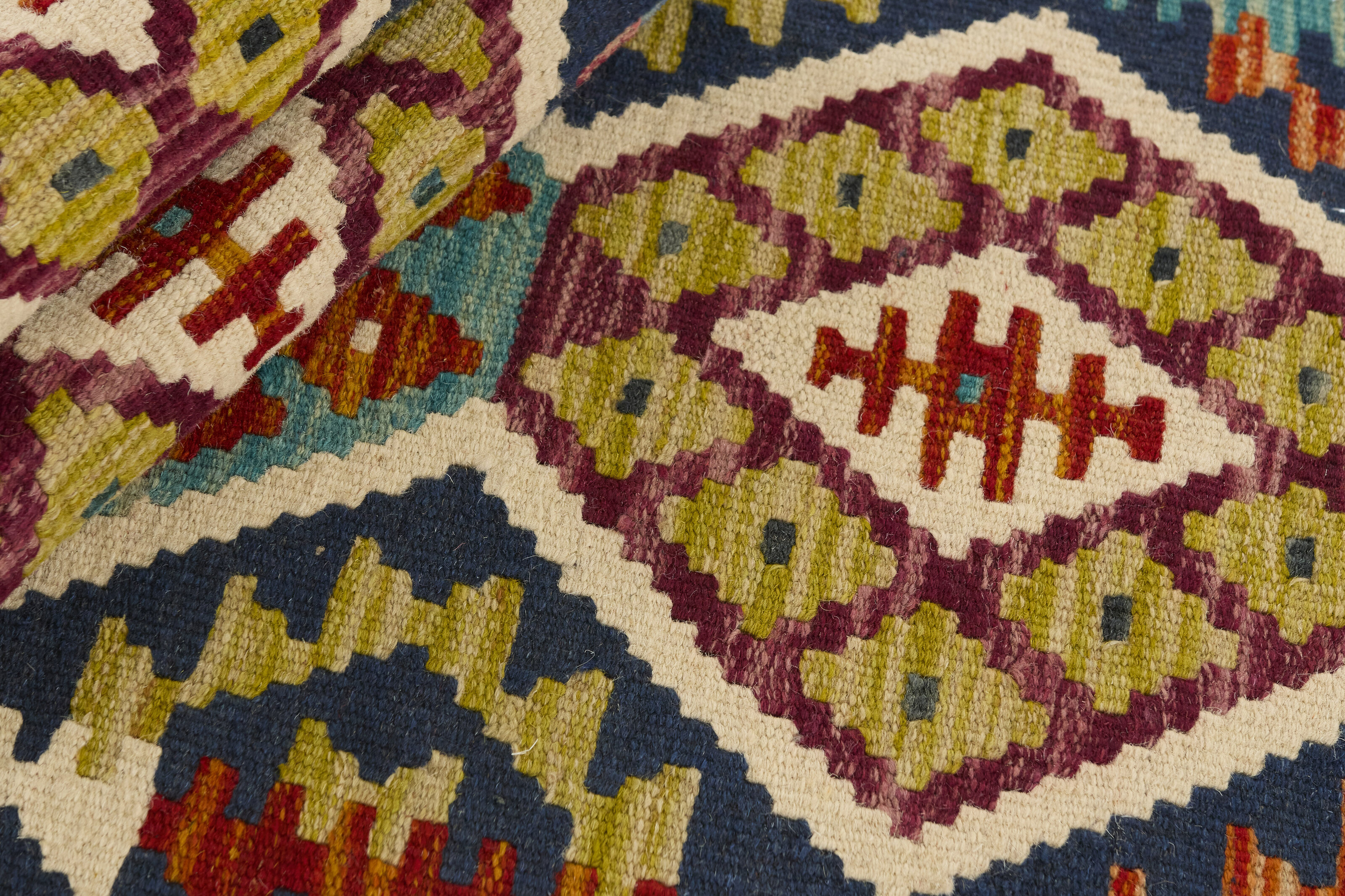 Afghan KelimItem no.: 1520680 Size: 43 cm x 149 cmAfghan Kelim rugs are hand woven by Turkmens in northern Afghanistan. Kelim is the name of a common Persian weave, but also of the technology used in the production. Kelims are primarily produced by nomads and are pile-less rugs, which are also used for bags, as wall decoration, or as curtains for tents. A natural colour scale with geometrical symbols and octagons is used.