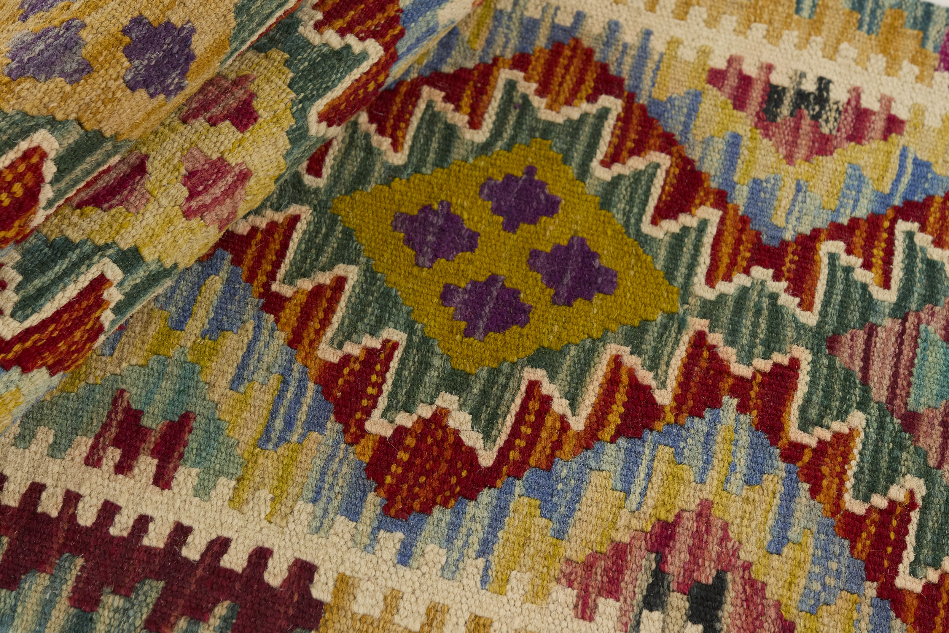 Afghan KelimItem no.: 1520682 Size: 44 cm x 147 cmAfghan Kelim rugs are hand woven by Turkmens in northern Afghanistan. Kelim is the name of a common Persian weave, but also of the technology used in the production. Kelims are primarily produced by nomads and are pile-less rugs, which are also used for bags, as wall decoration, or as curtains for tents. A natural colour scale with geometrical symbols and octagons is used.