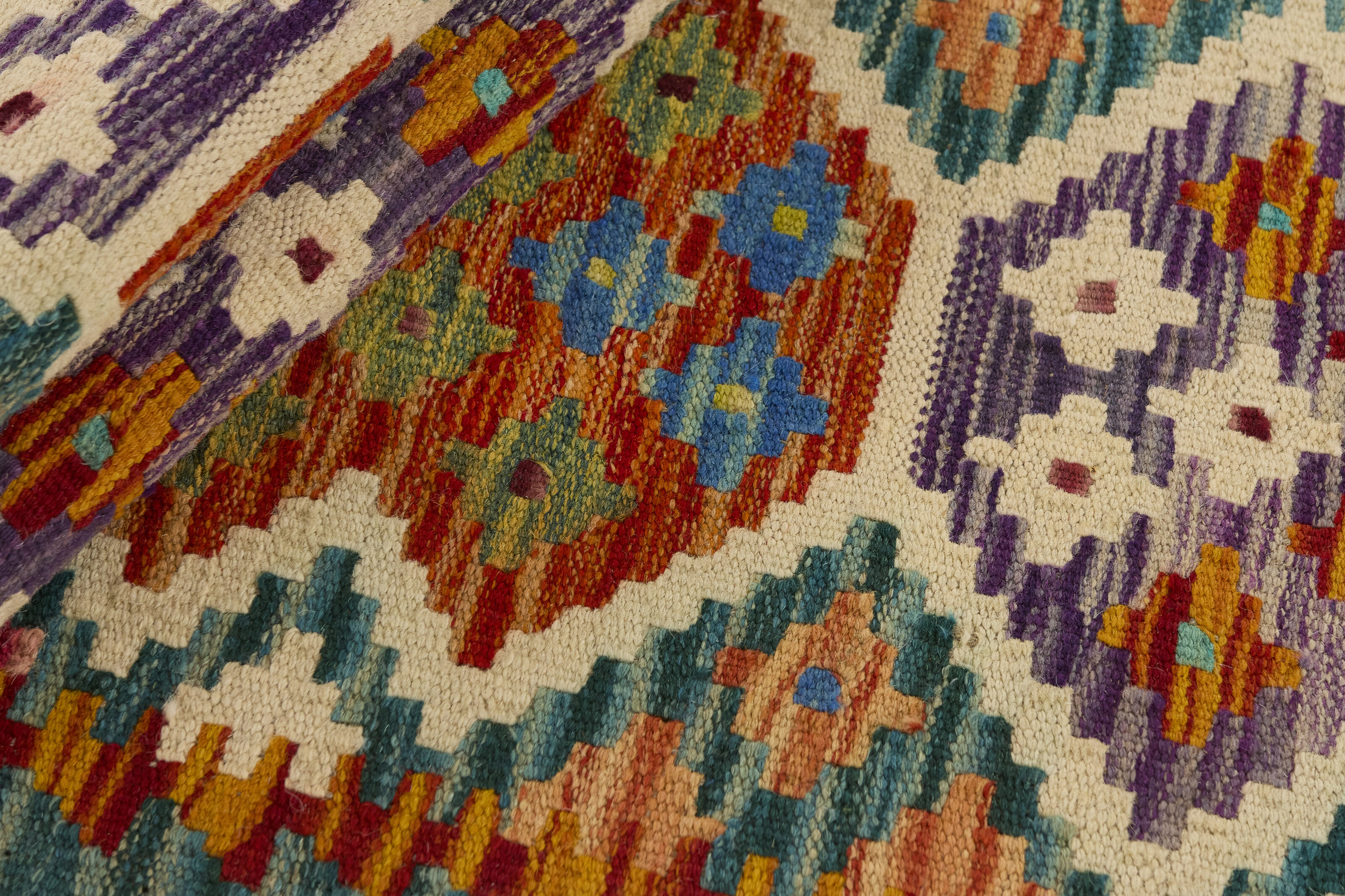 Afghan KelimItem no.: 1520685 Size: 46 cm x 150 cmAfghan Kelim rugs are hand woven by Turkmens in northern Afghanistan. Kelim is the name of a common Persian weave, but also of the technology used in the production. Kelims are primarily produced by nomads and are pile-less rugs, which are also used for bags, as wall decoration, or as curtains for tents. A natural colour scale with geometrical symbols and octagons is used.