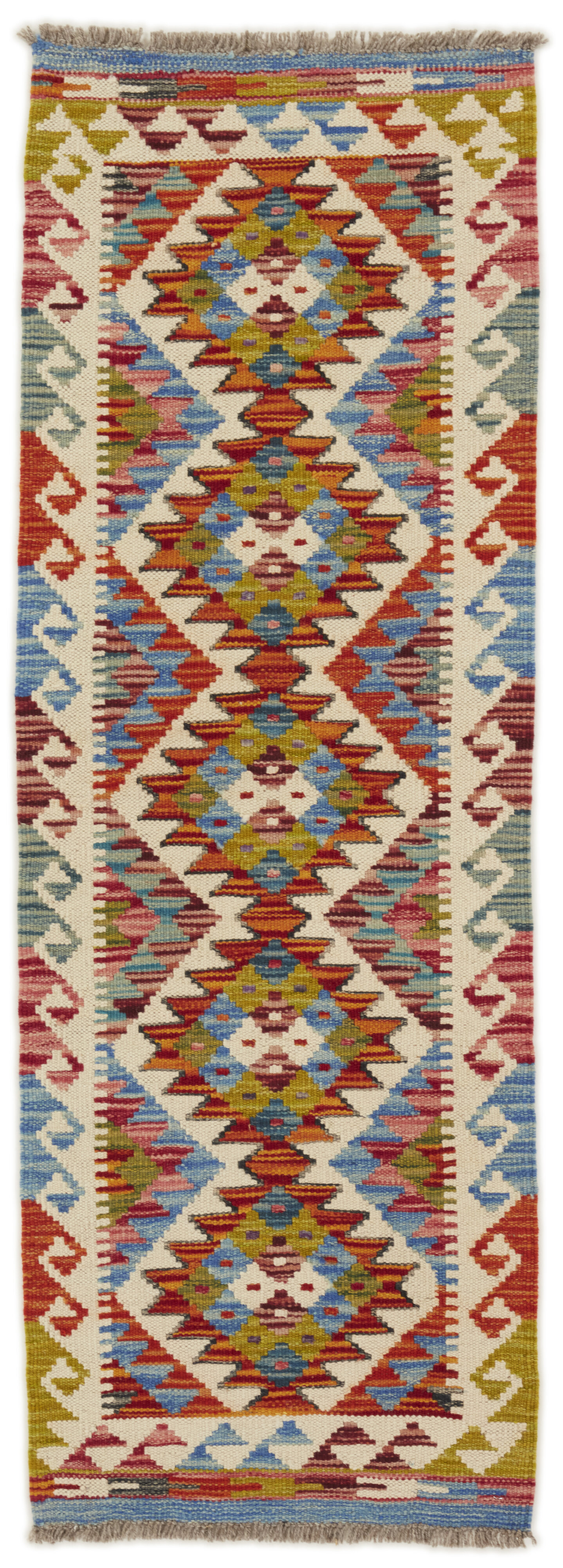 Afghan KelimItem no.: 1520856 Size: 50 cm x 143 cmAfghan Kelim rugs are hand woven by Turkmens in northern Afghanistan. Kelim is the name of a common Persian weave, but also of the technology used in the production. Kelims are primarily produced by nomads and are pile-less rugs, which are also used for bags, as wall decoration, or as curtains for tents. A natural colour scale with geometrical symbols and octagons is used.