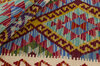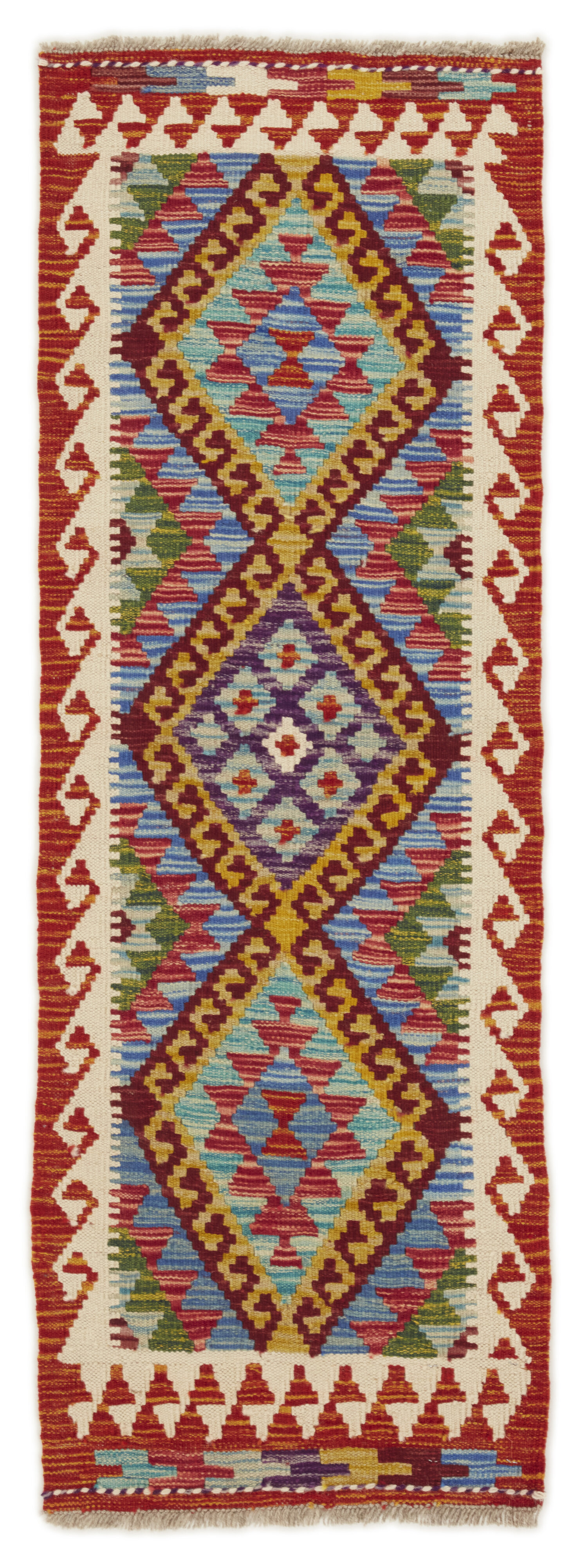 Afghan KelimItem no.: 1520859 Size: 52 cm x 145 cmAfghan Kelim rugs are hand woven by Turkmens in northern Afghanistan. Kelim is the name of a common Persian weave, but also of the technology used in the production. Kelims are primarily produced by nomads and are pile-less rugs, which are also used for bags, as wall decoration, or as curtains for tents. A natural colour scale with geometrical symbols and octagons is used.