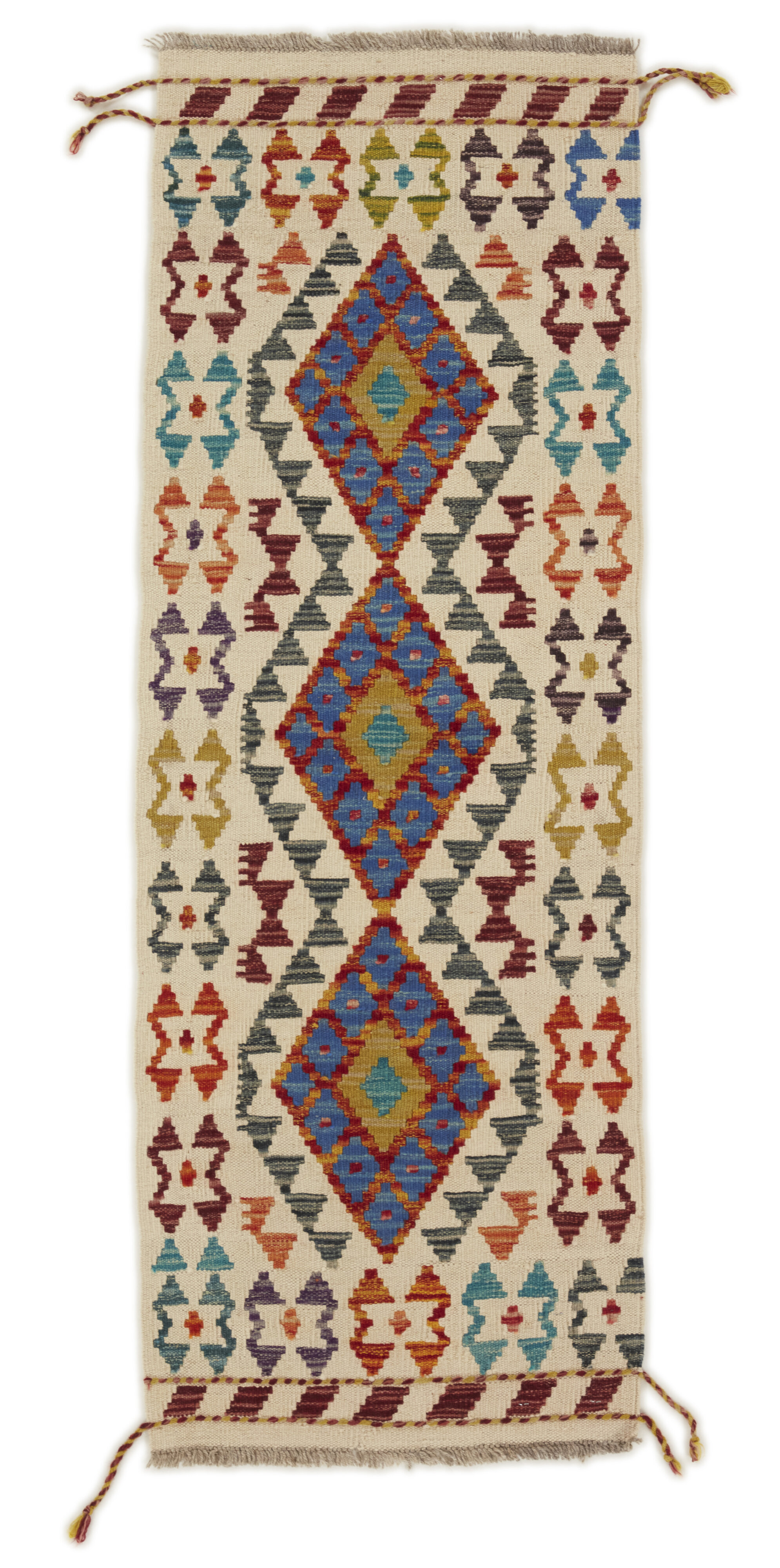Afghan KelimItem no.: 1520861 Size: 52 cm x 147 cmAfghan Kelim rugs are hand woven by Turkmens in northern Afghanistan. Kelim is the name of a common Persian weave, but also of the technology used in the production. Kelims are primarily produced by nomads and are pile-less rugs, which are also used for bags, as wall decoration, or as curtains for tents. A natural colour scale with geometrical symbols and octagons is used.