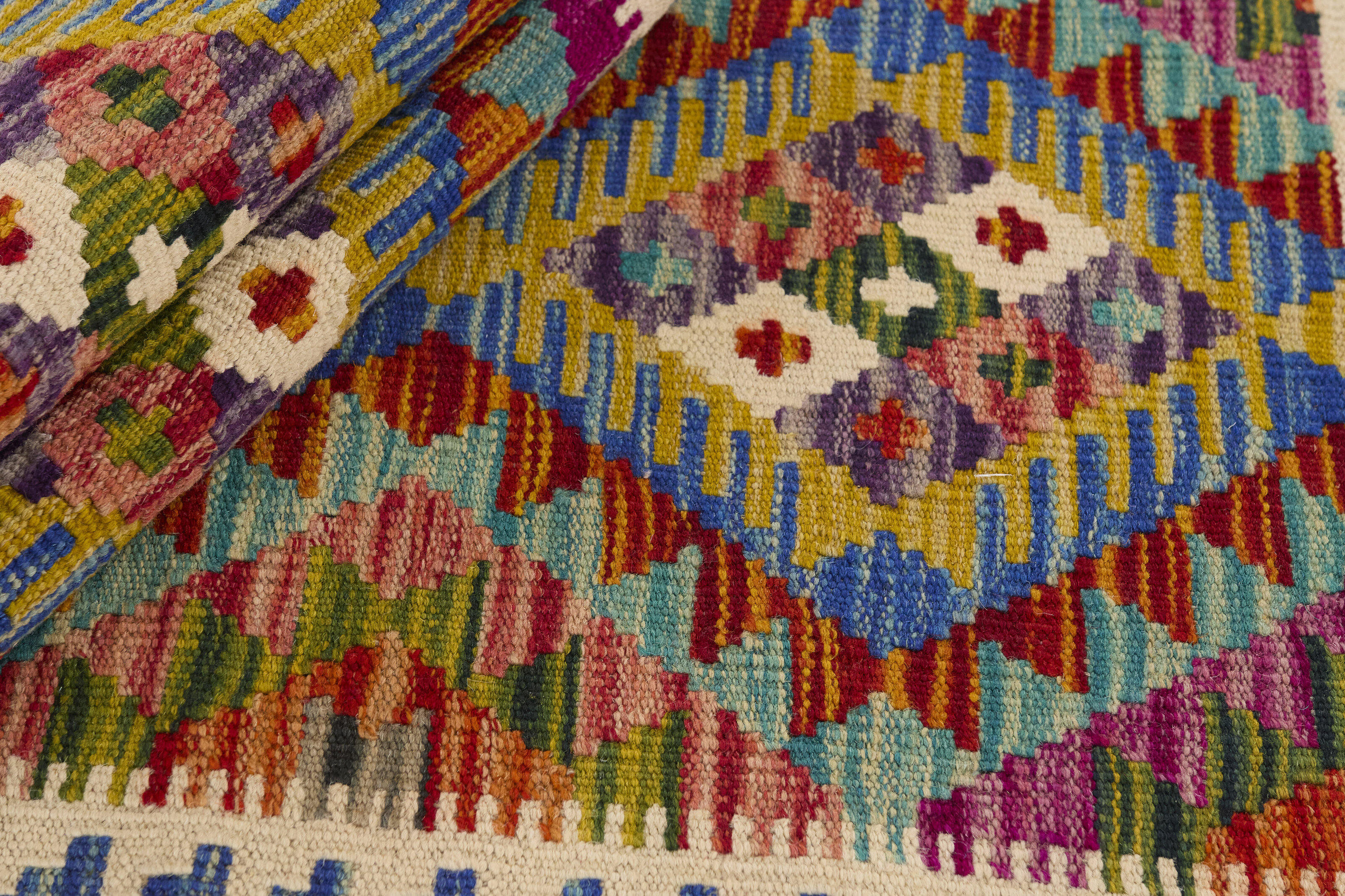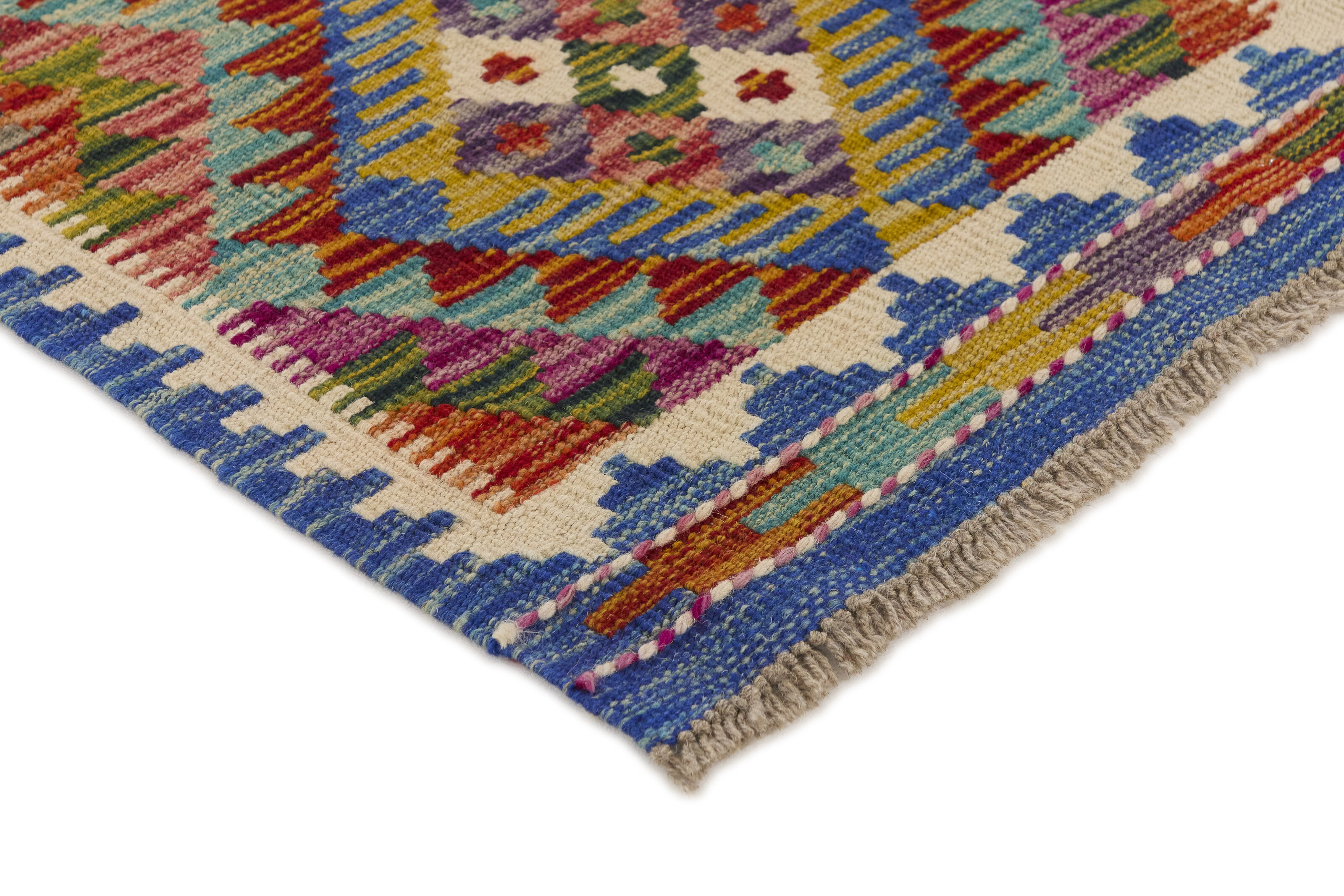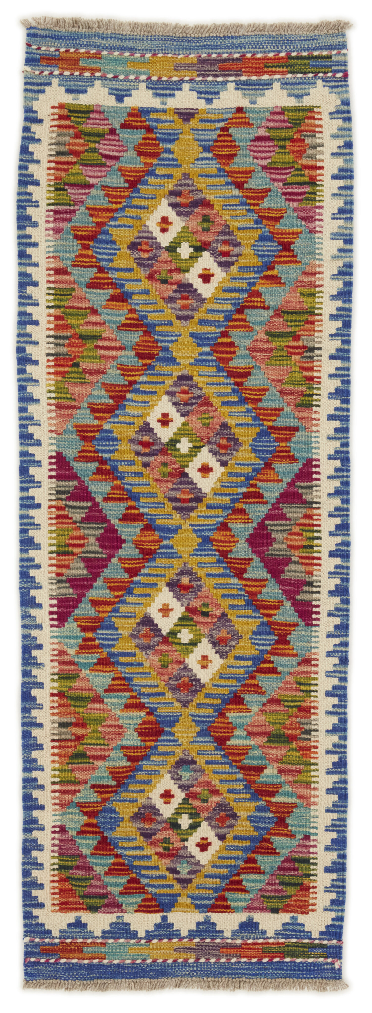 Afghan KelimItem no.: 1520862 Size: 51 cm x 147 cmAfghan Kelim rugs are hand woven by Turkmens in northern Afghanistan. Kelim is the name of a common Persian weave, but also of the technology used in the production. Kelims are primarily produced by nomads and are pile-less rugs, which are also used for bags, as wall decoration, or as curtains for tents. A natural colour scale with geometrical symbols and octagons is used.