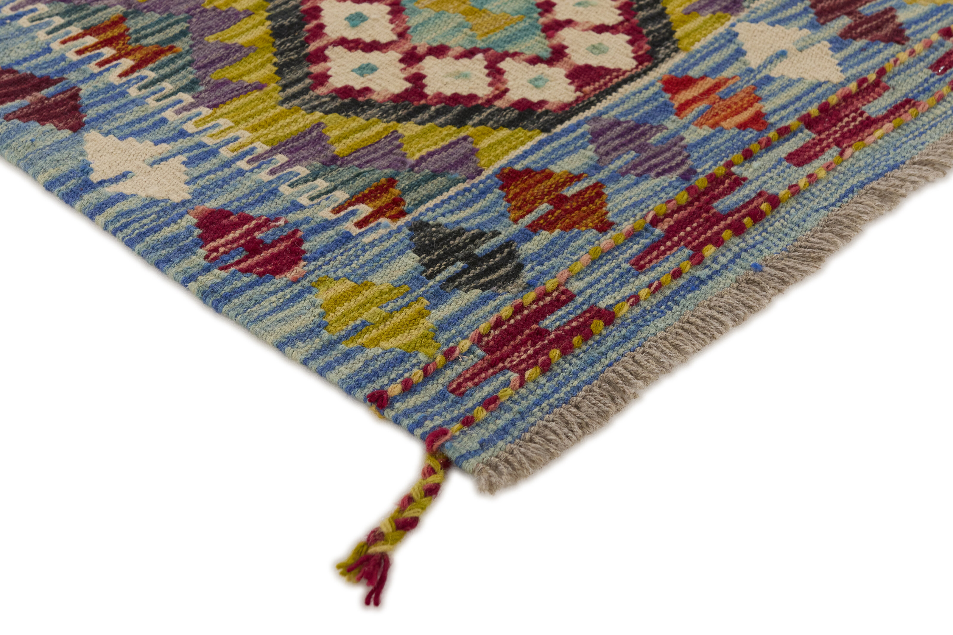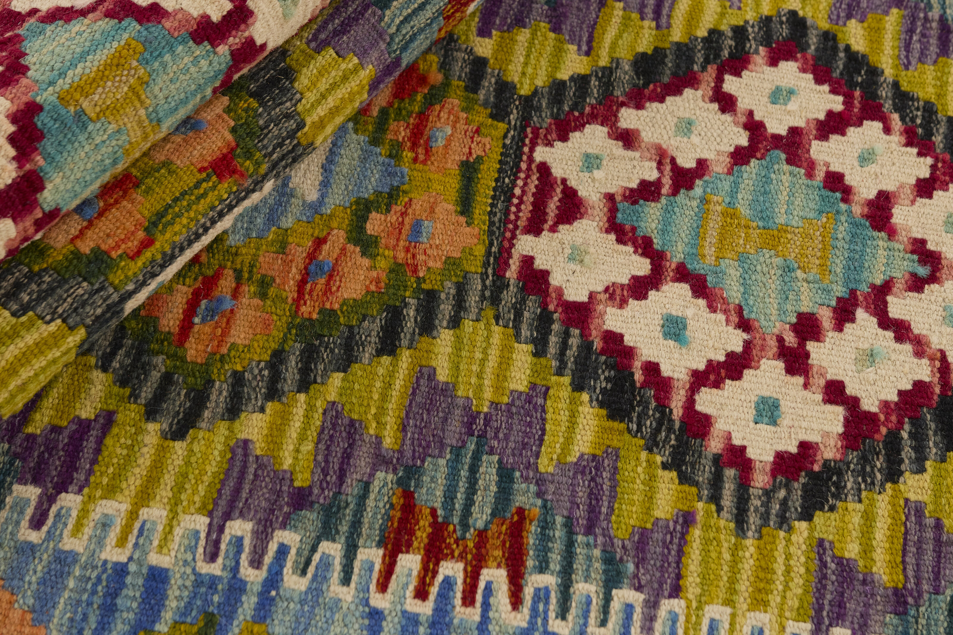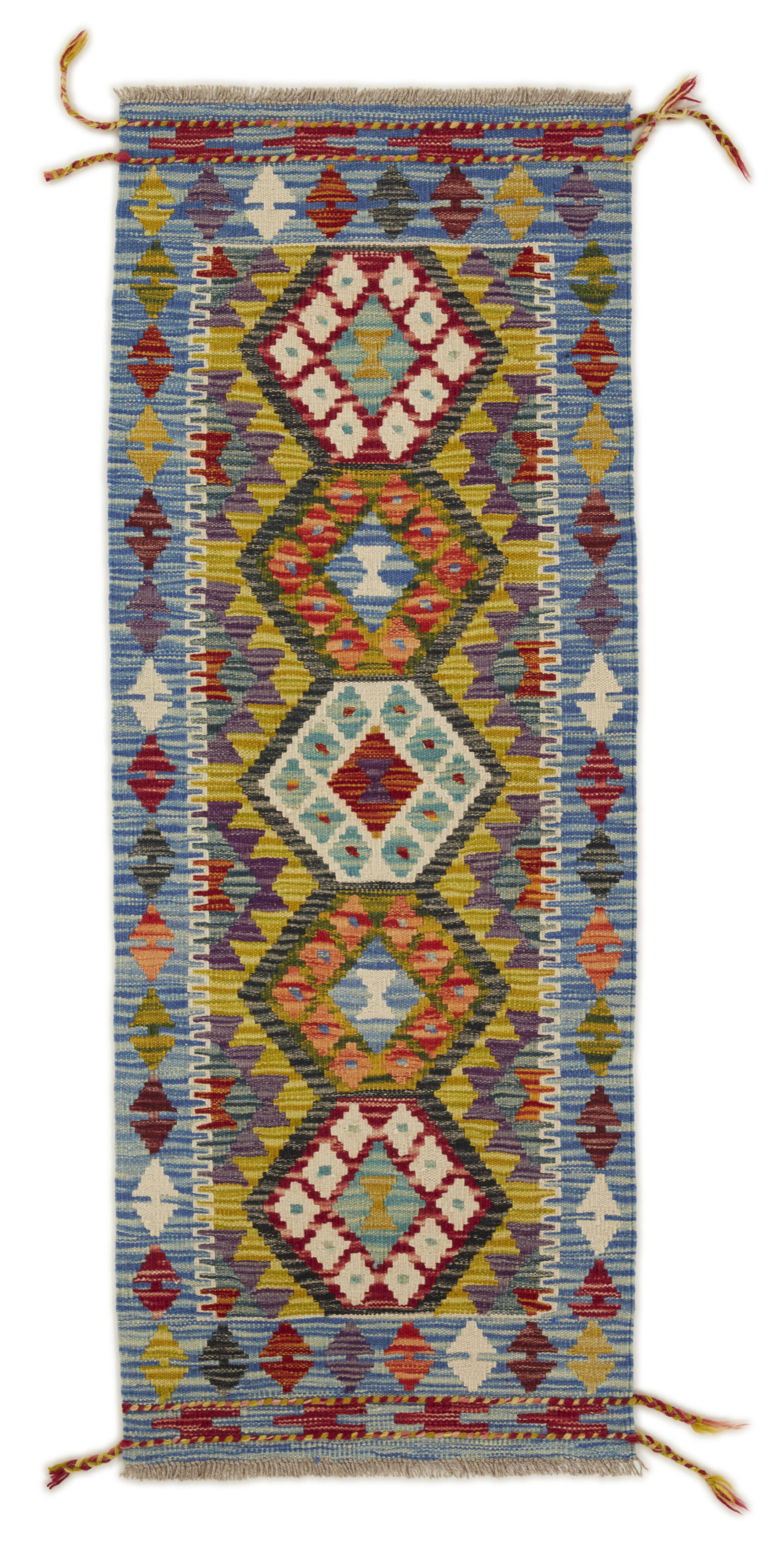 Afghan KelimItem no.: 1520873 Size: 57 cm x 149 cmAfghan Kelim rugs are hand woven by Turkmens in northern Afghanistan. Kelim is the name of a common Persian weave, but also of the technology used in the production. Kelims are primarily produced by nomads and are pile-less rugs, which are also used for bags, as wall decoration, or as curtains for tents. A natural colour scale with geometrical symbols and octagons is used.