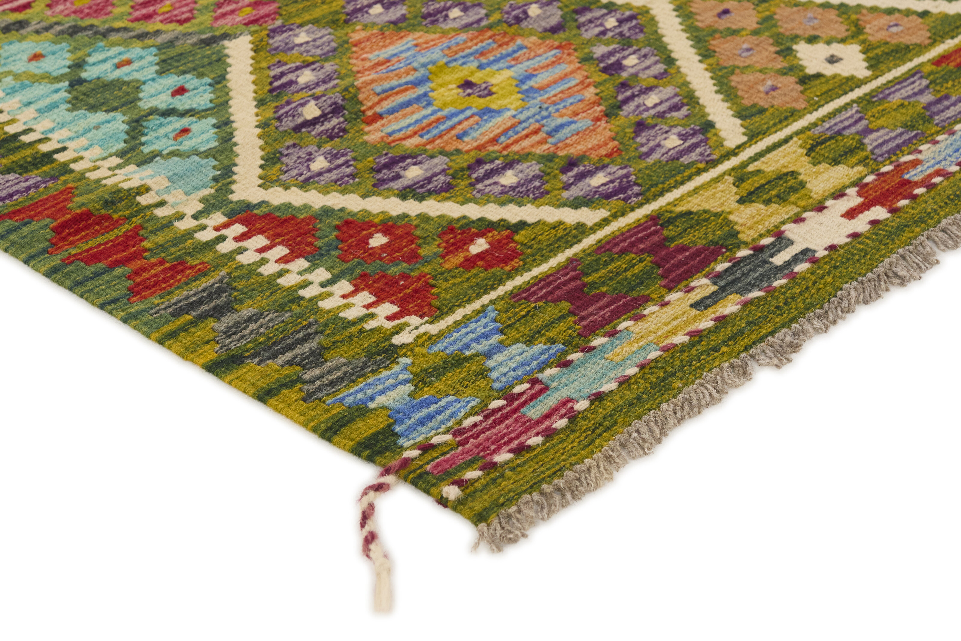 Afghan KelimItem no.: 1520878 Size: 106 cm x 150 cmAfghan Kelim rugs are hand woven by Turkmens in northern Afghanistan. Kelim is the name of a common Persian weave, but also of the technology used in the production. Kelims are primarily produced by nomads and are pile-less rugs, which are also used for bags, as wall decoration, or as curtains for tents. A natural colour scale with geometrical symbols and octagons is used.