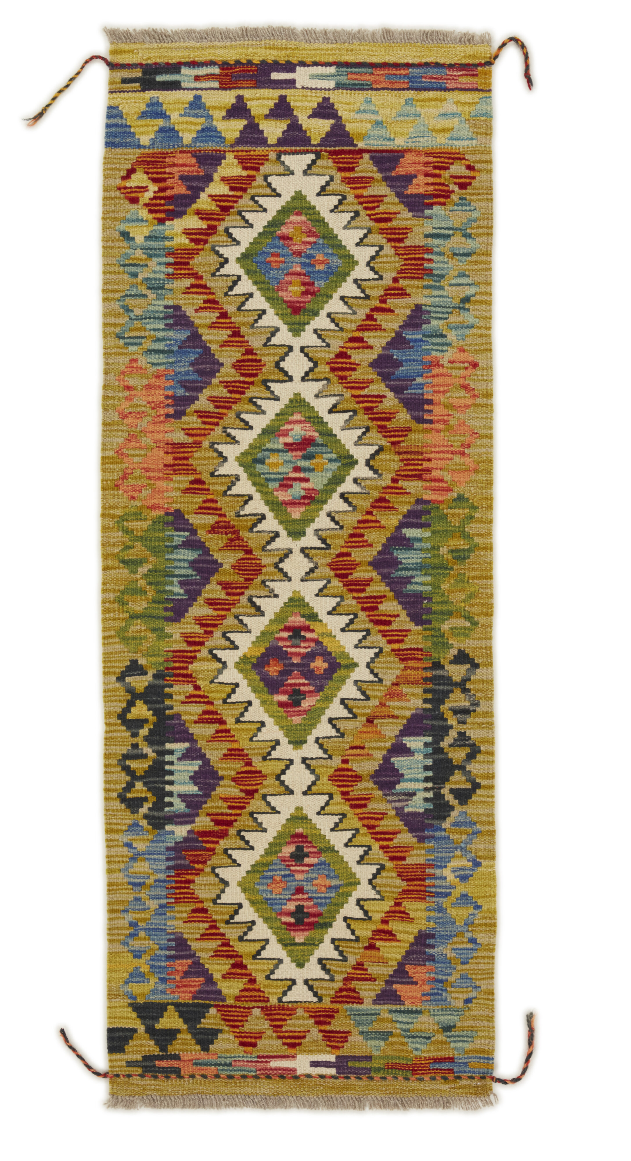 Afghan KelimItem no.: 1520882 Size: 56 cm x 151 cmAfghan Kelim rugs are hand woven by Turkmens in northern Afghanistan. Kelim is the name of a common Persian weave, but also of the technology used in the production. Kelims are primarily produced by nomads and are pile-less rugs, which are also used for bags, as wall decoration, or as curtains for tents. A natural colour scale with geometrical symbols and octagons is used.
