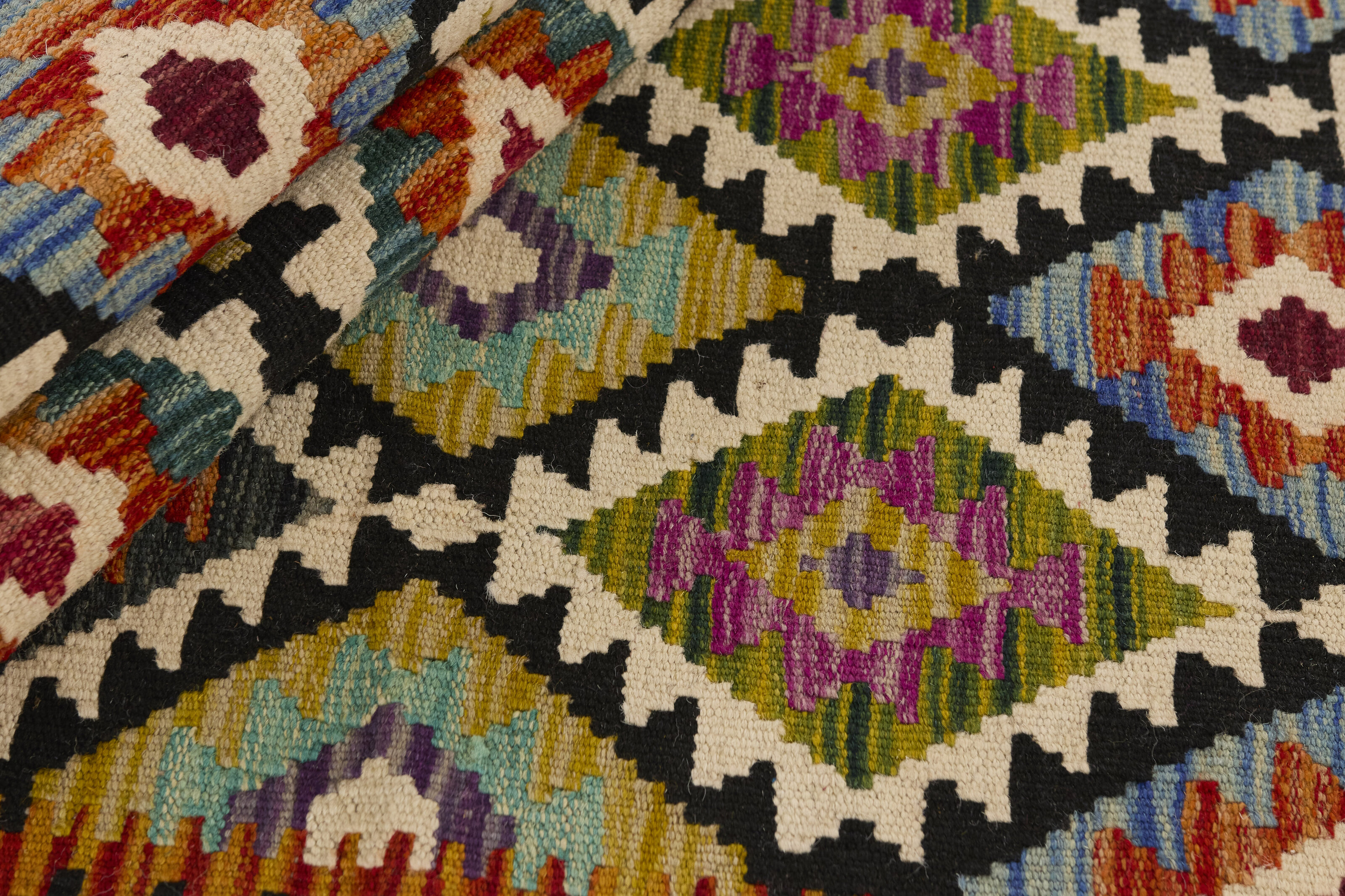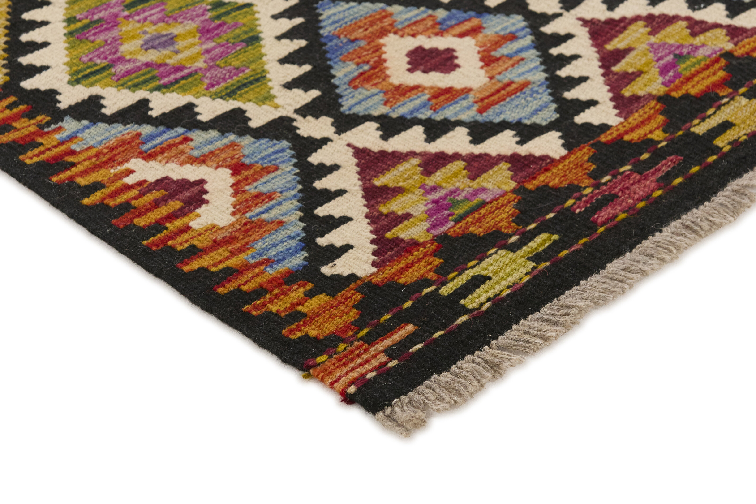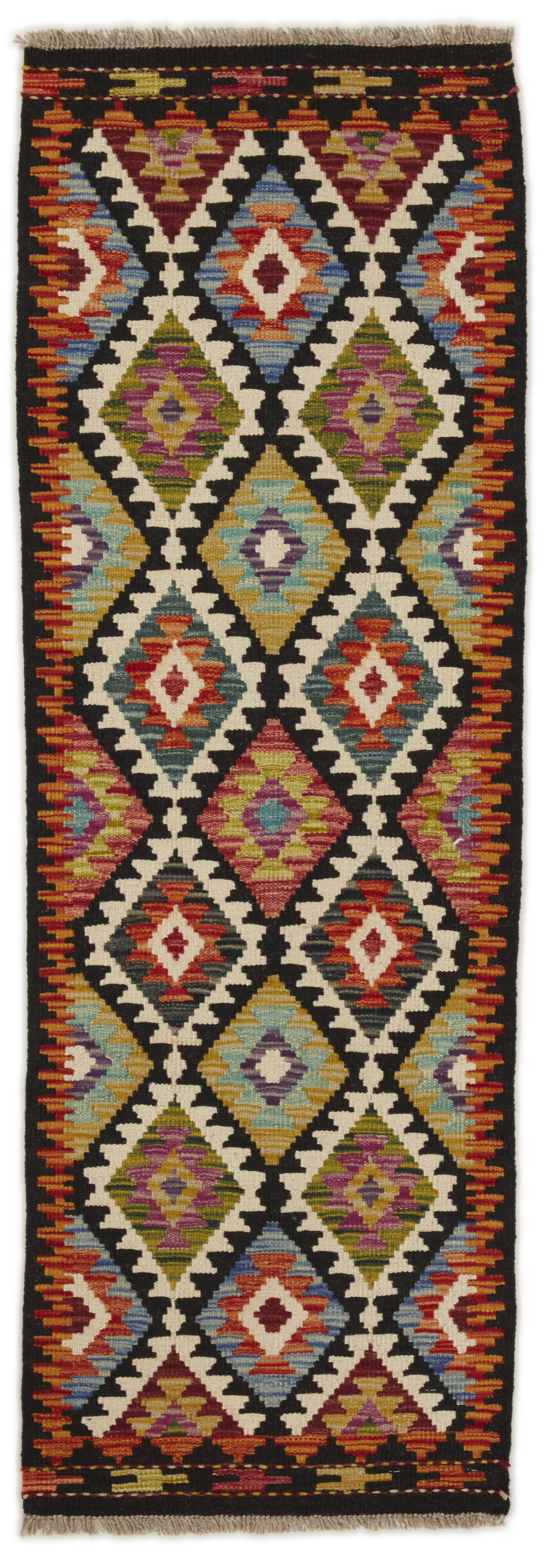 Afghan KelimItem no.: 1520891 Size: 54 cm x 154 cmAfghan Kelim rugs are hand woven by Turkmens in northern Afghanistan. Kelim is the name of a common Persian weave, but also of the technology used in the production. Kelims are primarily produced by nomads and are pile-less rugs, which are also used for bags, as wall decoration, or as curtains for tents. A natural colour scale with geometrical symbols and octagons is used.