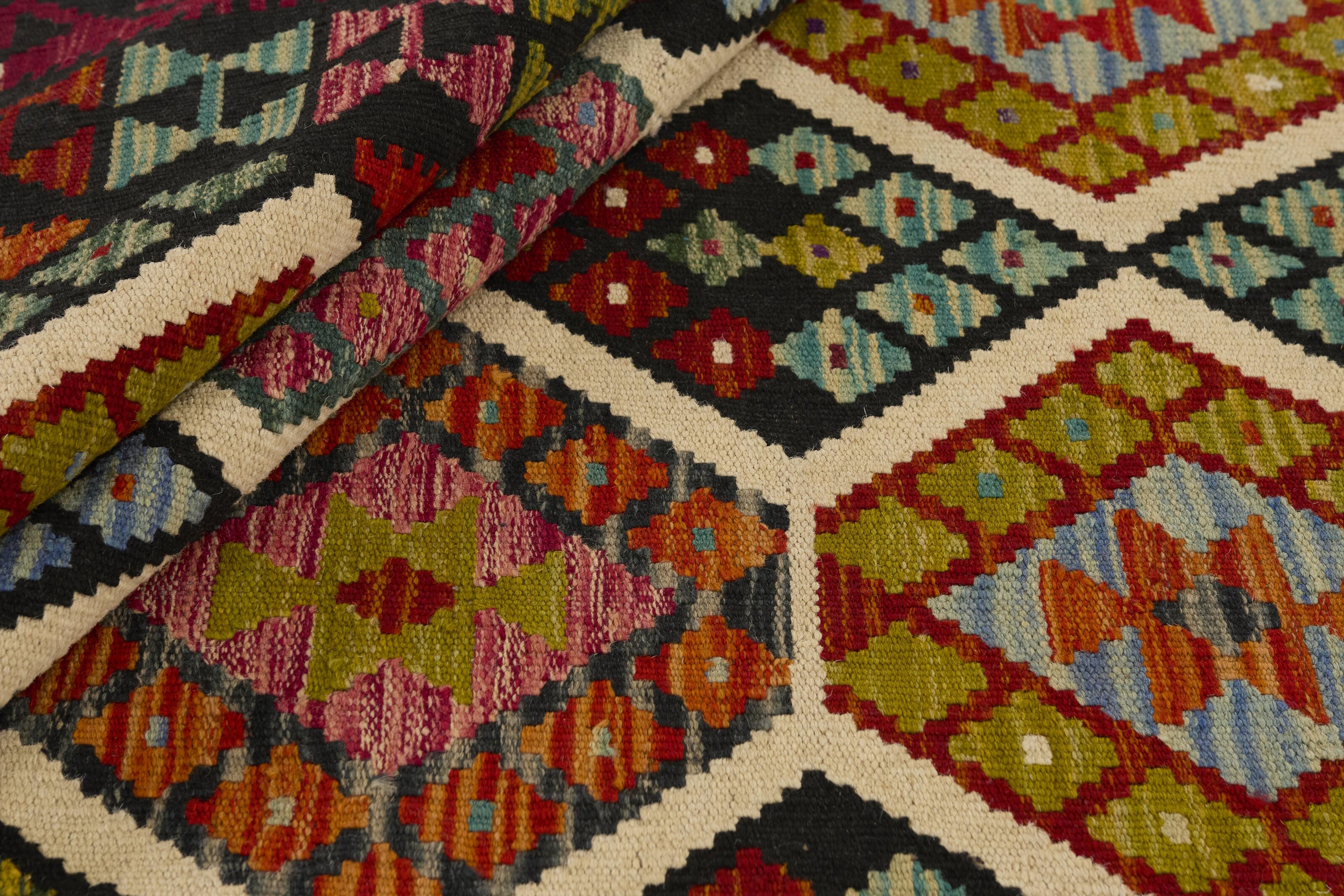 Afghan KelimItem no.: 1520903 Size: 122 cm x 174 cmAfghan Kelim rugs are hand woven by Turkmens in northern Afghanistan. Kelim is the name of a common Persian weave, but also of the technology used in the production. Kelims are primarily produced by nomads and are pile-less rugs, which are also used for bags, as wall decoration, or as curtains for tents. A natural colour scale with geometrical symbols and octagons is used.
