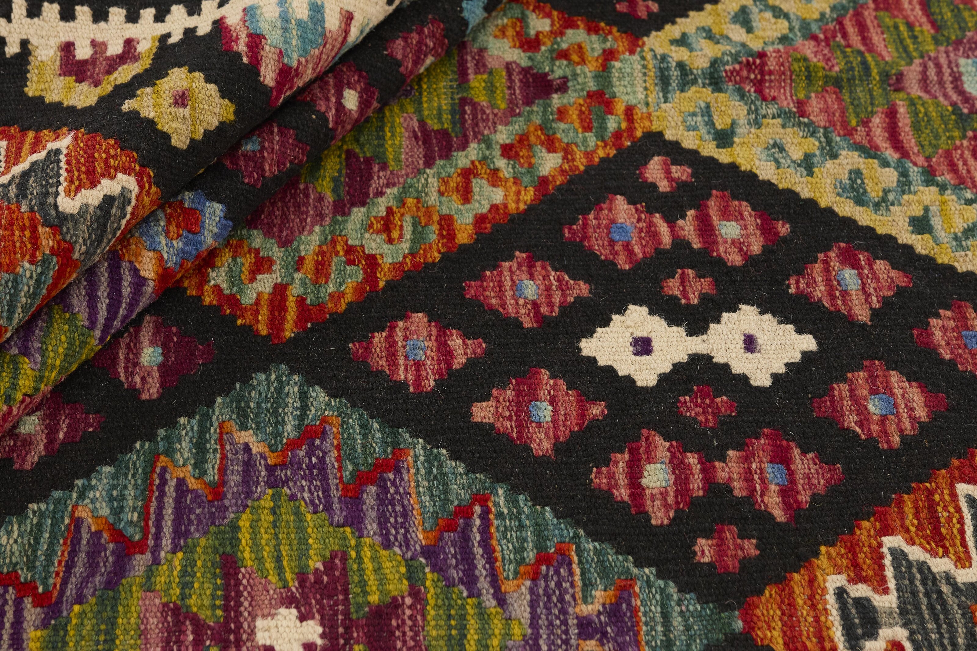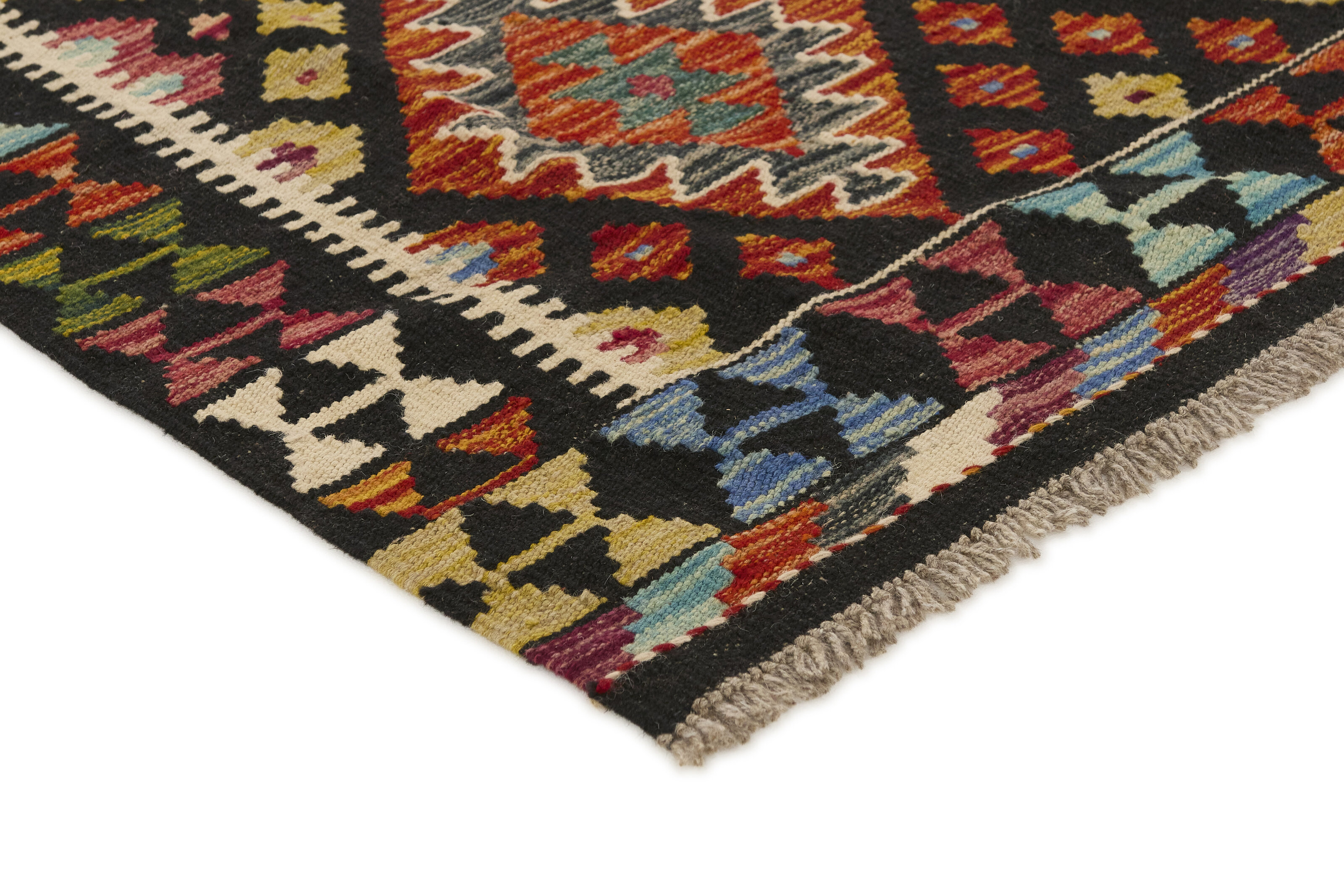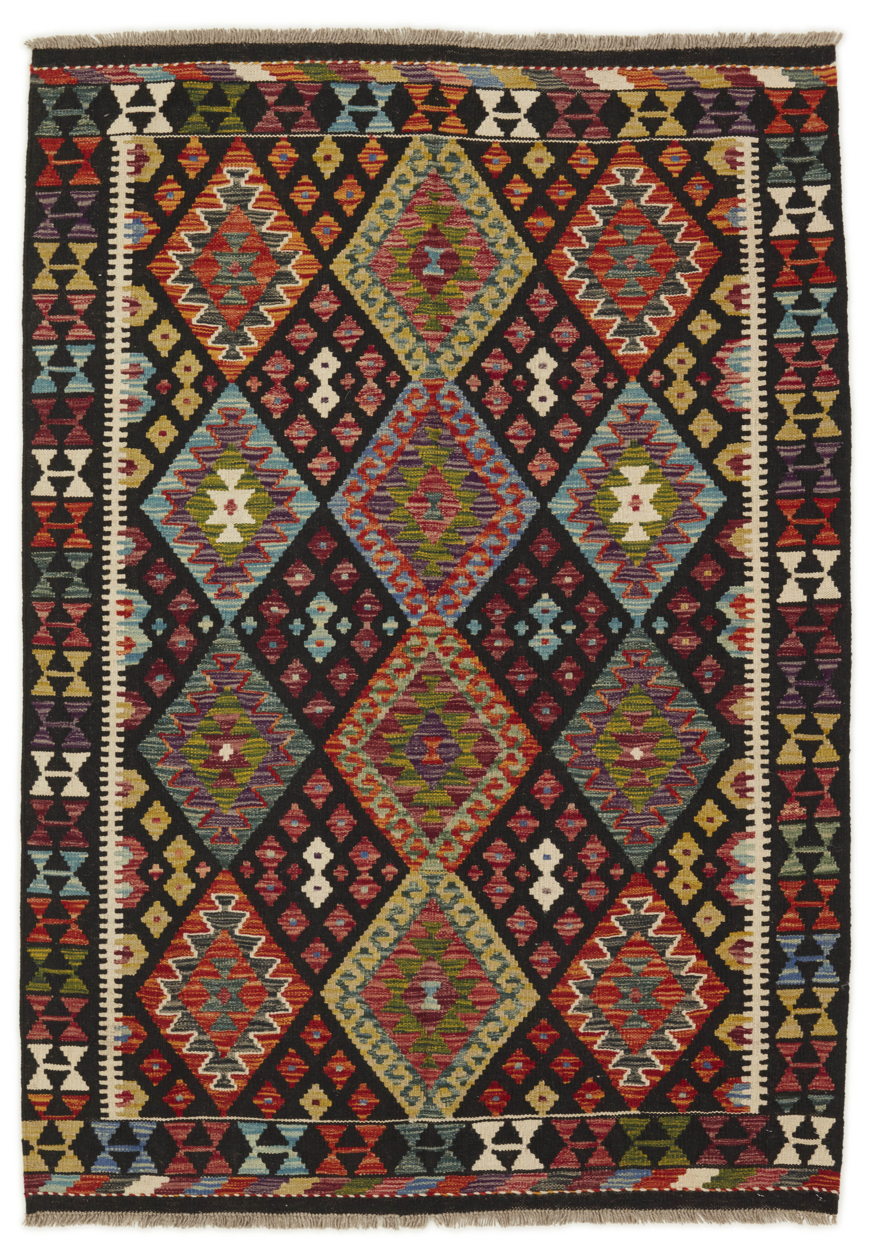 Afghan KelimItem no.: 1520911 Size: 131 cm x 186 cmAfghan Kelim rugs are hand woven by Turkmens in northern Afghanistan. Kelim is the name of a common Persian weave, but also of the technology used in the production. Kelims are primarily produced by nomads and are pile-less rugs, which are also used for bags, as wall decoration, or as curtains for tents. A natural colour scale with geometrical symbols and octagons is used.