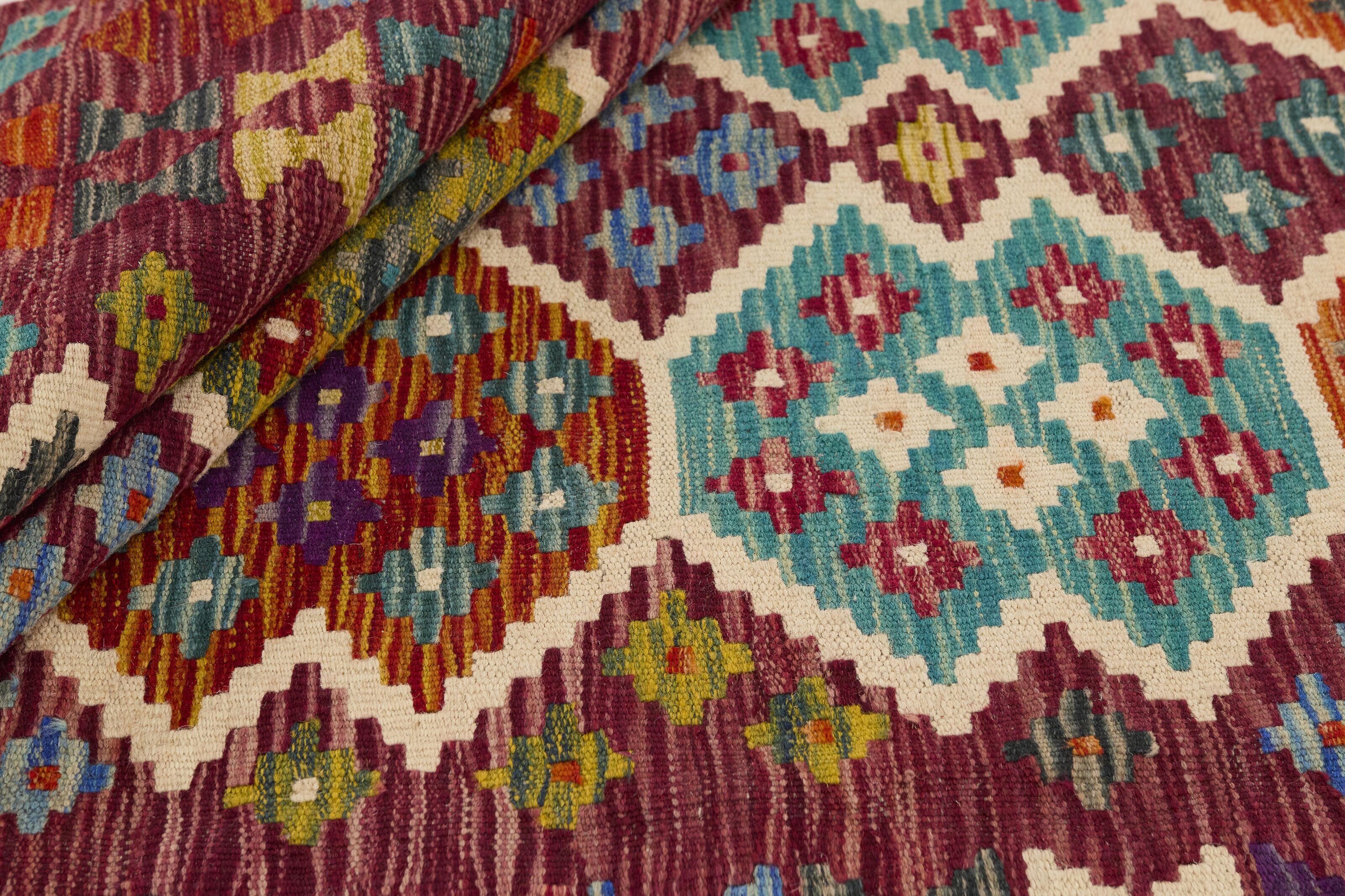Afghan KelimItem no.: 1520929 Size: 123 cm x 197 cmAfghan Kelim rugs are hand woven by Turkmens in northern Afghanistan. Kelim is the name of a common Persian weave, but also of the technology used in the production. Kelims are primarily produced by nomads and are pile-less rugs, which are also used for bags, as wall decoration, or as curtains for tents. A natural colour scale with geometrical symbols and octagons is used.