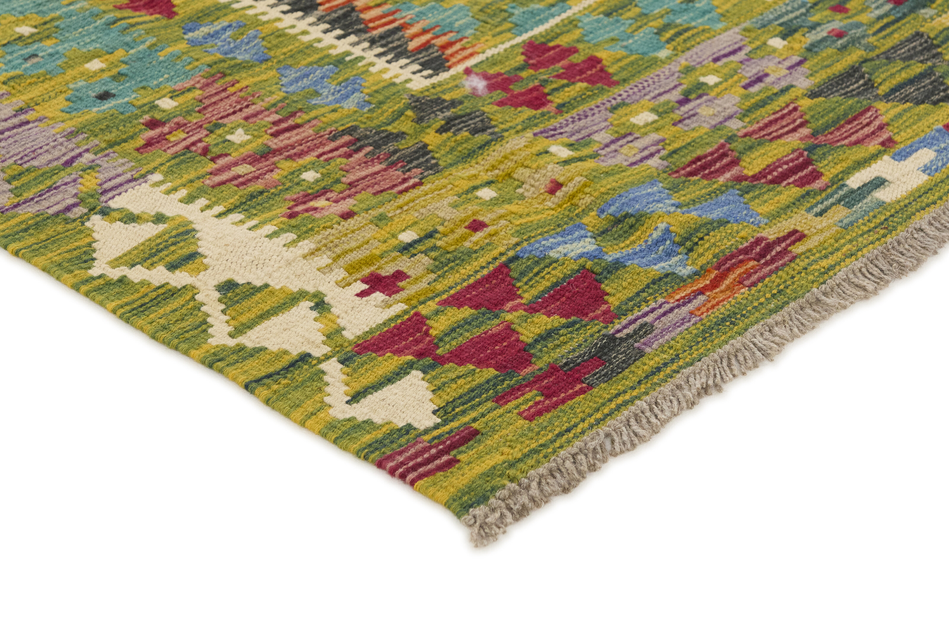 Afghan KelimItem no.: 1520934 Size: 133 cm x 202 cmAfghan Kelim rugs are hand woven by Turkmens in northern Afghanistan. Kelim is the name of a common Persian weave, but also of the technology used in the production. Kelims are primarily produced by nomads and are pile-less rugs, which are also used for bags, as wall decoration, or as curtains for tents. A natural colour scale with geometrical symbols and octagons is used.