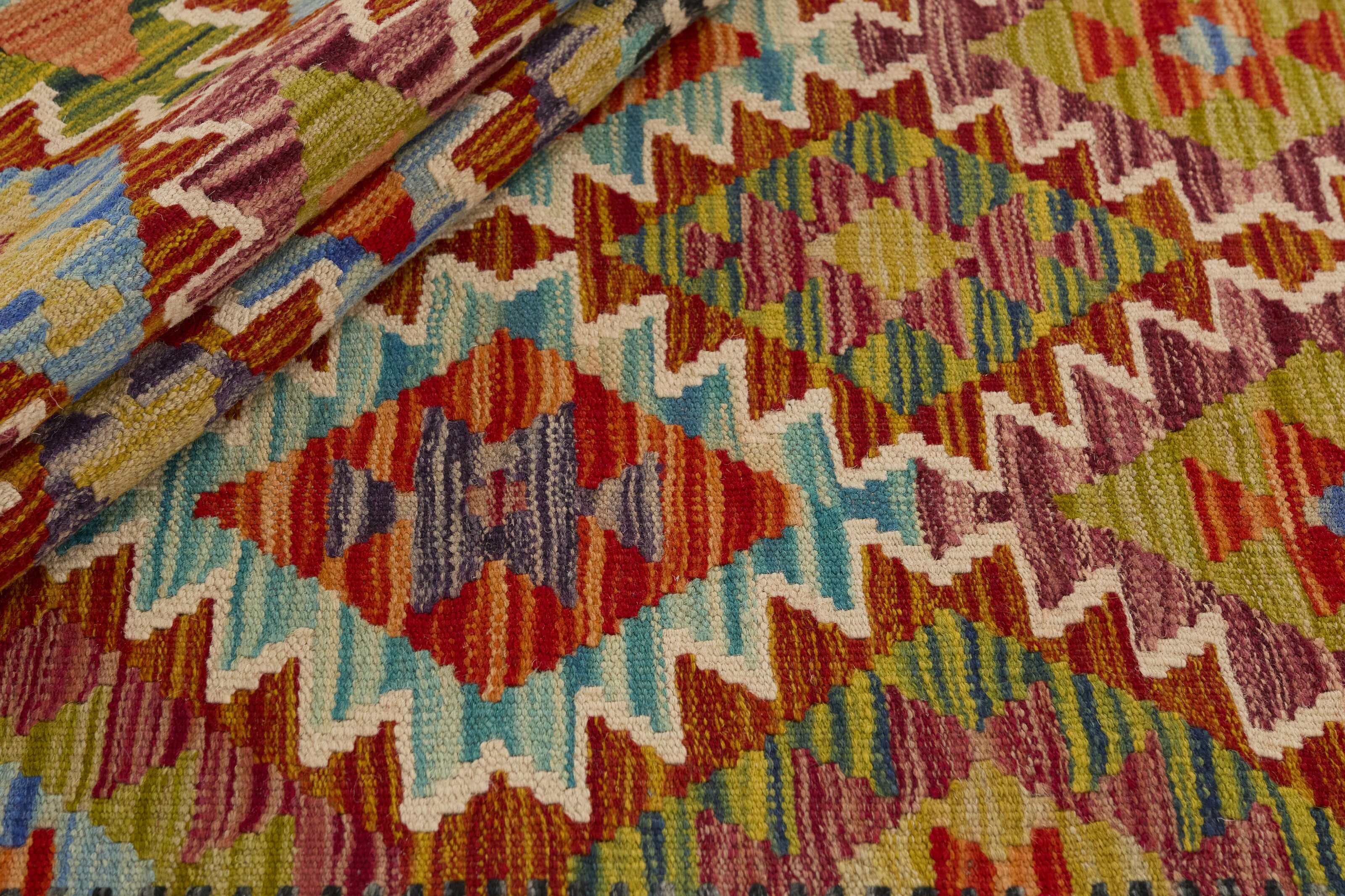 Afghan KelimItem no.: 1520936 Size: 75 cm x 233 cmAfghan Kelim rugs are hand woven by Turkmens in northern Afghanistan. Kelim is the name of a common Persian weave, but also of the technology used in the production. Kelims are primarily produced by nomads and are pile-less rugs, which are also used for bags, as wall decoration, or as curtains for tents. A natural colour scale with geometrical symbols and octagons is used.