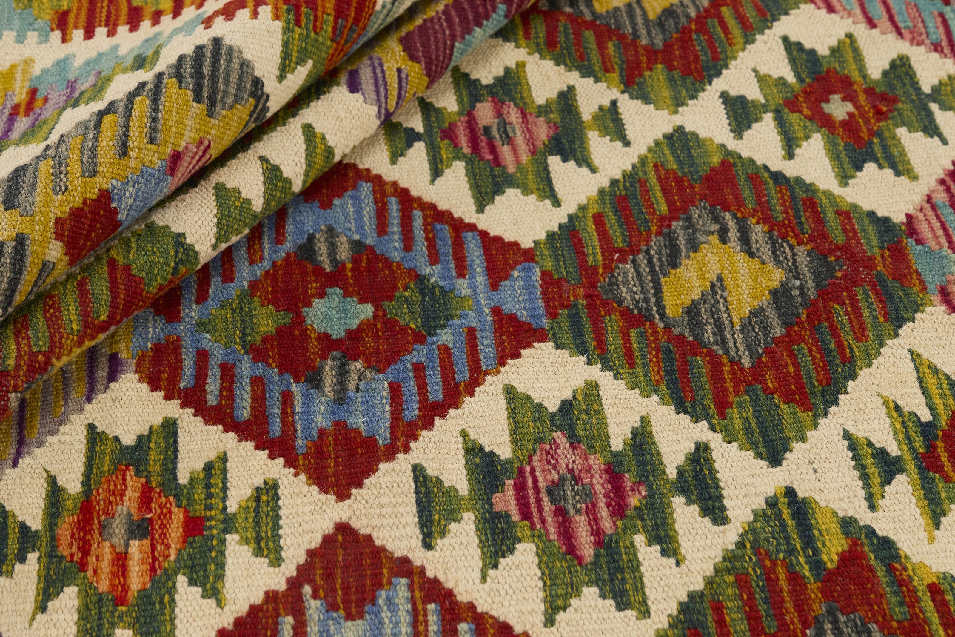 Afghan KelimItem no.: 1520955 Size: 174 cm x 246 cmAfghan Kelim rugs are hand woven by Turkmens in northern Afghanistan. Kelim is the name of a common Persian weave, but also of the technology used in the production. Kelims are primarily produced by nomads and are pile-less rugs, which are also used for bags, as wall decoration, or as curtains for tents. A natural colour scale with geometrical symbols and octagons is used.